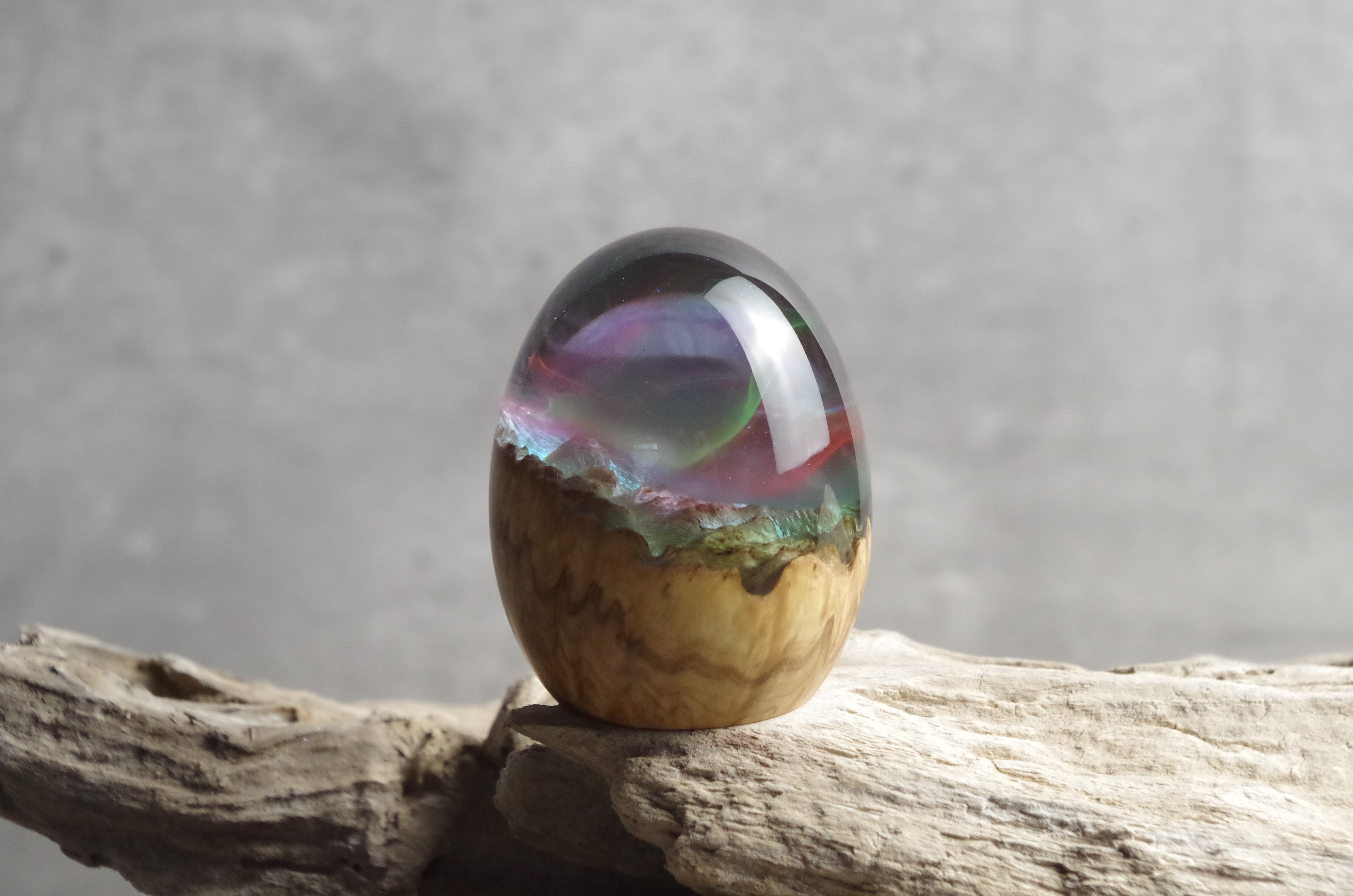 高透明、高強度の2液性のエポキシ樹脂を極限まで磨き上げた卵形オブジェ(ペーパーウェイト)になります。