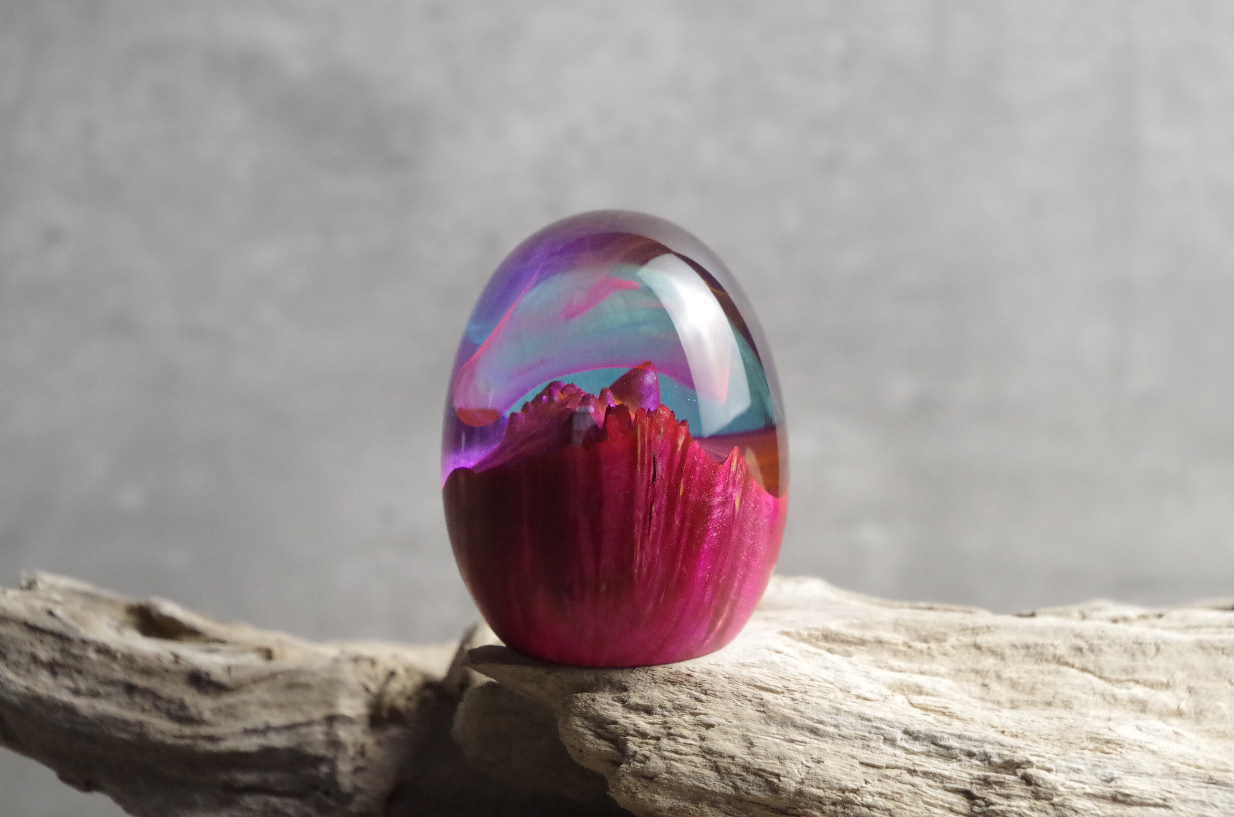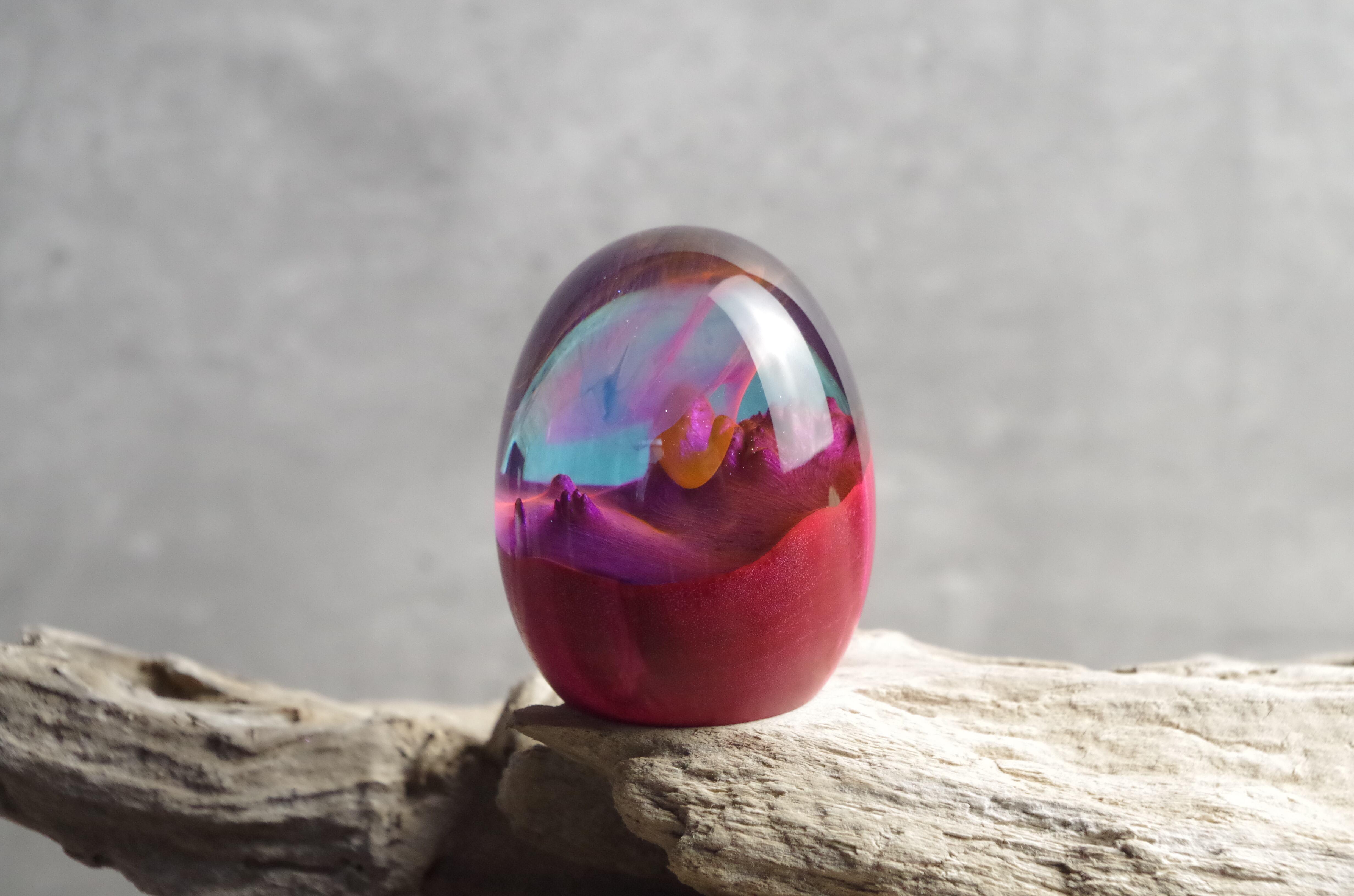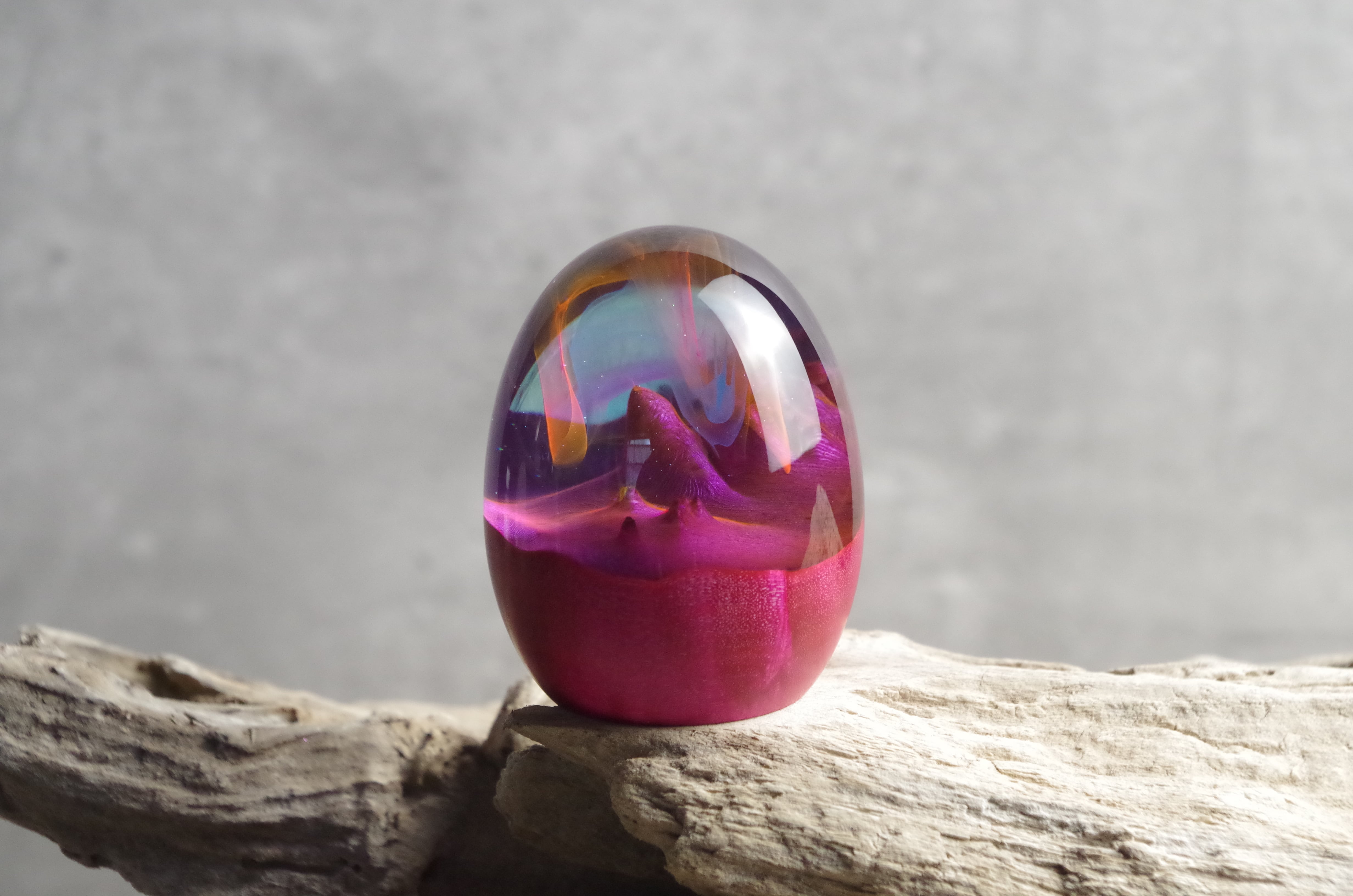 高透明、高強度の2液性のエポキシ樹脂を極限まで磨き上げた卵形オブジェ(ペーパーウェイト)になります。