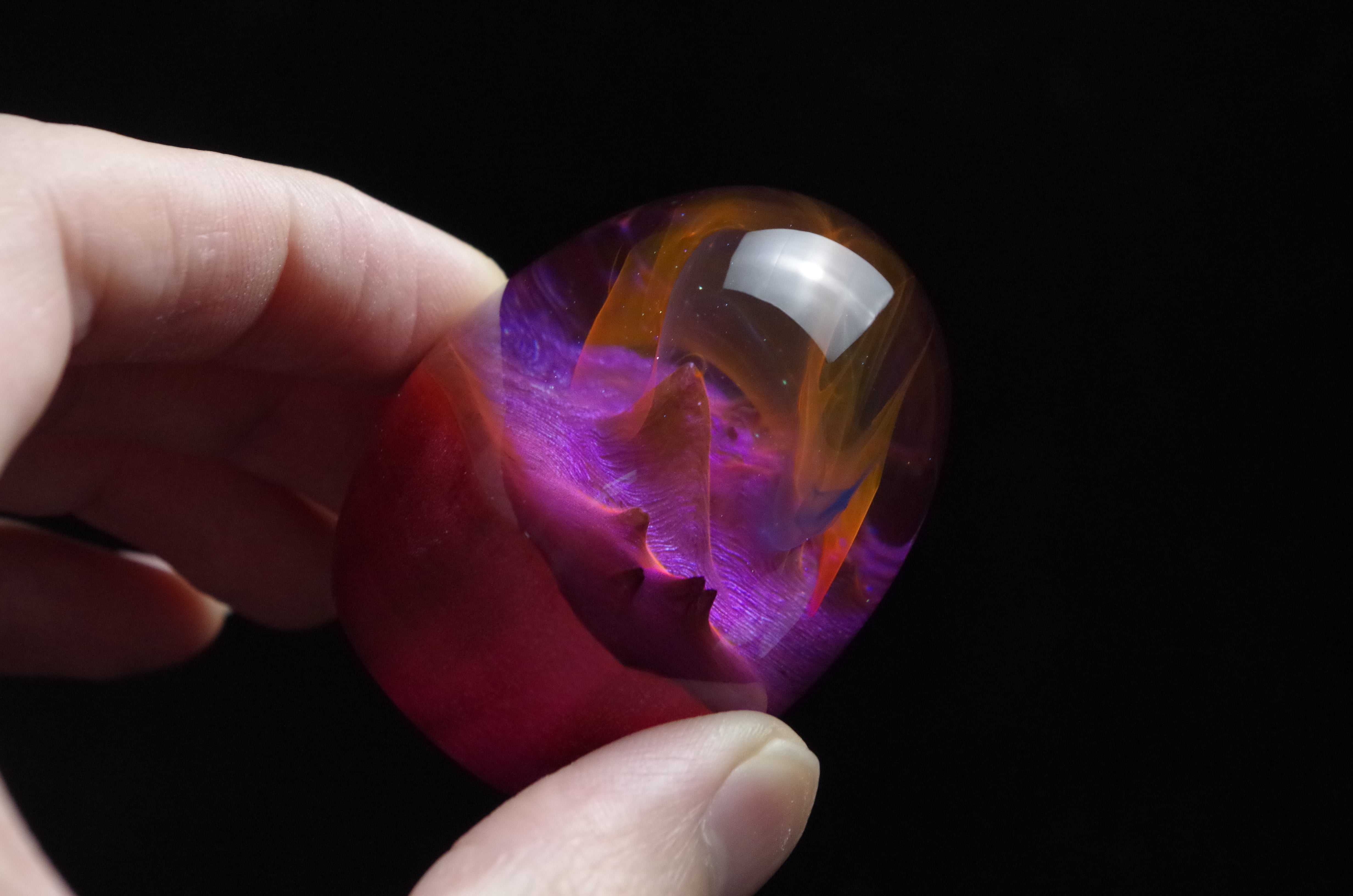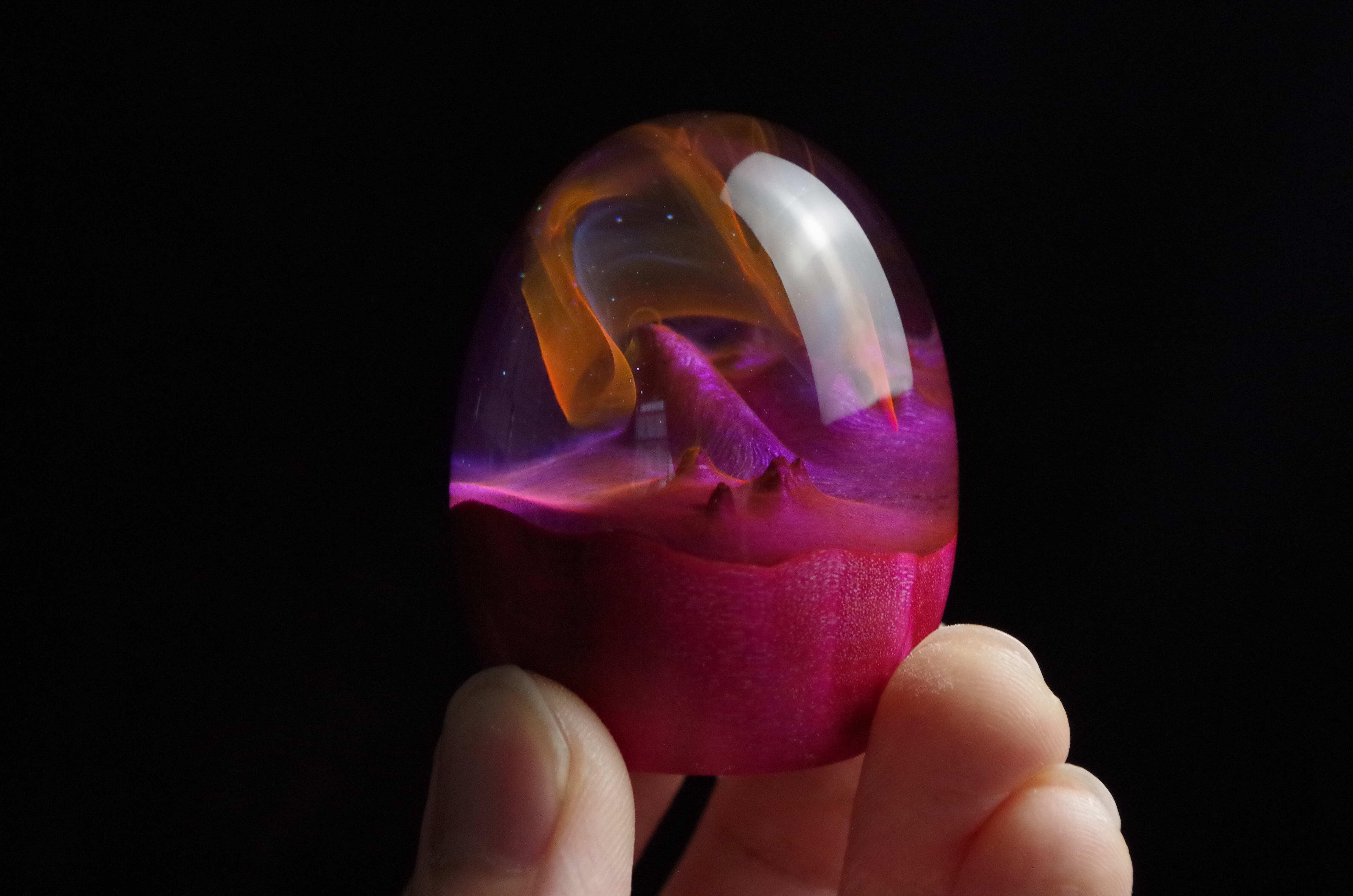 作品内部は景色をイメージし製作しており、より鮮明に魅せるためレジンの透明度と鏡面研磨にはこだわって仕上げました。