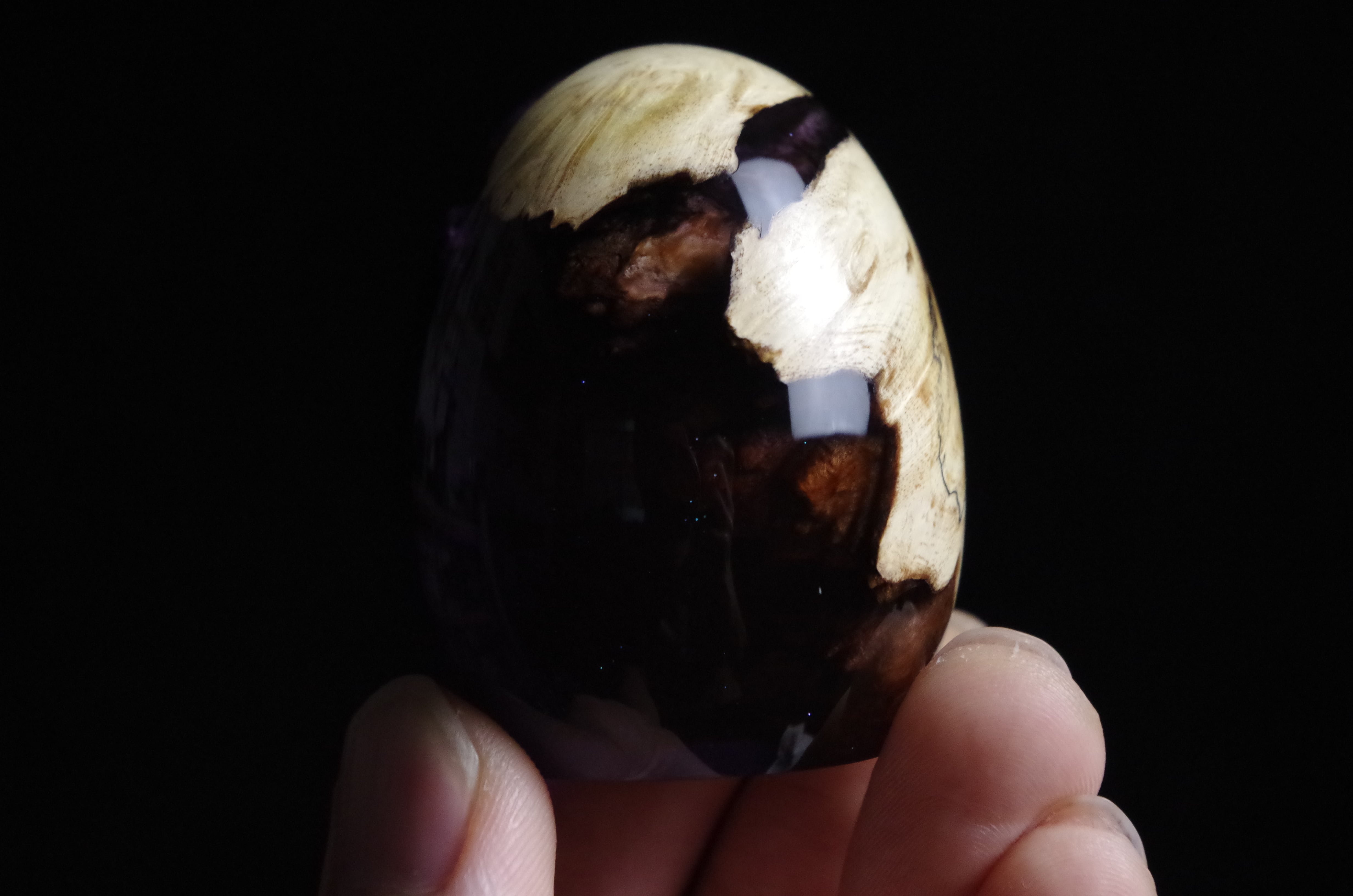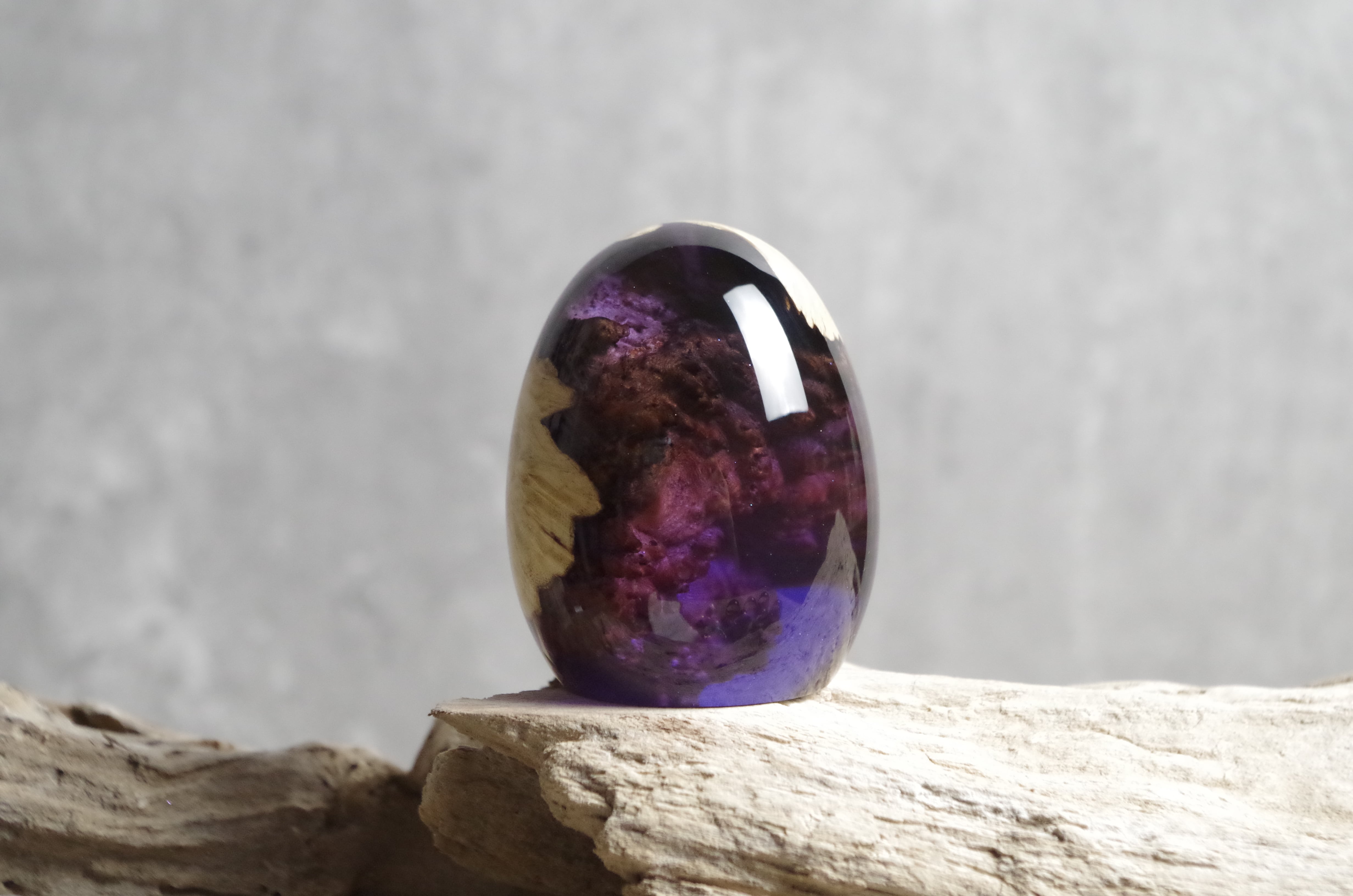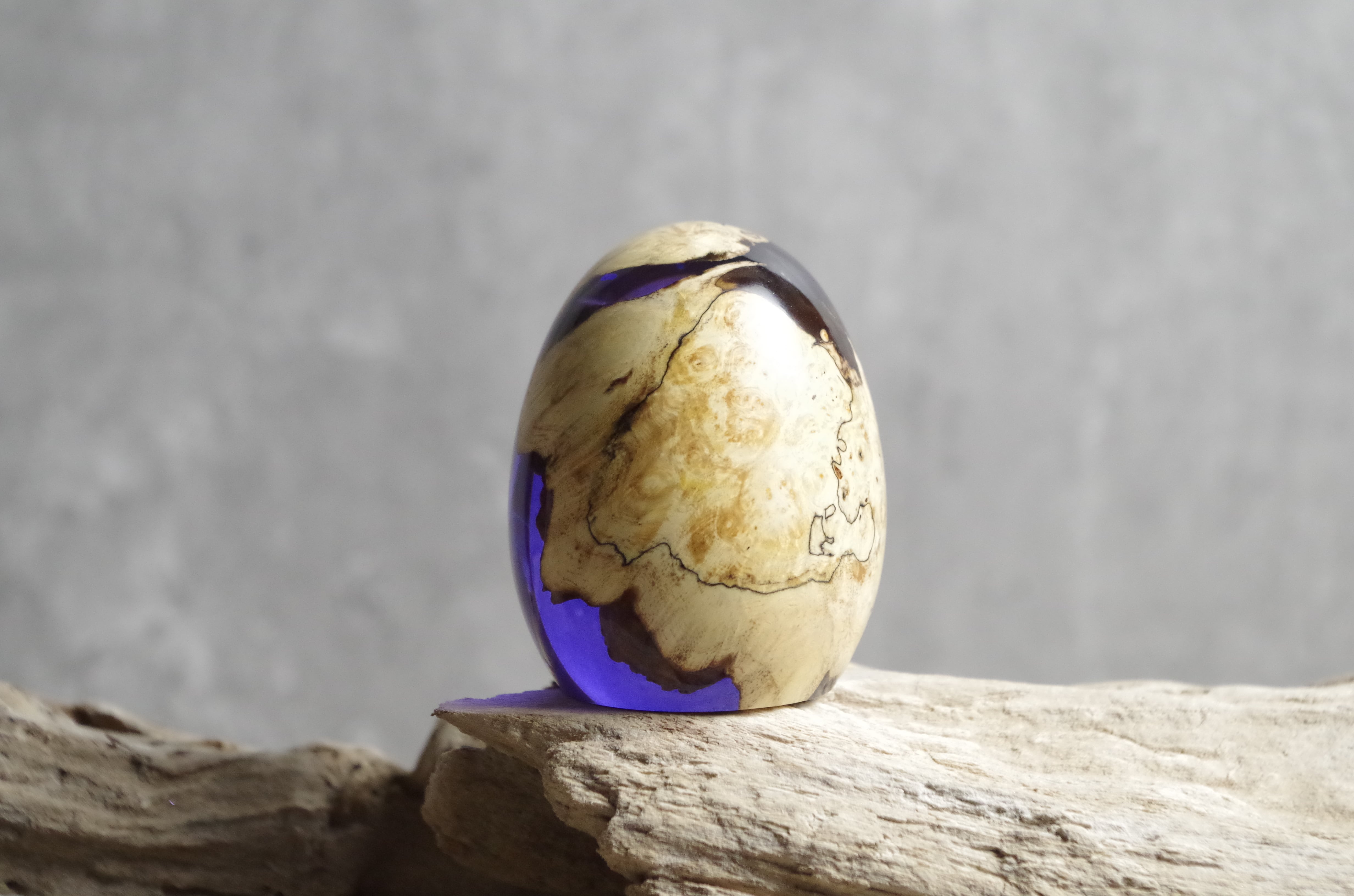 木と樹脂を組み合わせ1つ1つ手作りで仕上げた卵形オブジェ(ペーパーウェイト)になります。