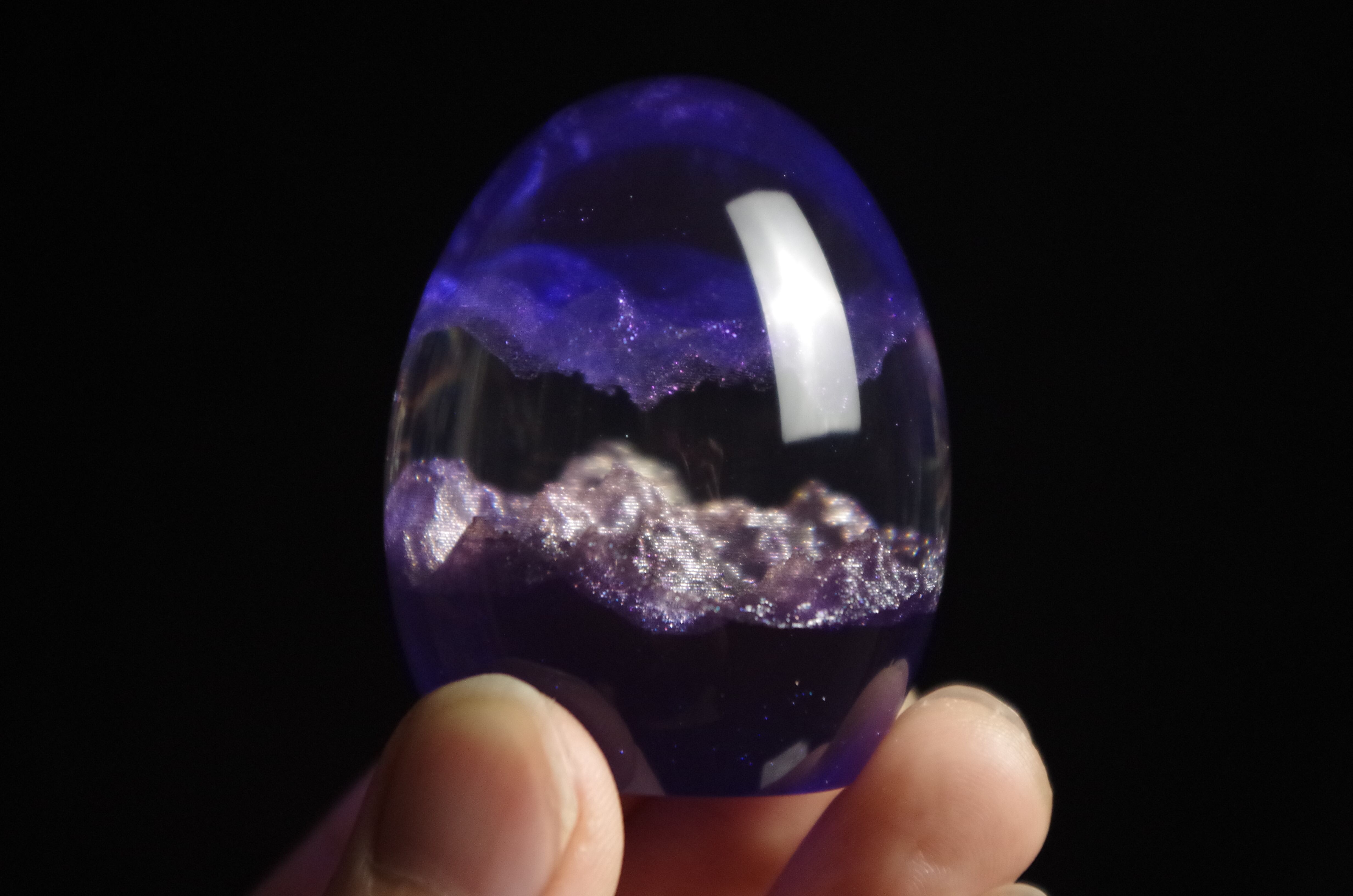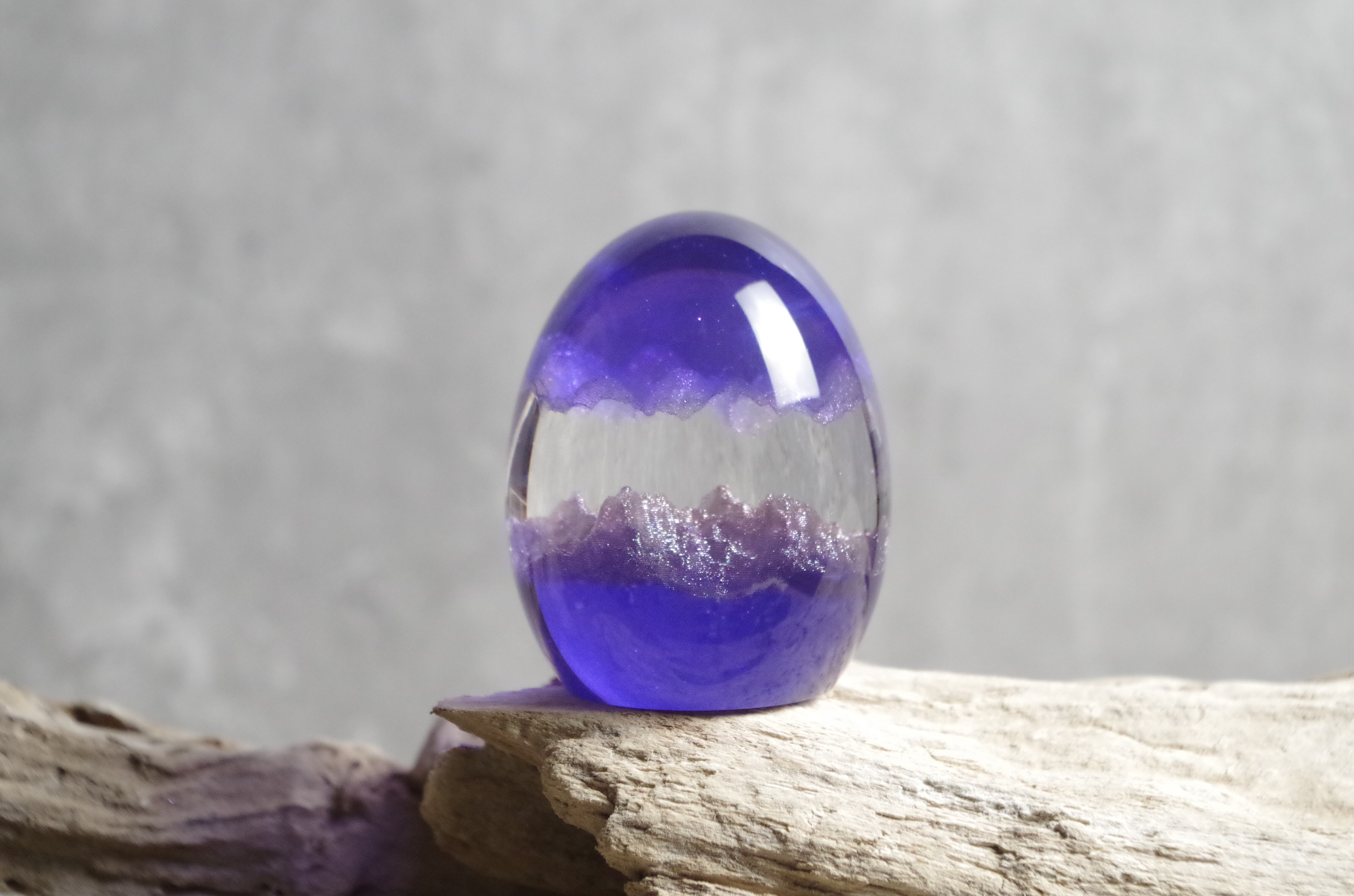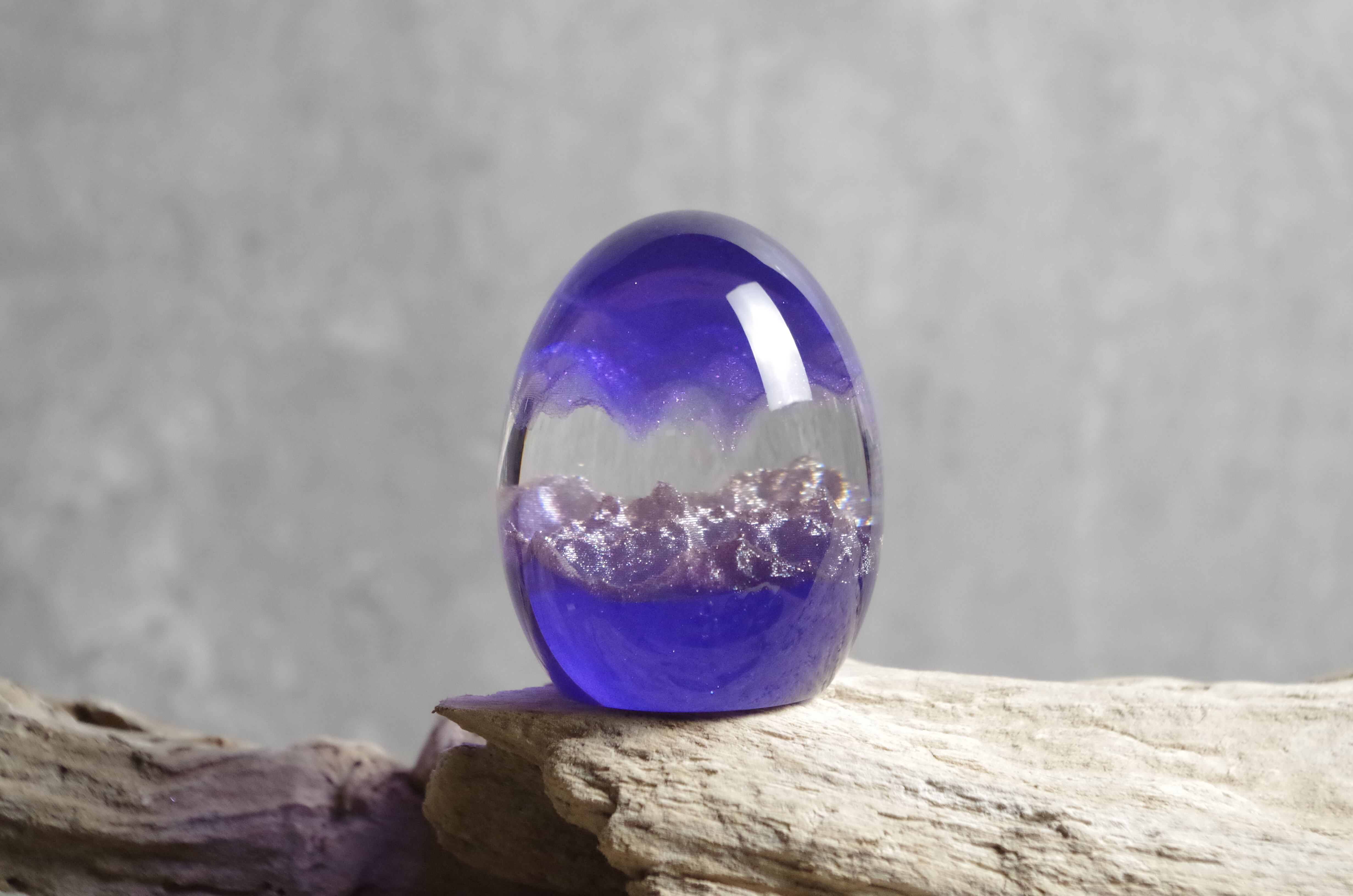 高透明の2液性エポキシ樹脂を使用し1つ1つ手作りで仕上げた卵形オブジェ(ペーパーウェイト)になります。