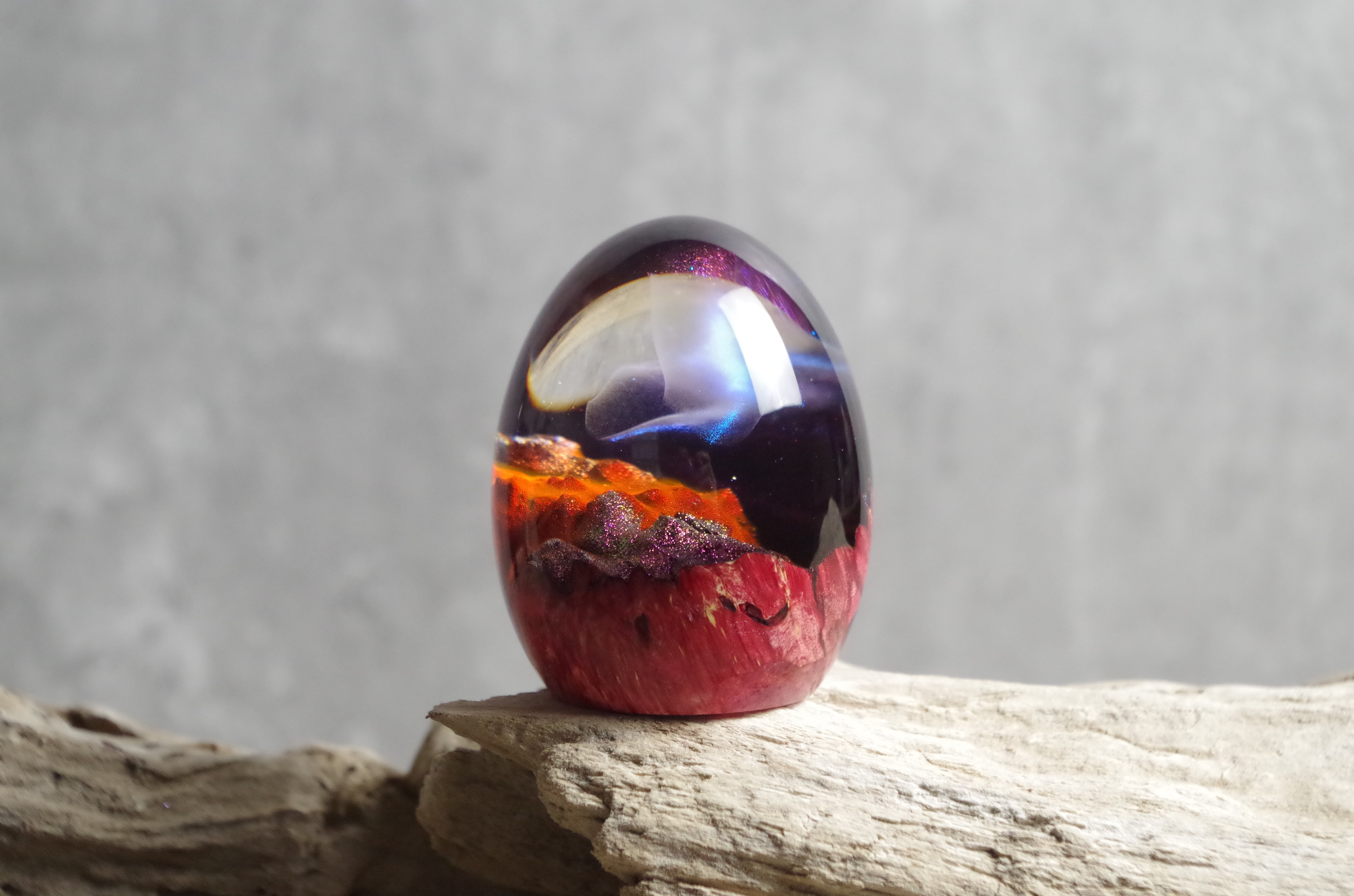 木と樹脂を組み合わせ1つ1つ手作りで仕上げた卵形オブジェ(ペーパーウェイト)になります。