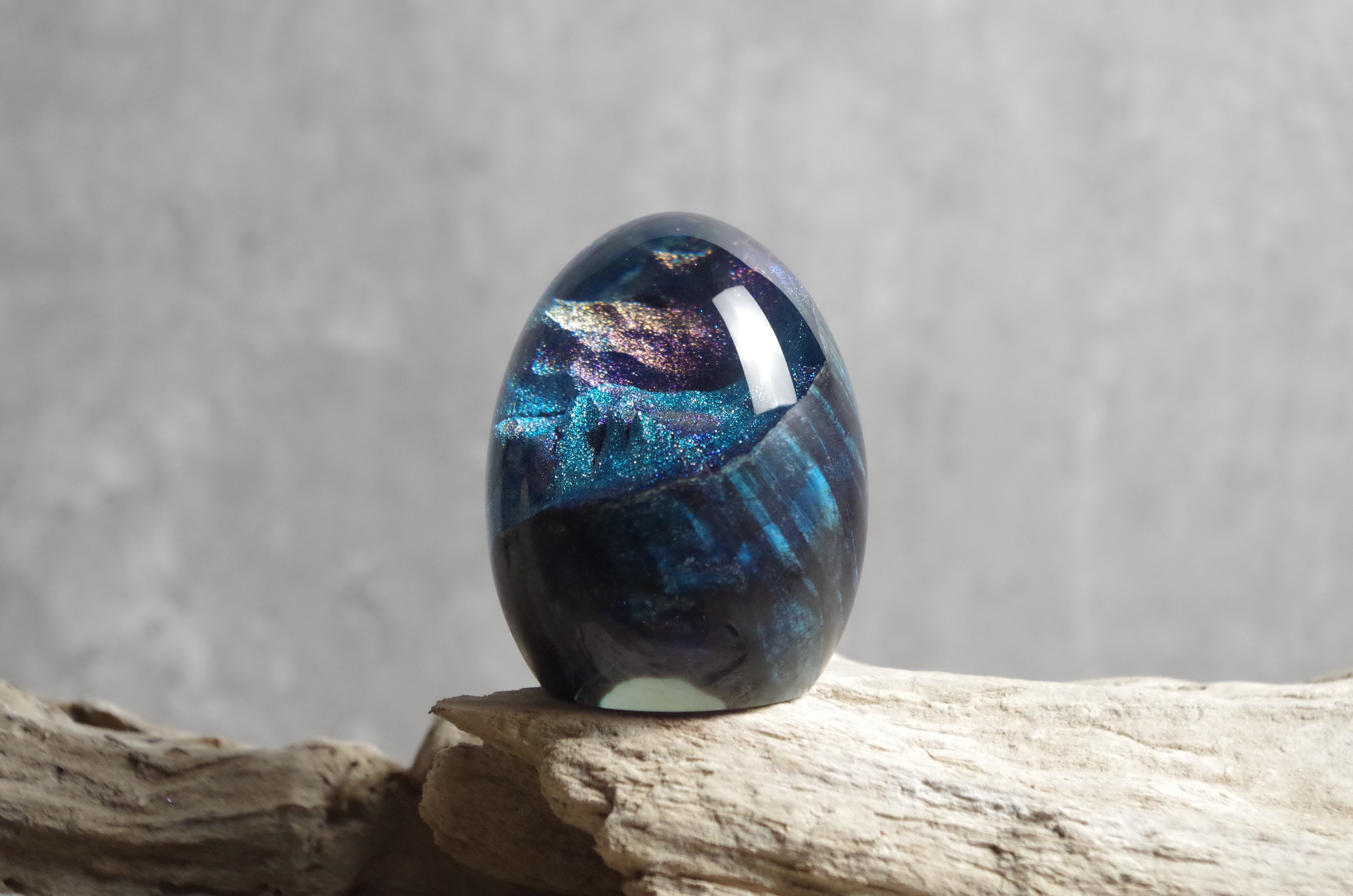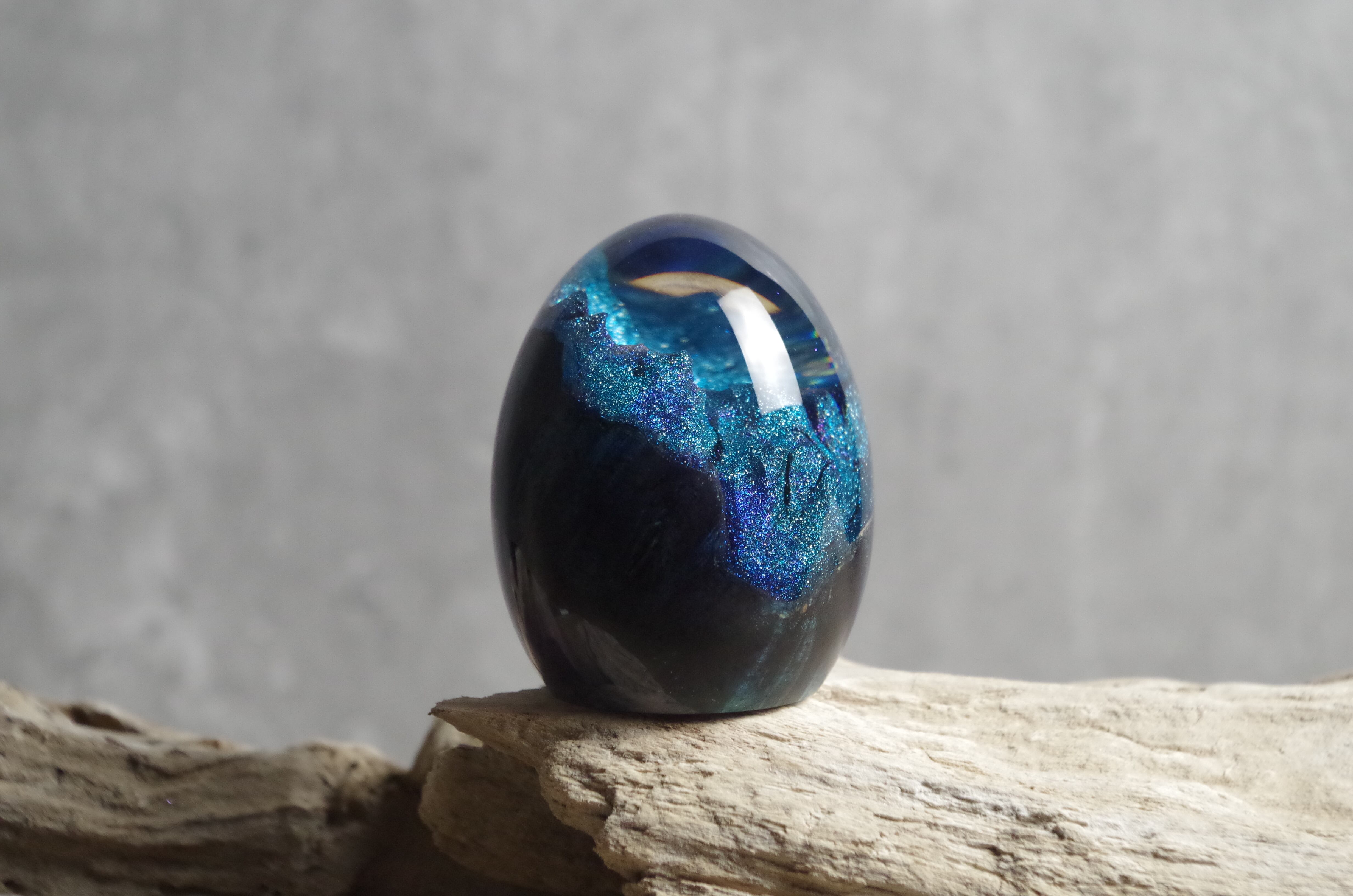 木と樹脂を組み合わせ1つ1つ手作りで仕上げた卵形オブジェ(ペーパーウェイト)になります。