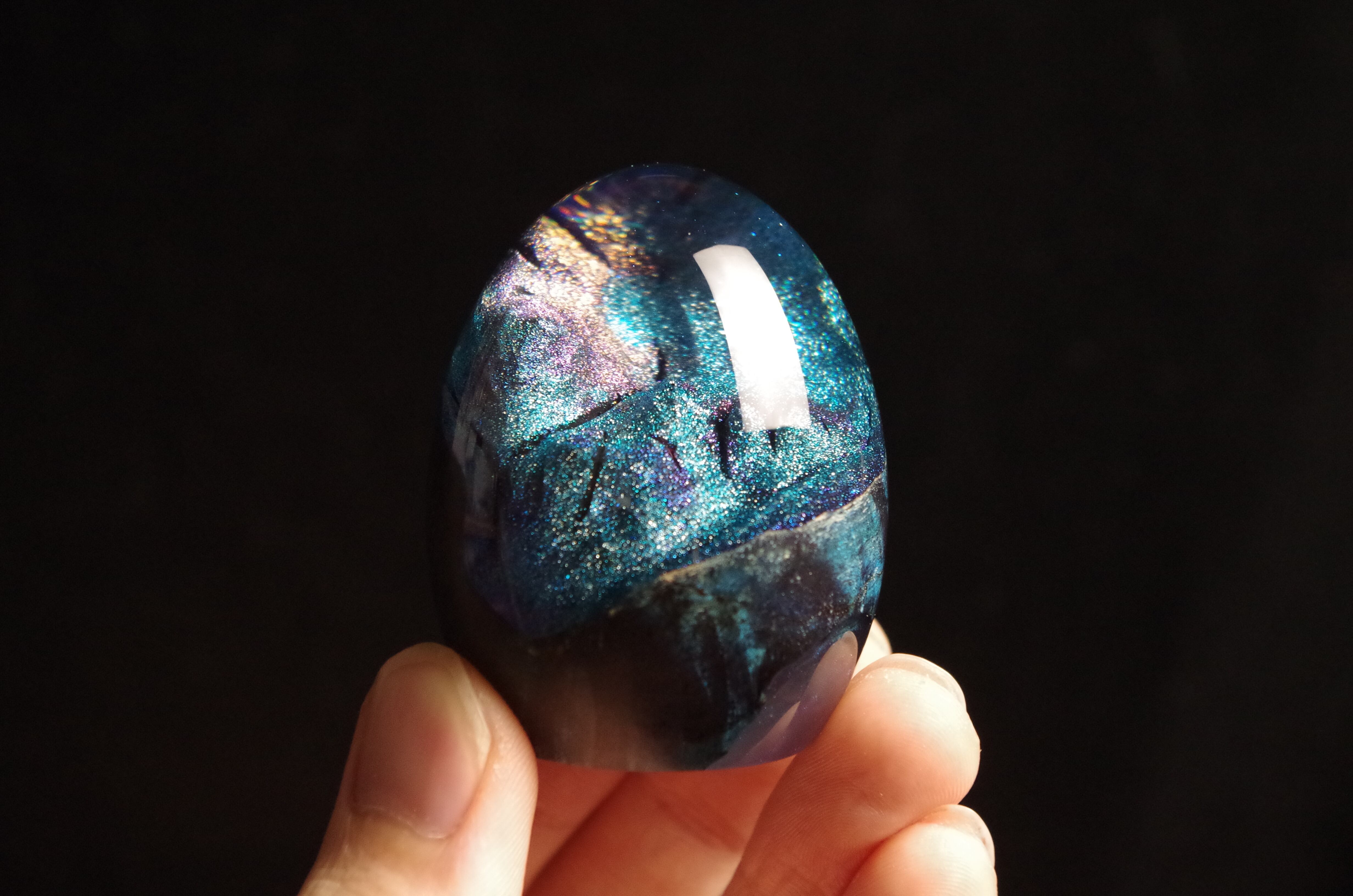 作品内部は景色をイメージし製作しており、より鮮明に魅せるためレジンの透明度と艶にこだわって仕上げました。