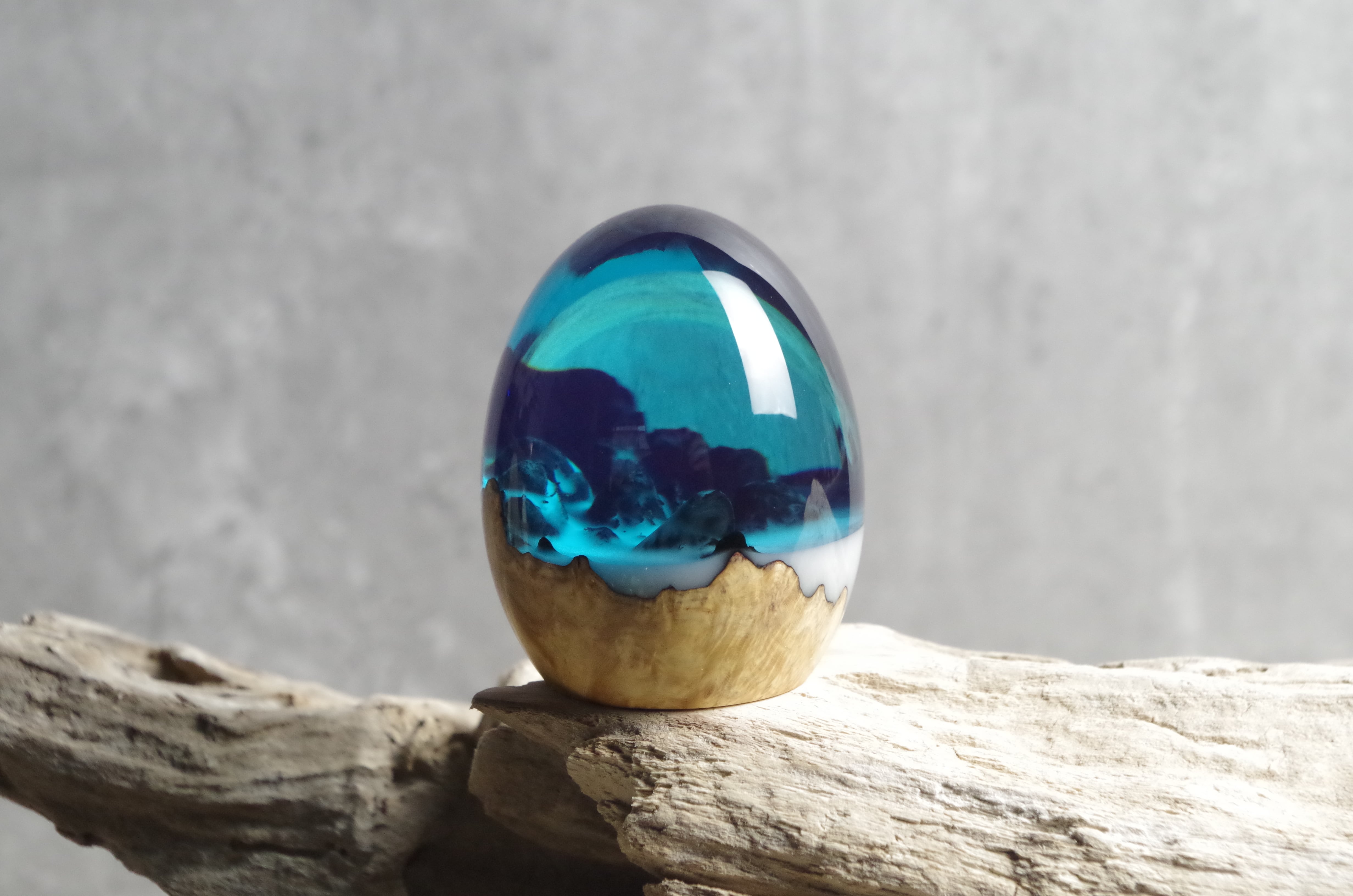 木と樹脂を組み合わせ1つ1つ手作りで仕上げた卵形オブジェ(ペーパーウェイト)になります。