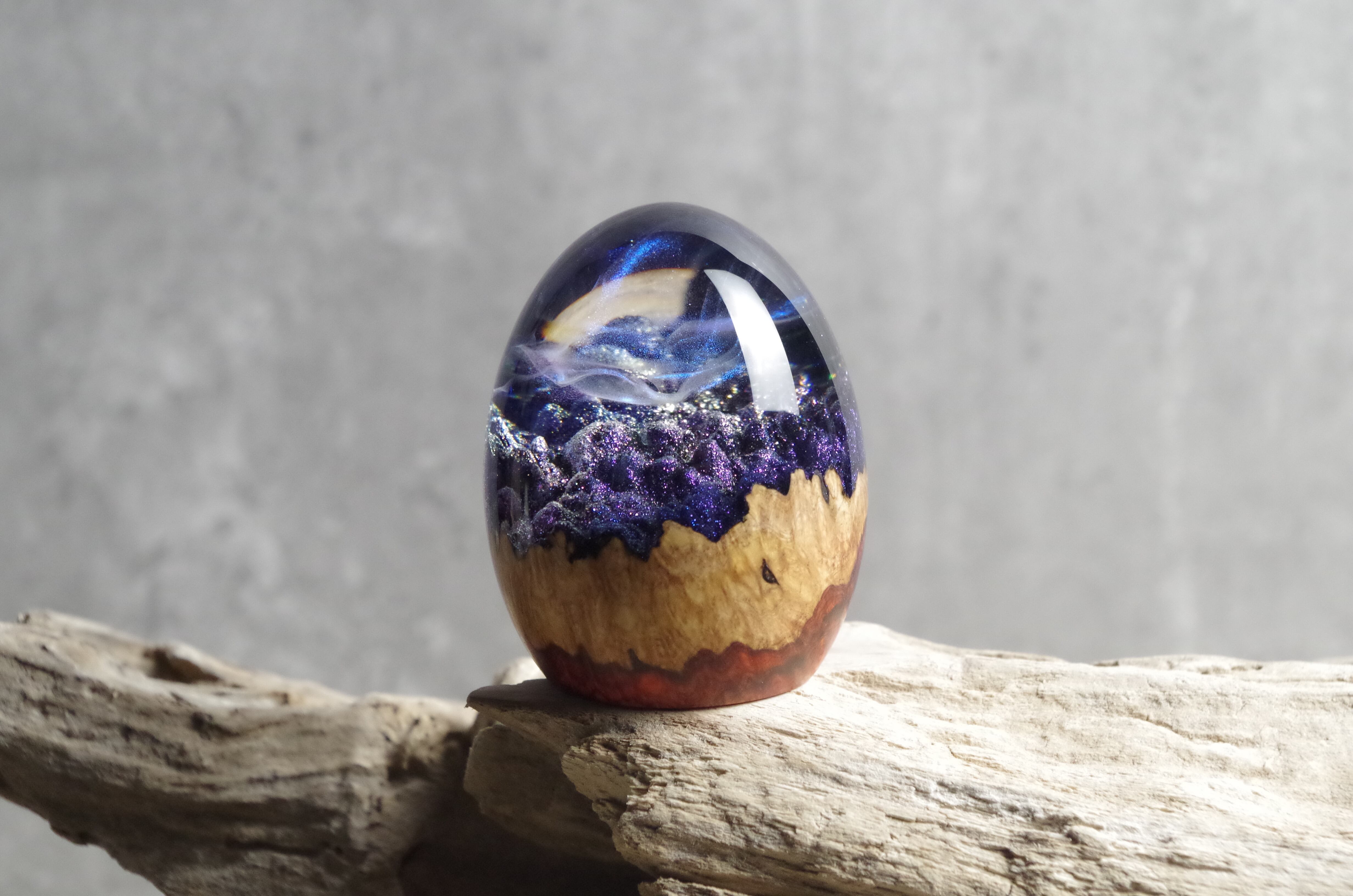木と樹脂を組み合わせ1つ1つ手作りで仕上げた卵形オブジェ(ペーパーウェイト)になります。