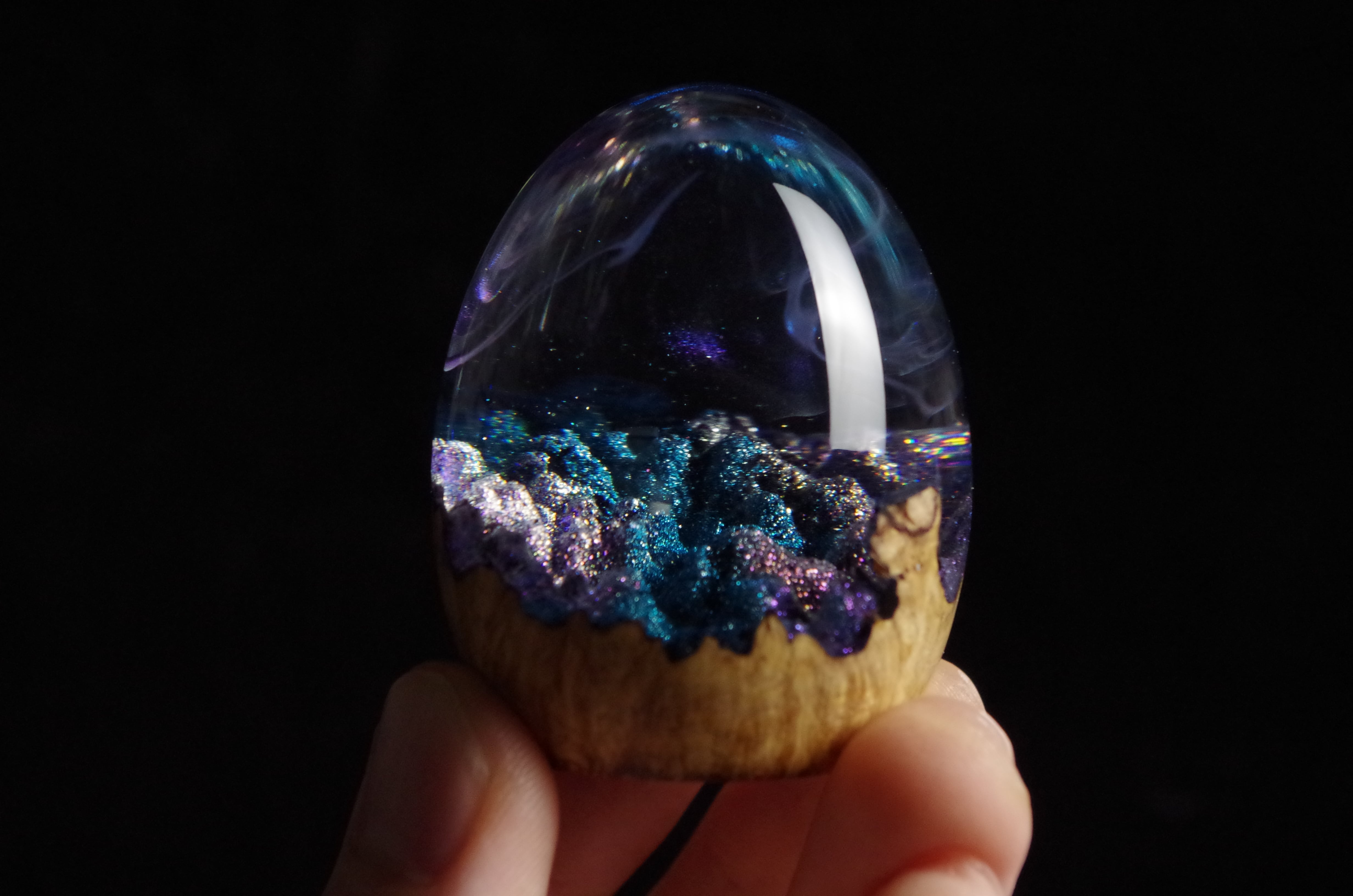 作品内部は景色をイメージし製作しており、より鮮明に魅せるためレジンの透明度と艶にこだわって仕上げました。