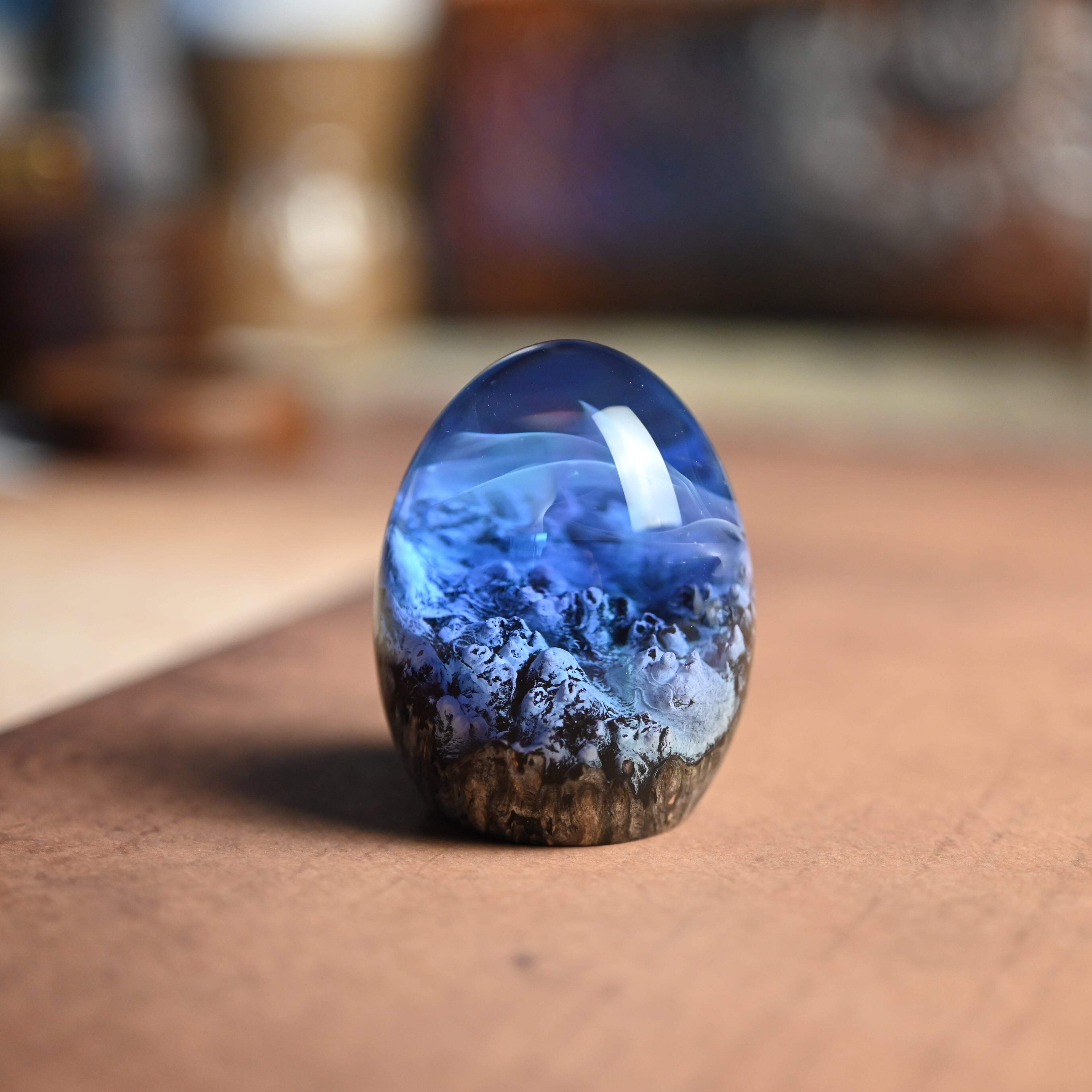 作品内部は景色をイメージし製作しており、より鮮明に魅せるためレジンの透明度と艶にこだわって仕上げました。