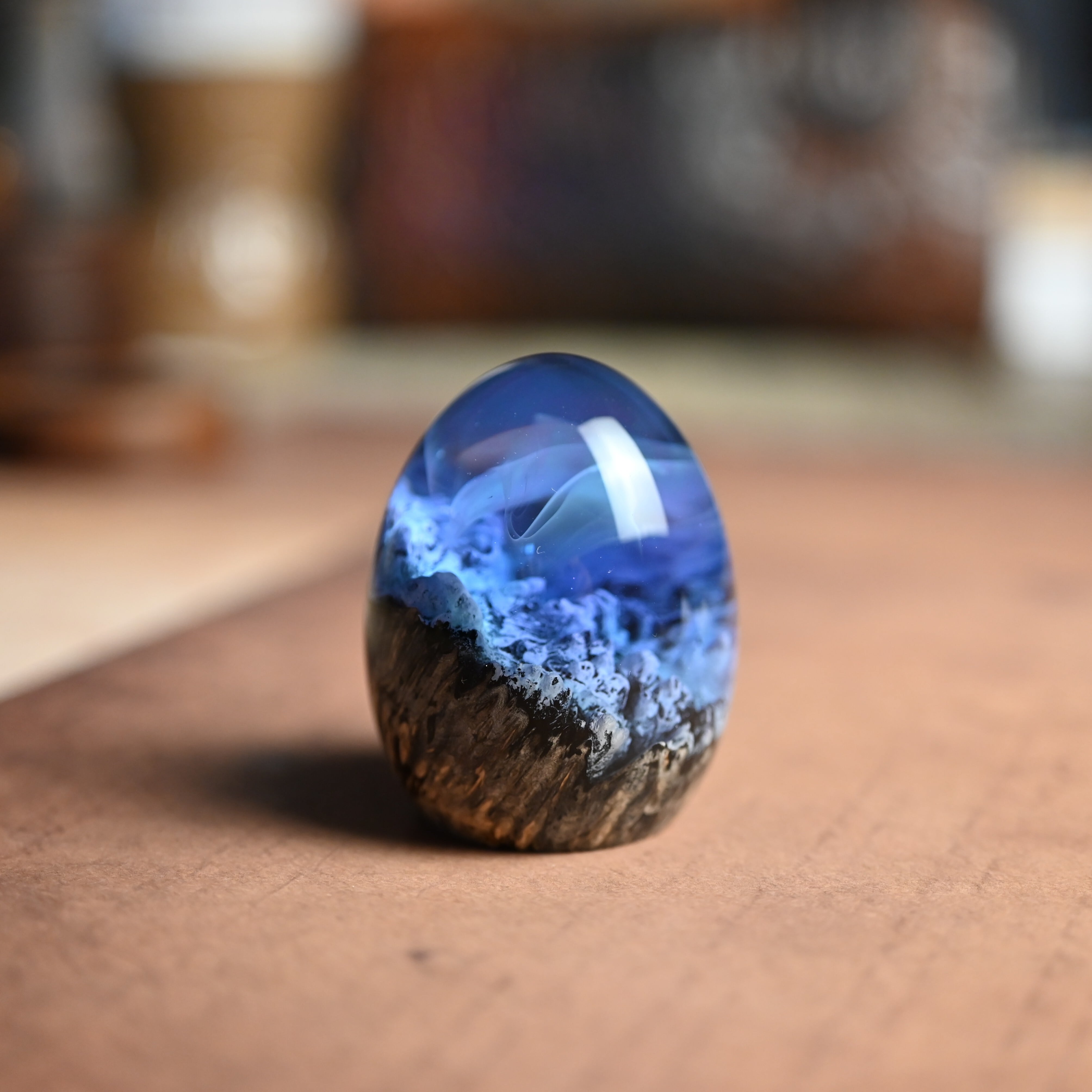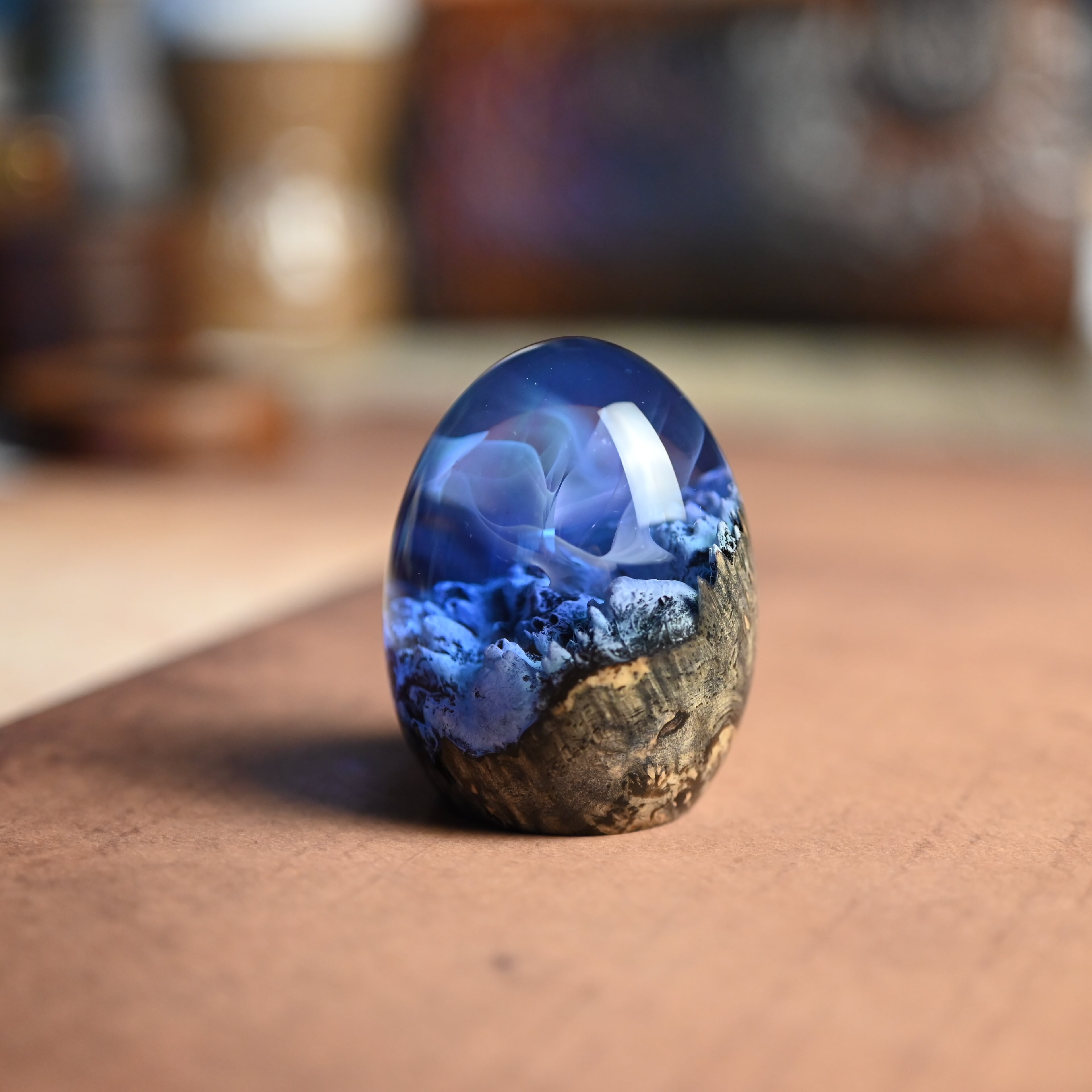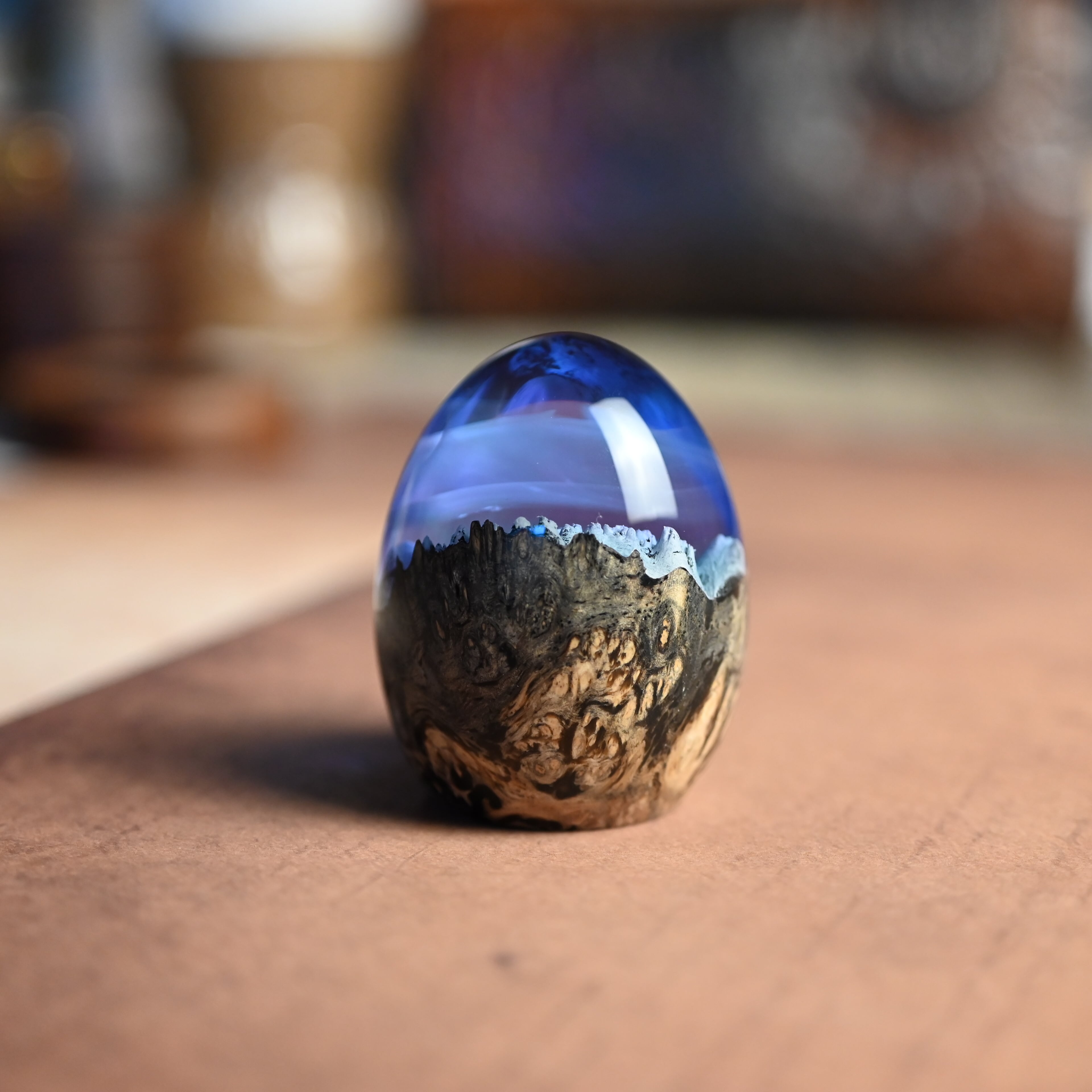 木と樹脂を組み合わせ1つ1つ手作りで仕上げた卵形オブジェ(ペーパーウェイト)になります。