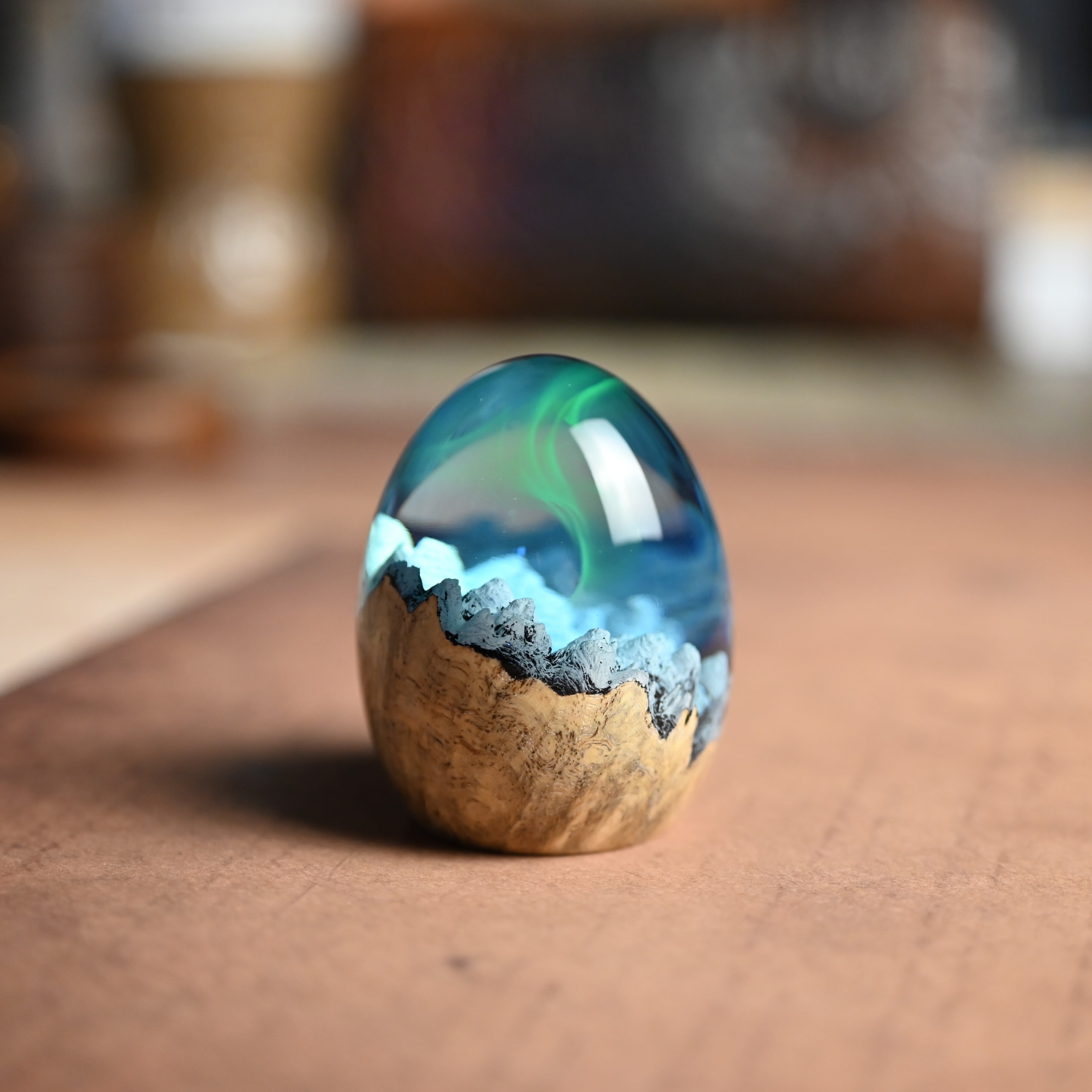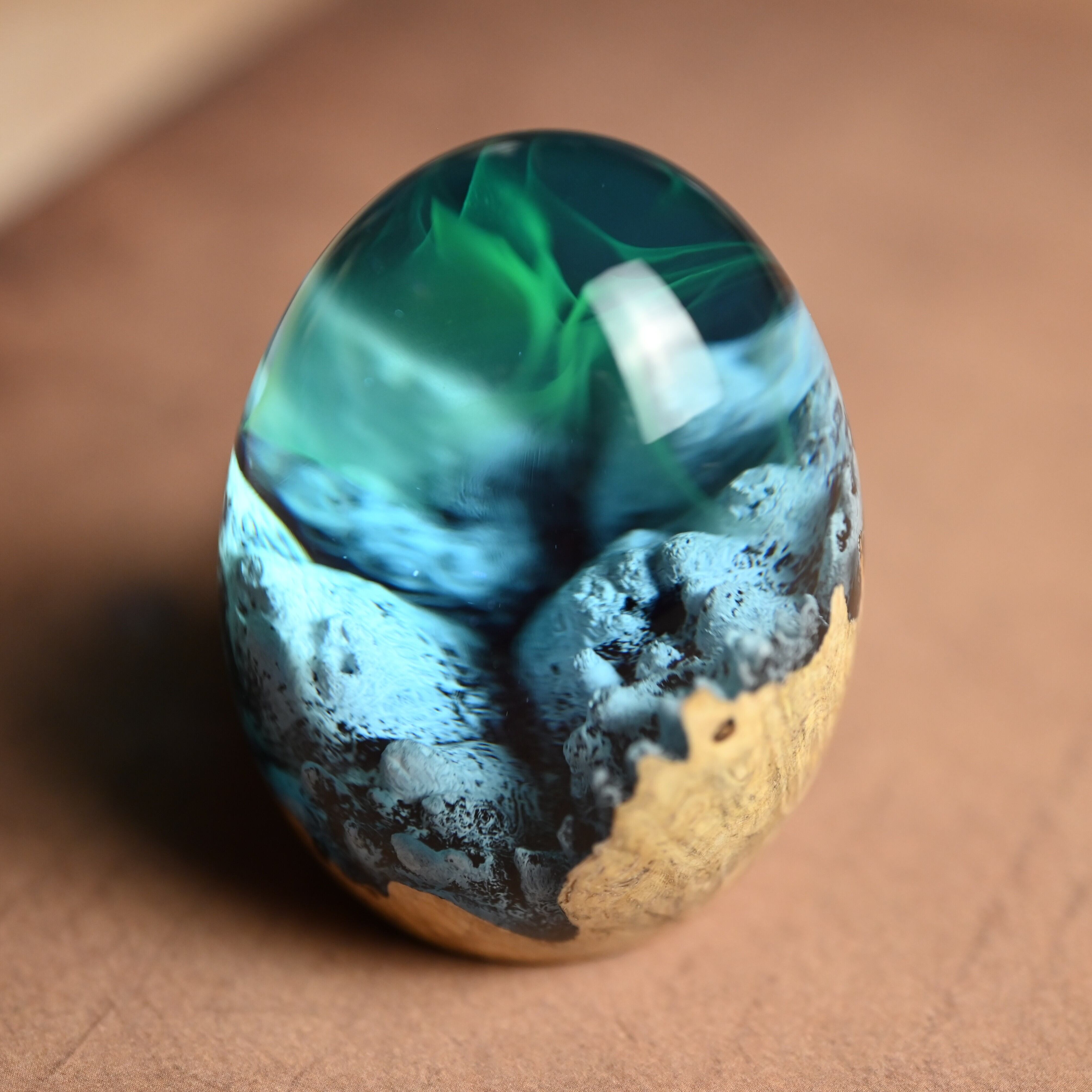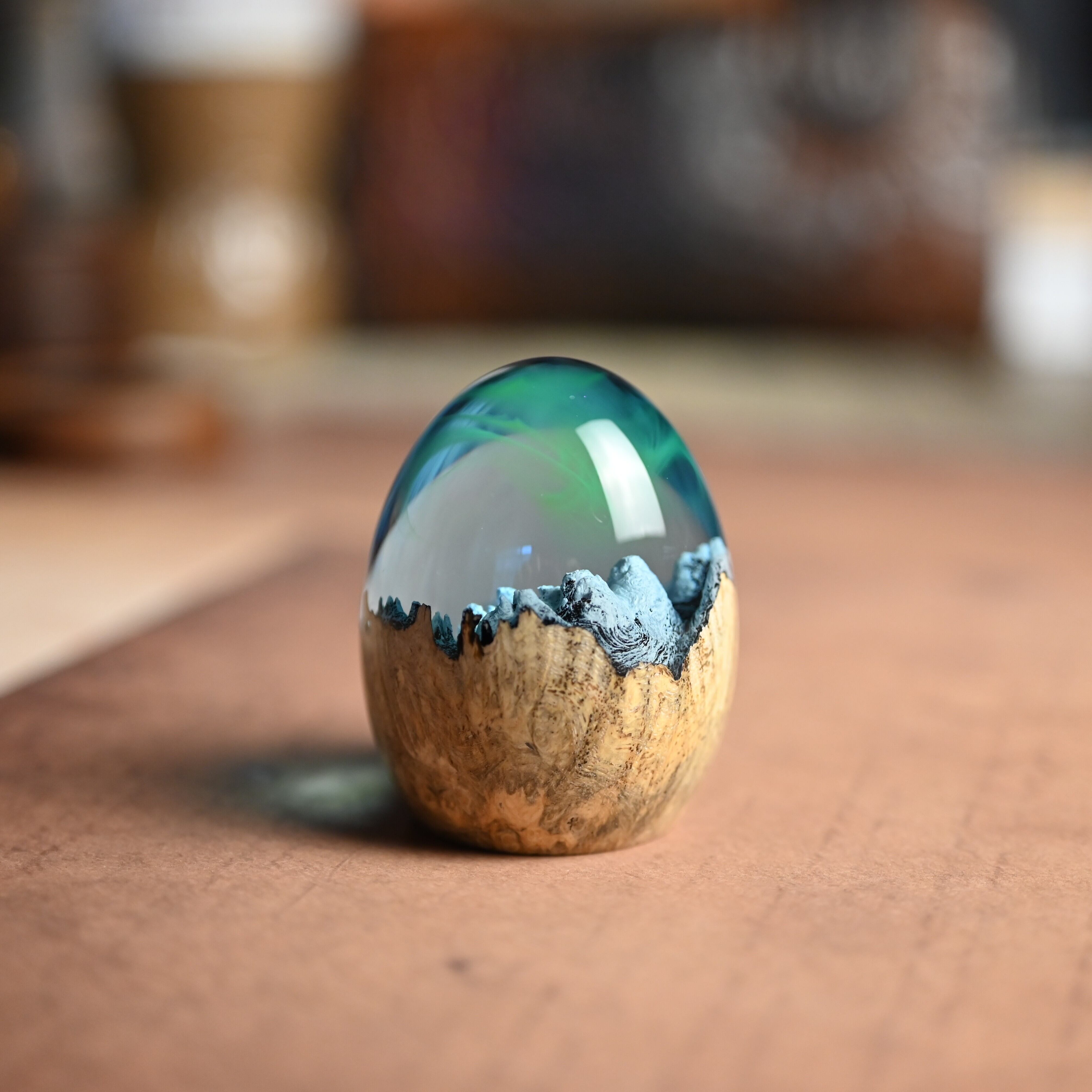 木と樹脂を組み合わせ1つ1つ手作りで仕上げた卵形オブジェ(ペーパーウェイト)になります。