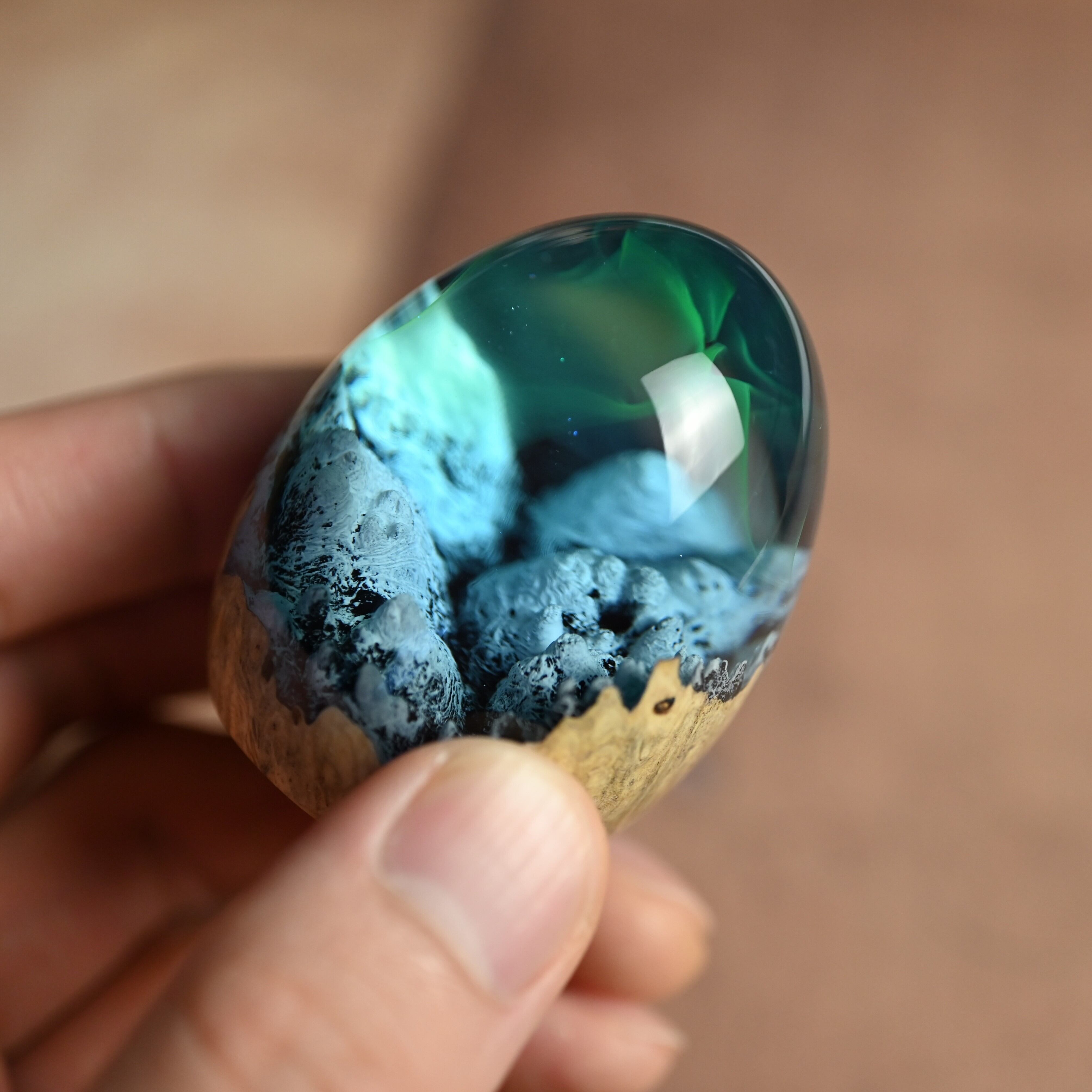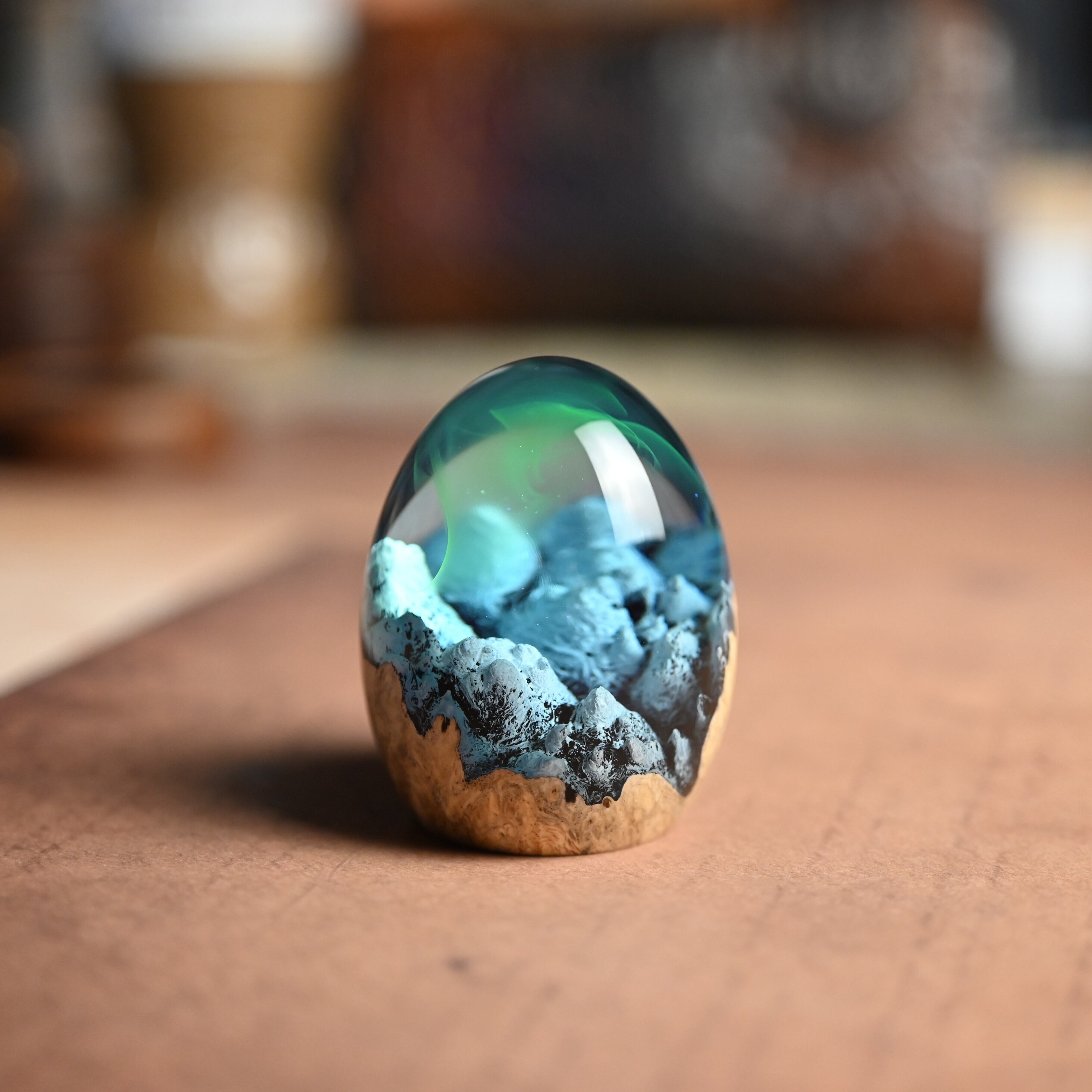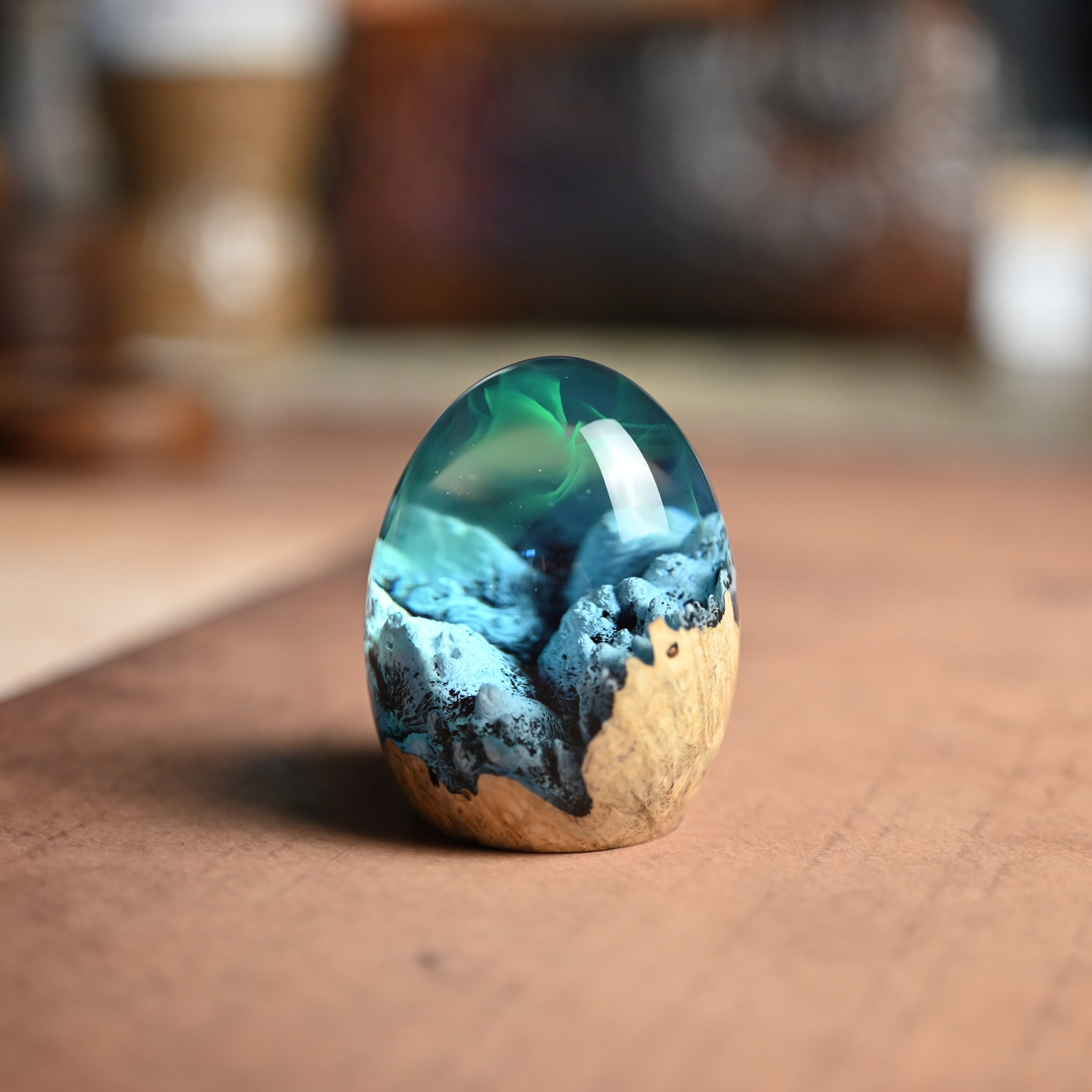 木と樹脂を組み合わせ1つ1つ手作りで仕上げた卵形オブジェ(ペーパーウェイト)になります。