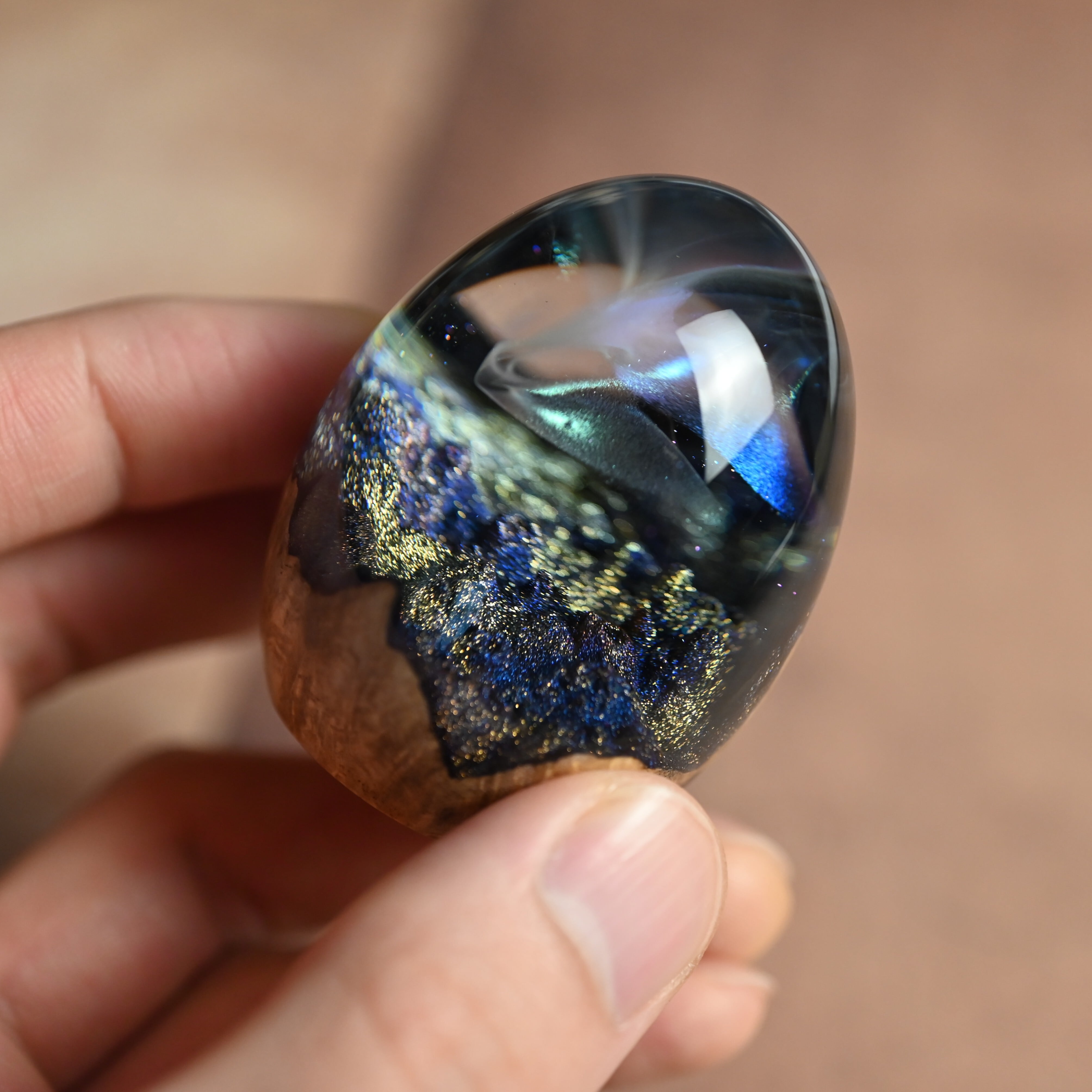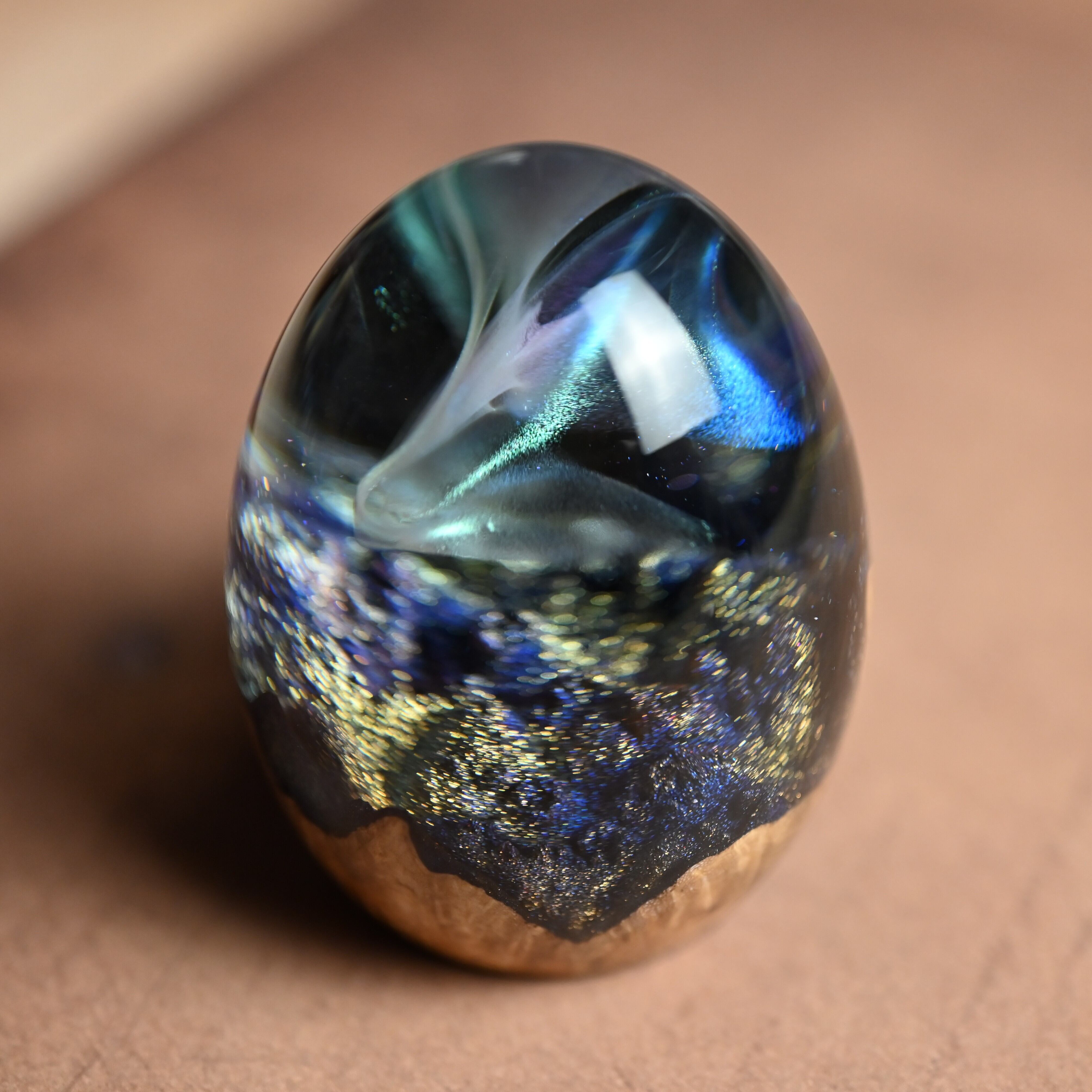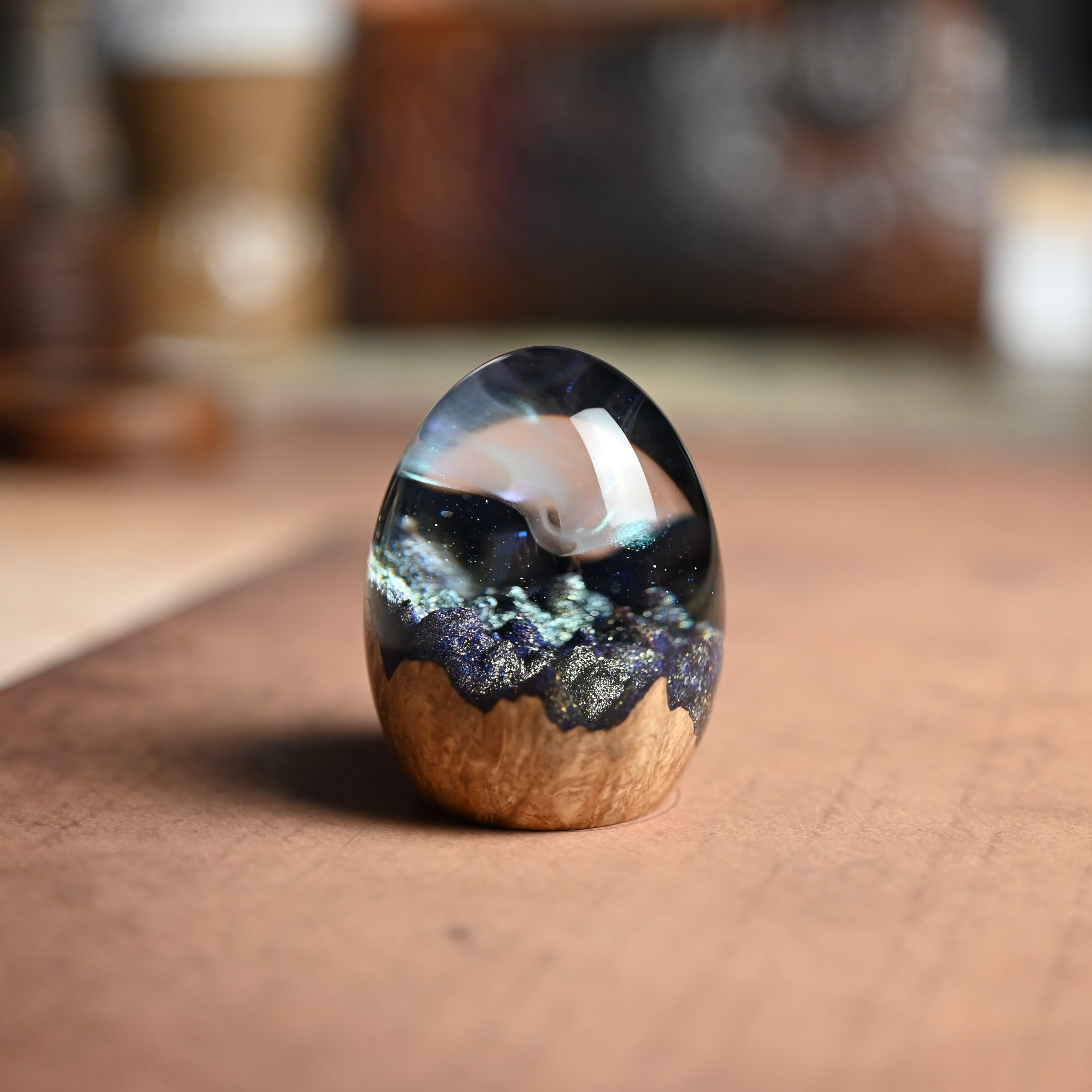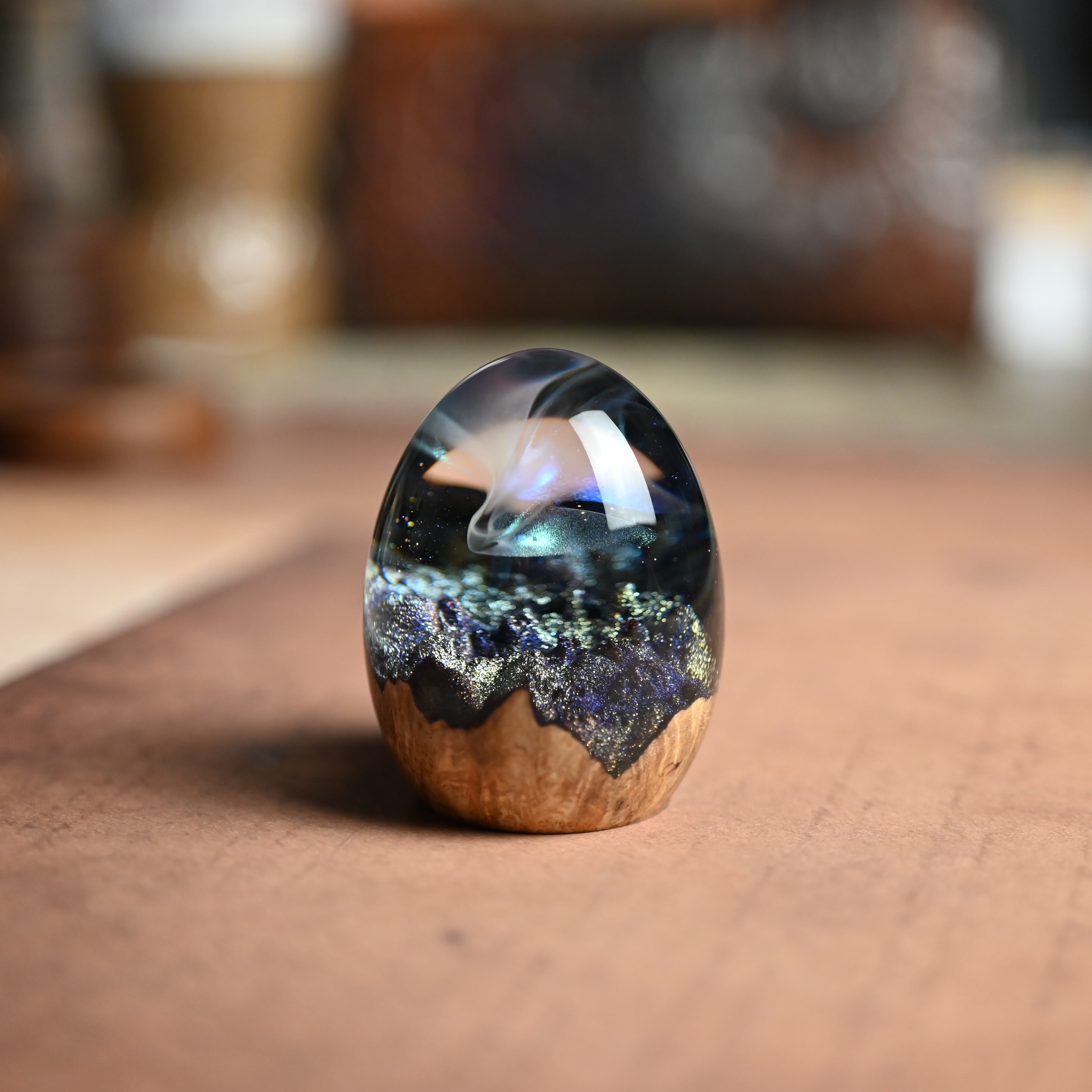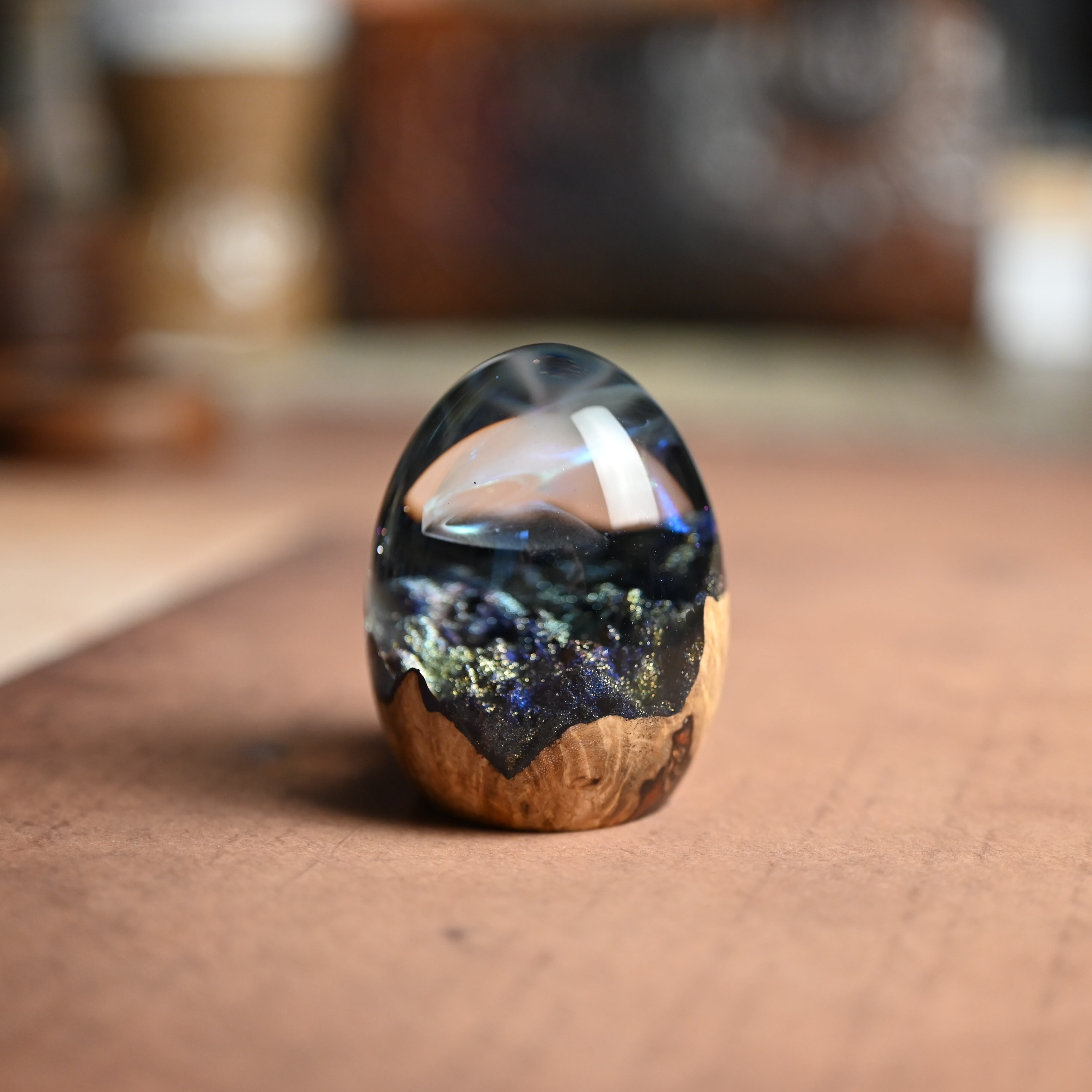 木と樹脂を組み合わせ1つ1つ手作りで仕上げた卵形オブジェ(ペーパーウェイト)になります。