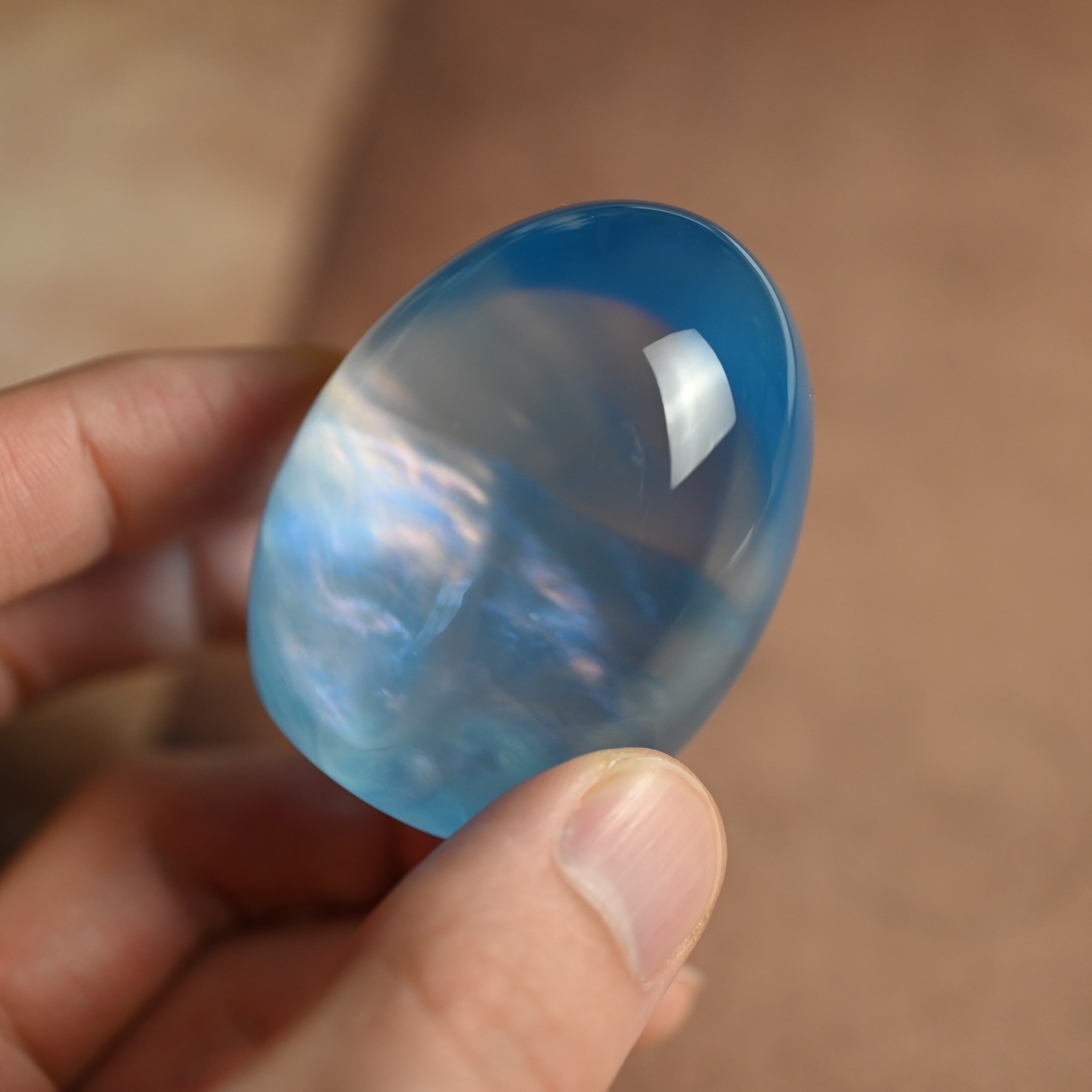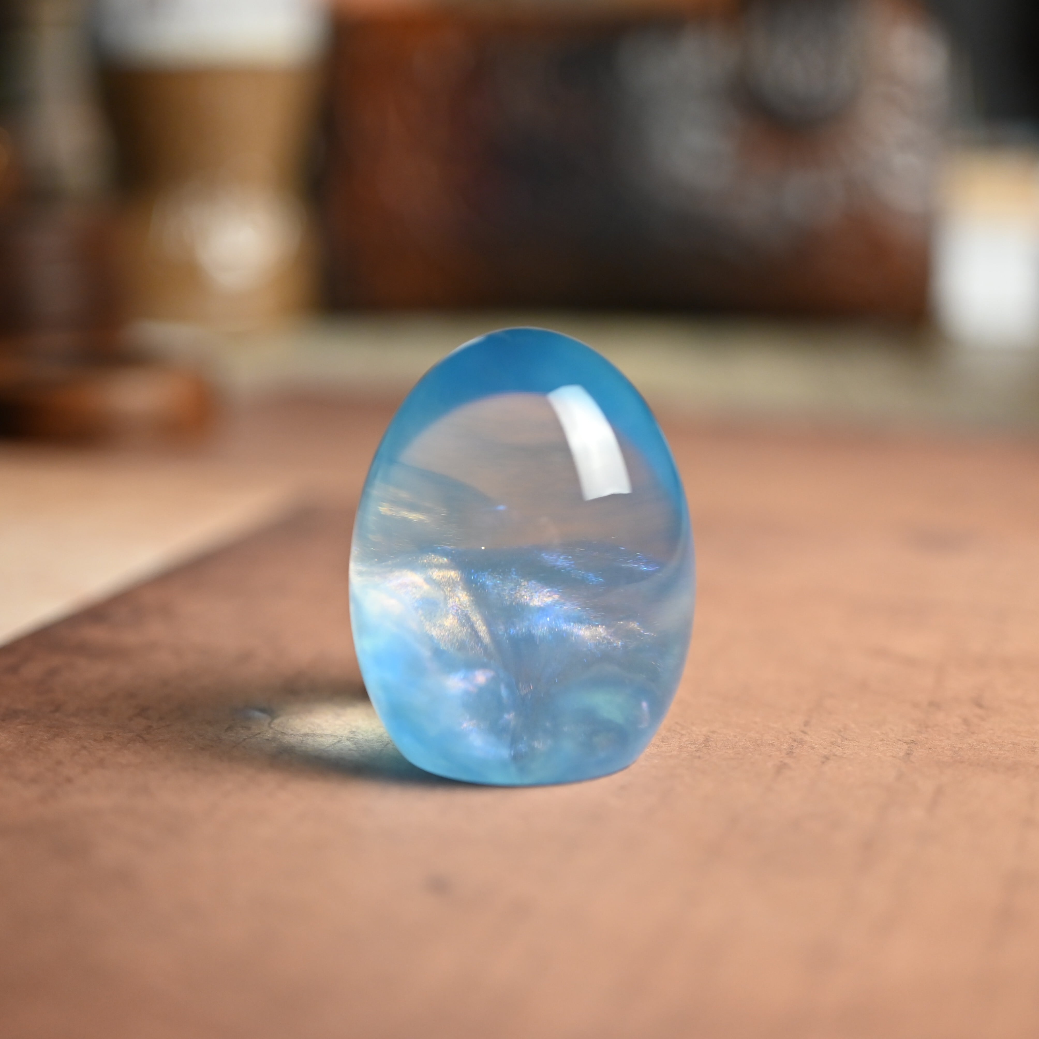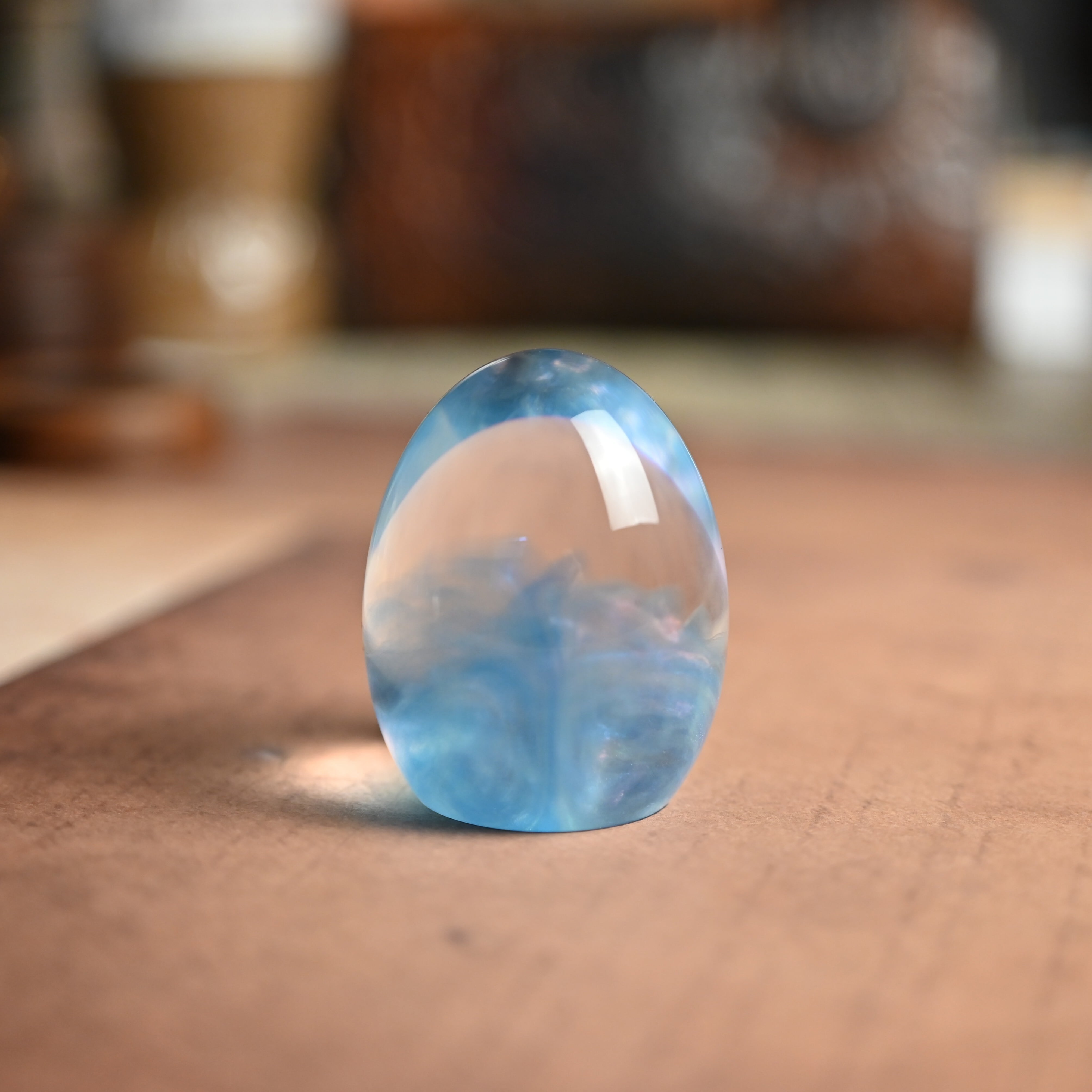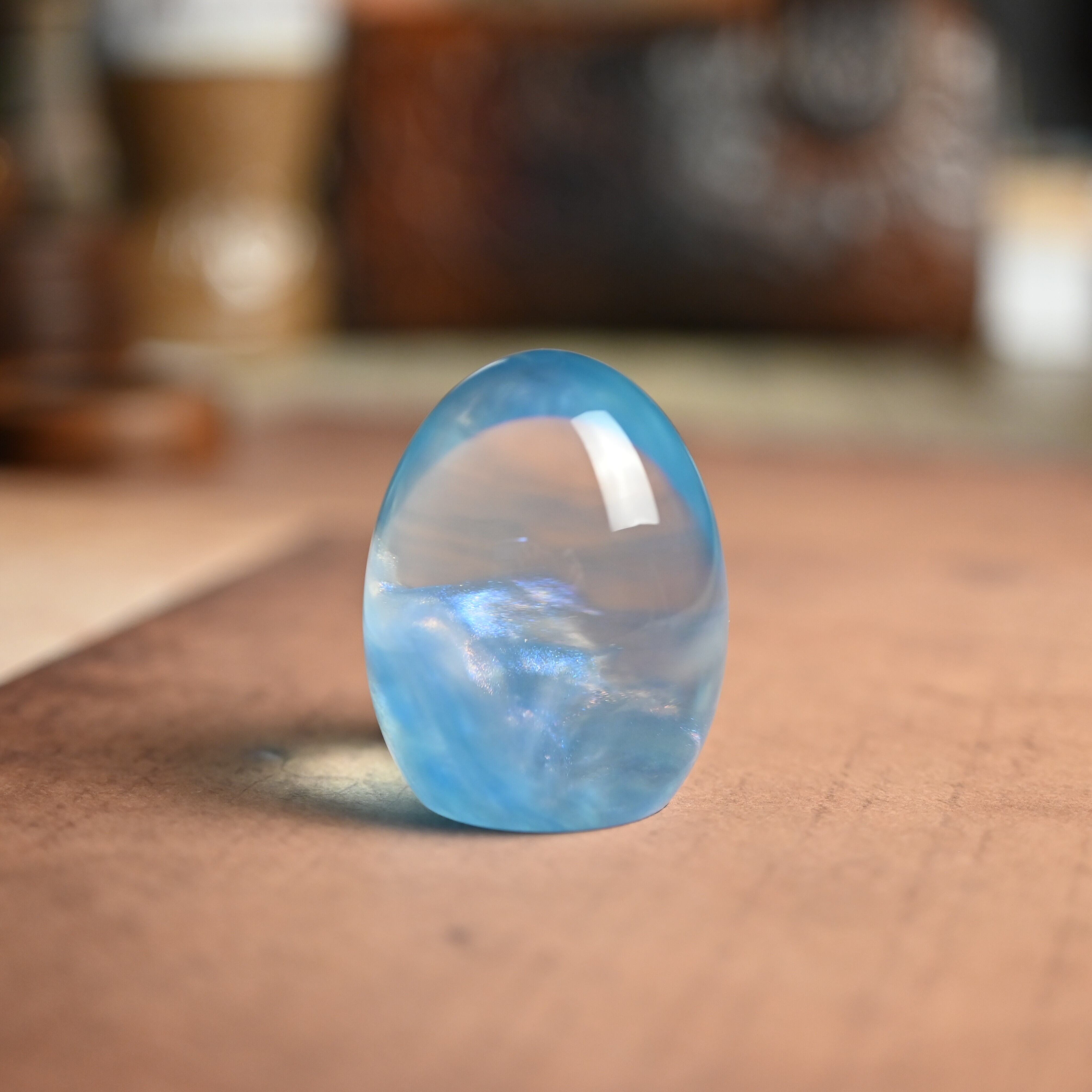高透明の2液性エポキシ樹脂を使用し1つ1つ手作りで仕上げた卵形オブジェ(ペーパーウェイト)になります。