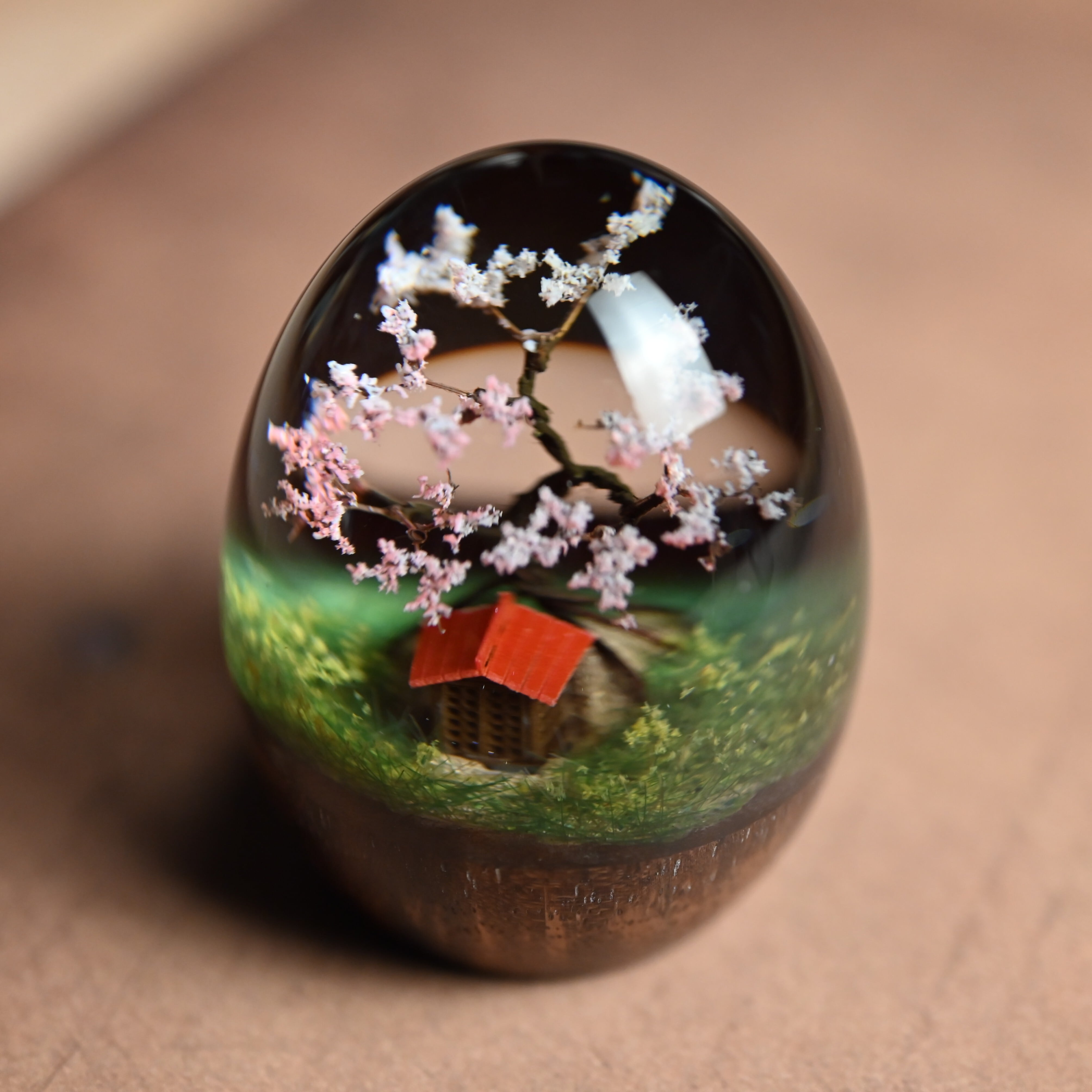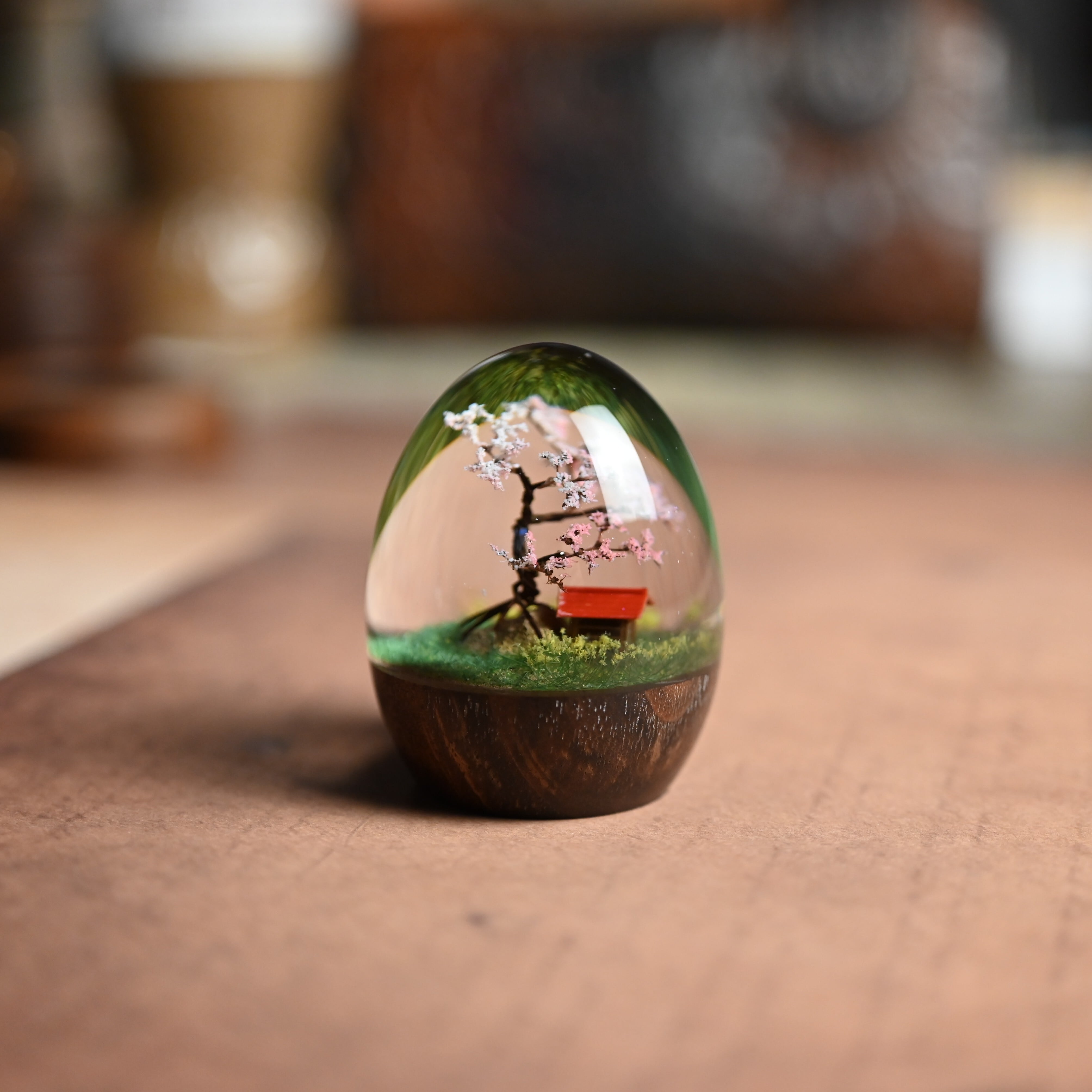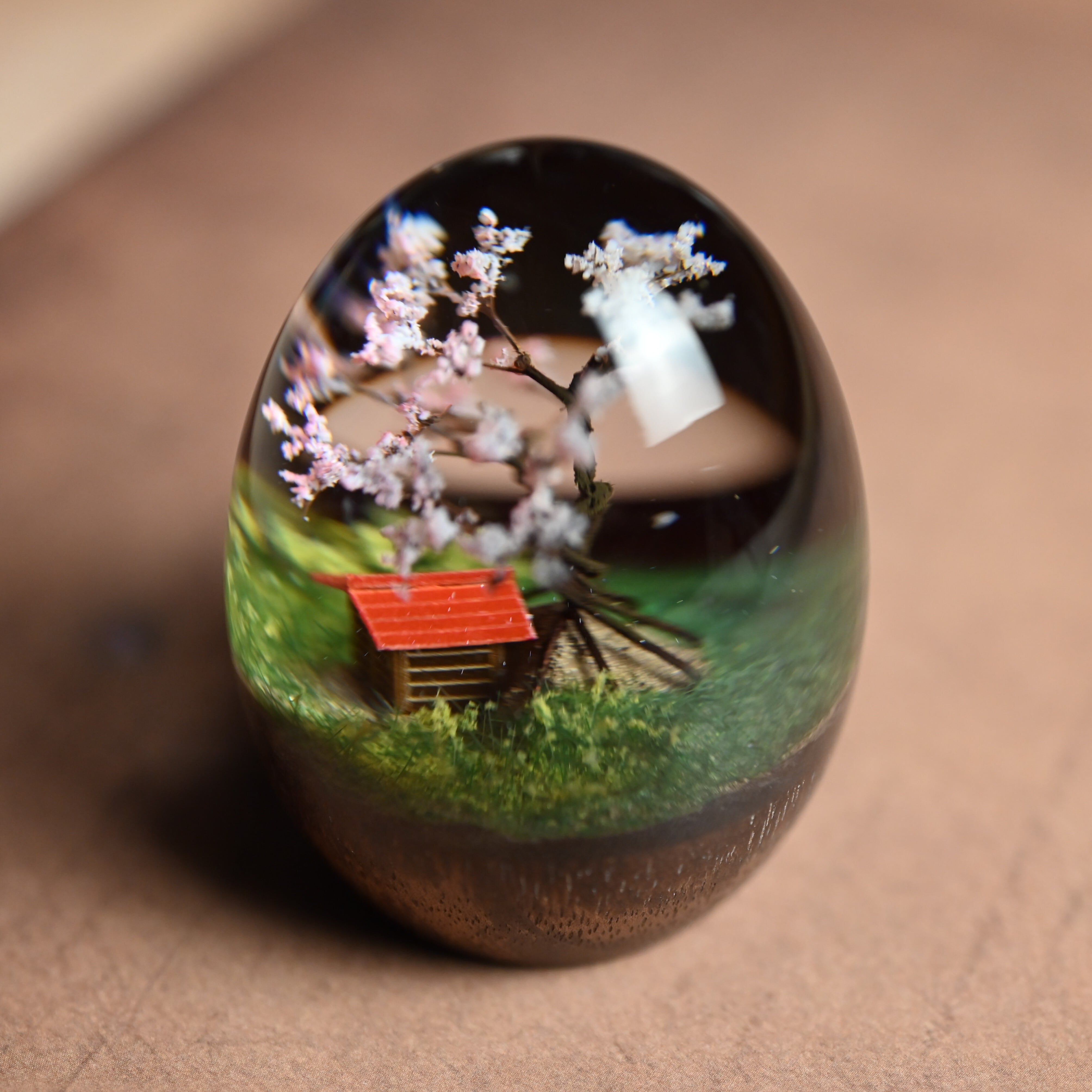 卵の中に閉じ込めることでジオラマの小さな世界により奥行と存在感をプラスすることができました。