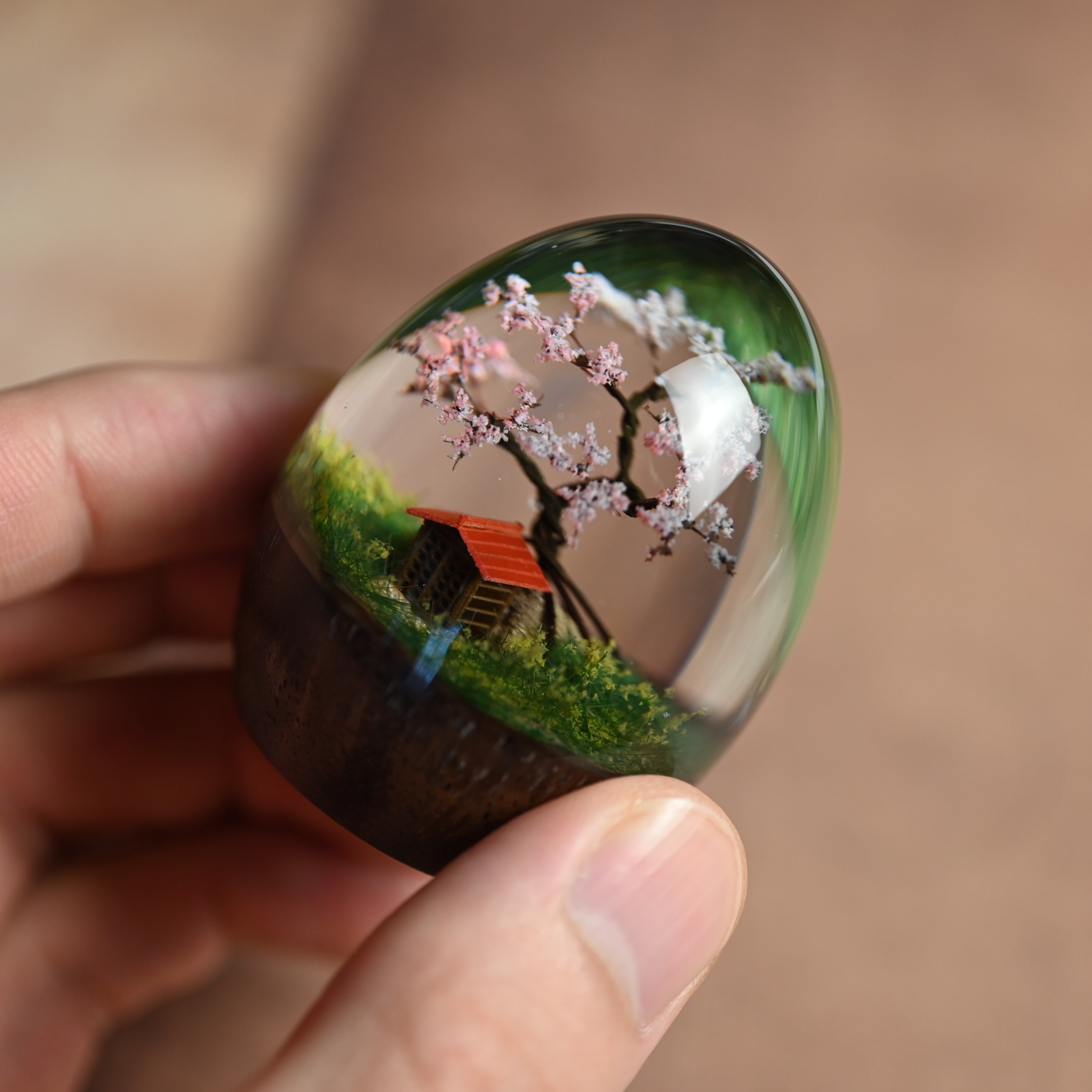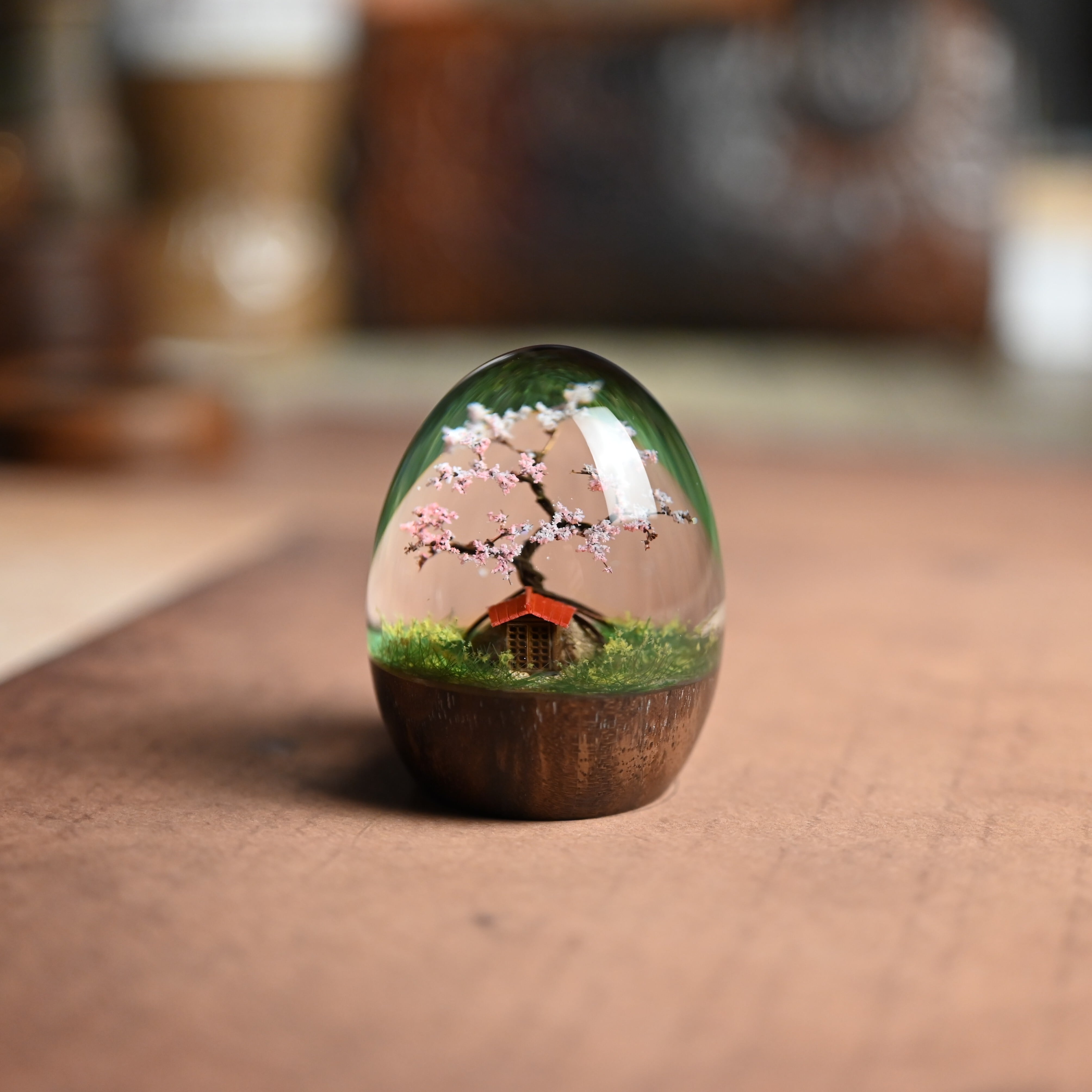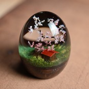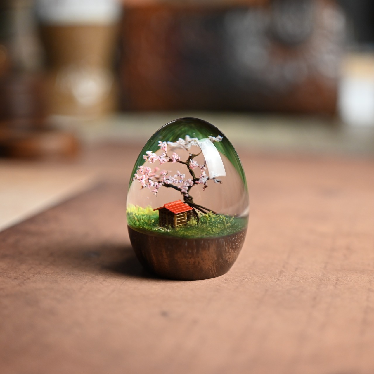 卵の中に閉じ込めることでジオラマの小さな世界により奥行と存在感をプラスすることができました。