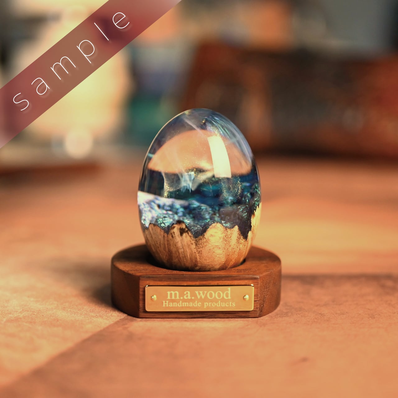木と樹脂を組み合わせ1つ1つ手作りで仕上げた卵形オブジェ(ペーパーウェイト)になります。