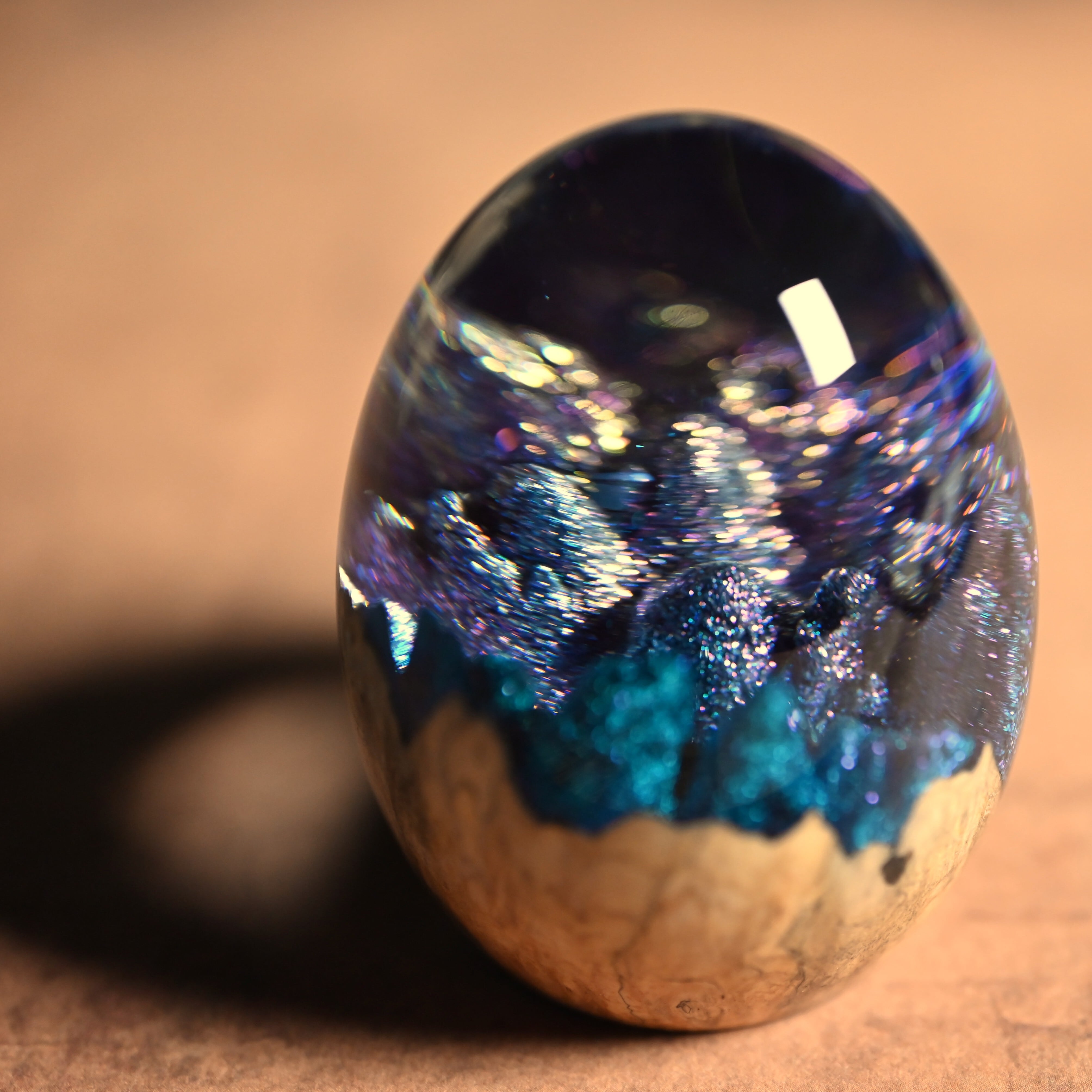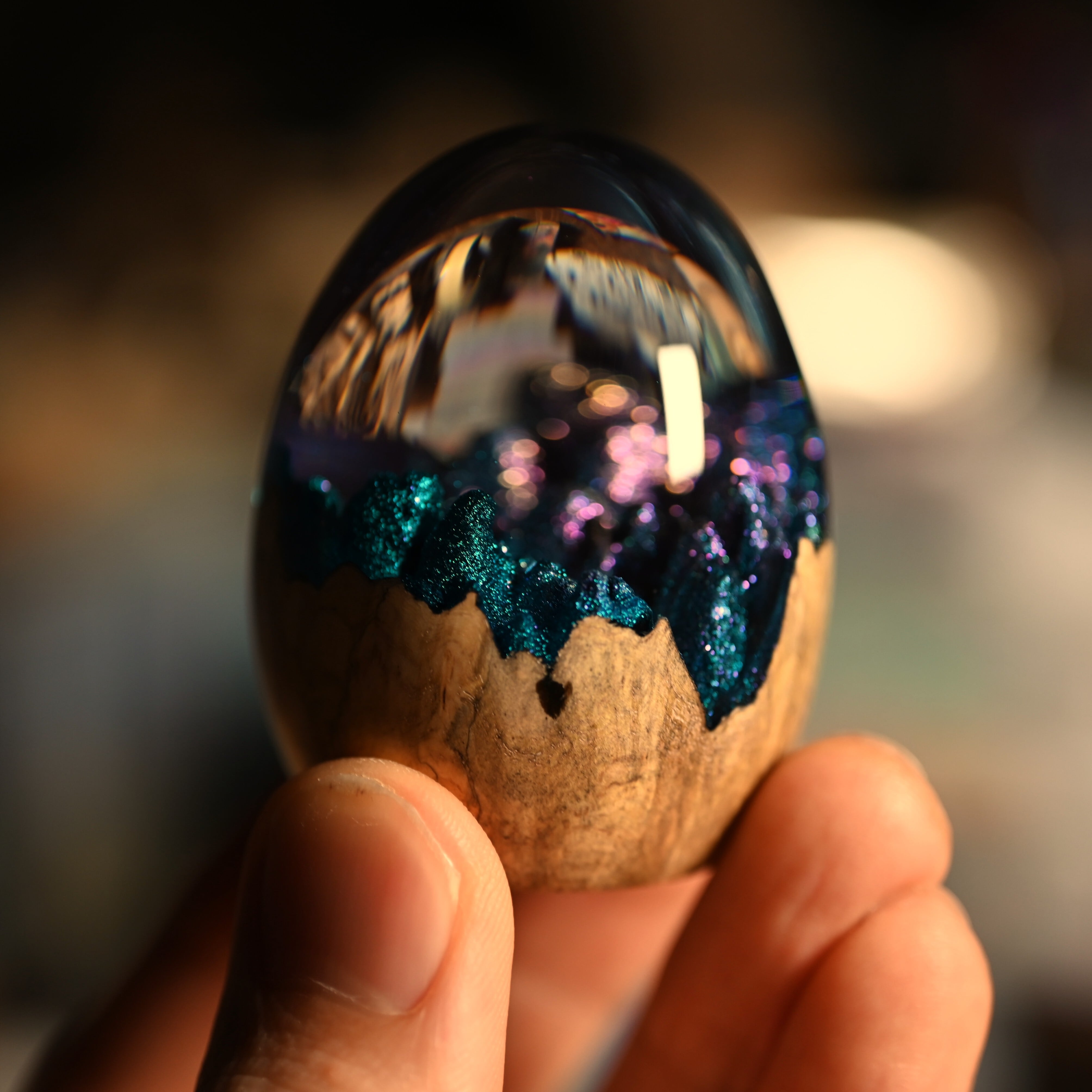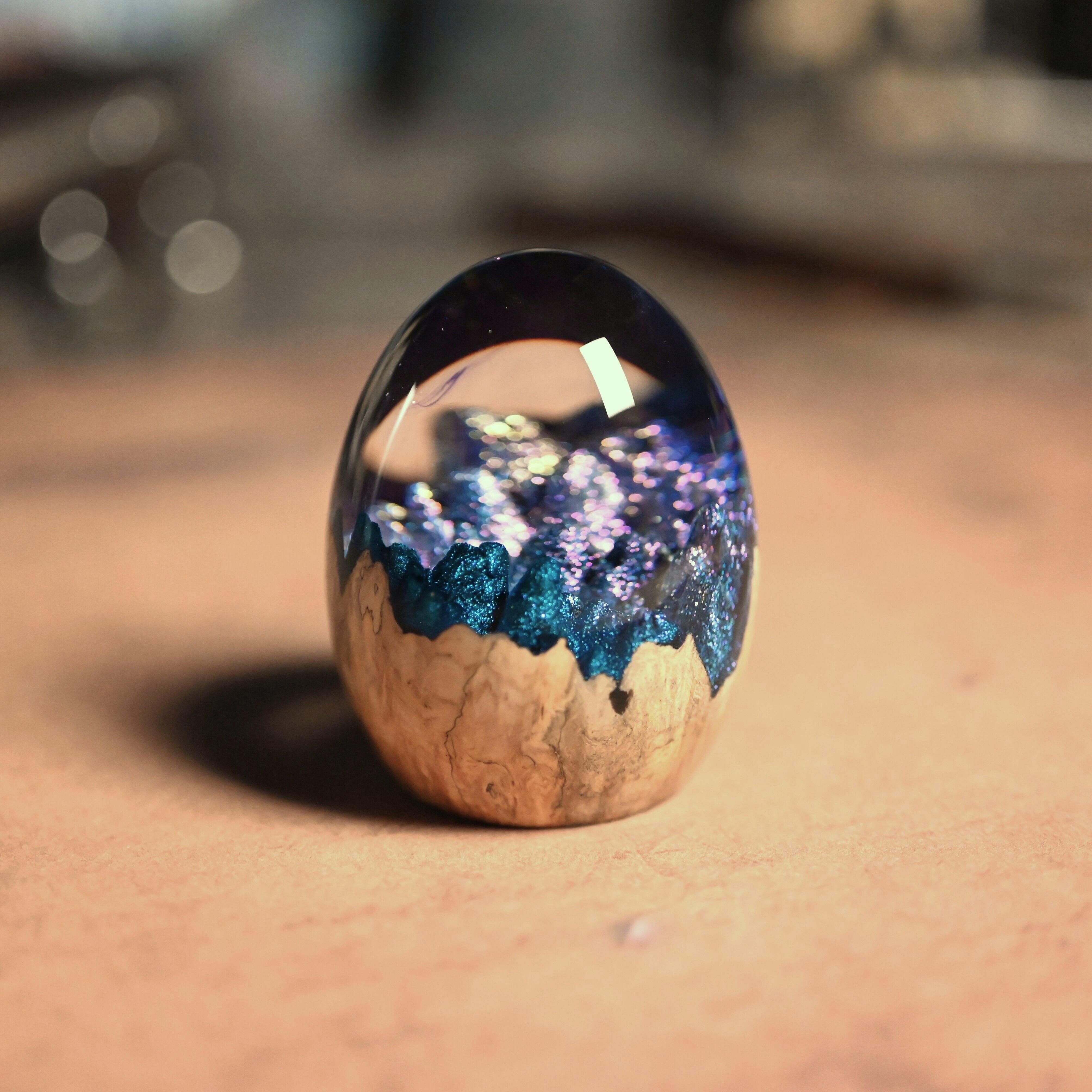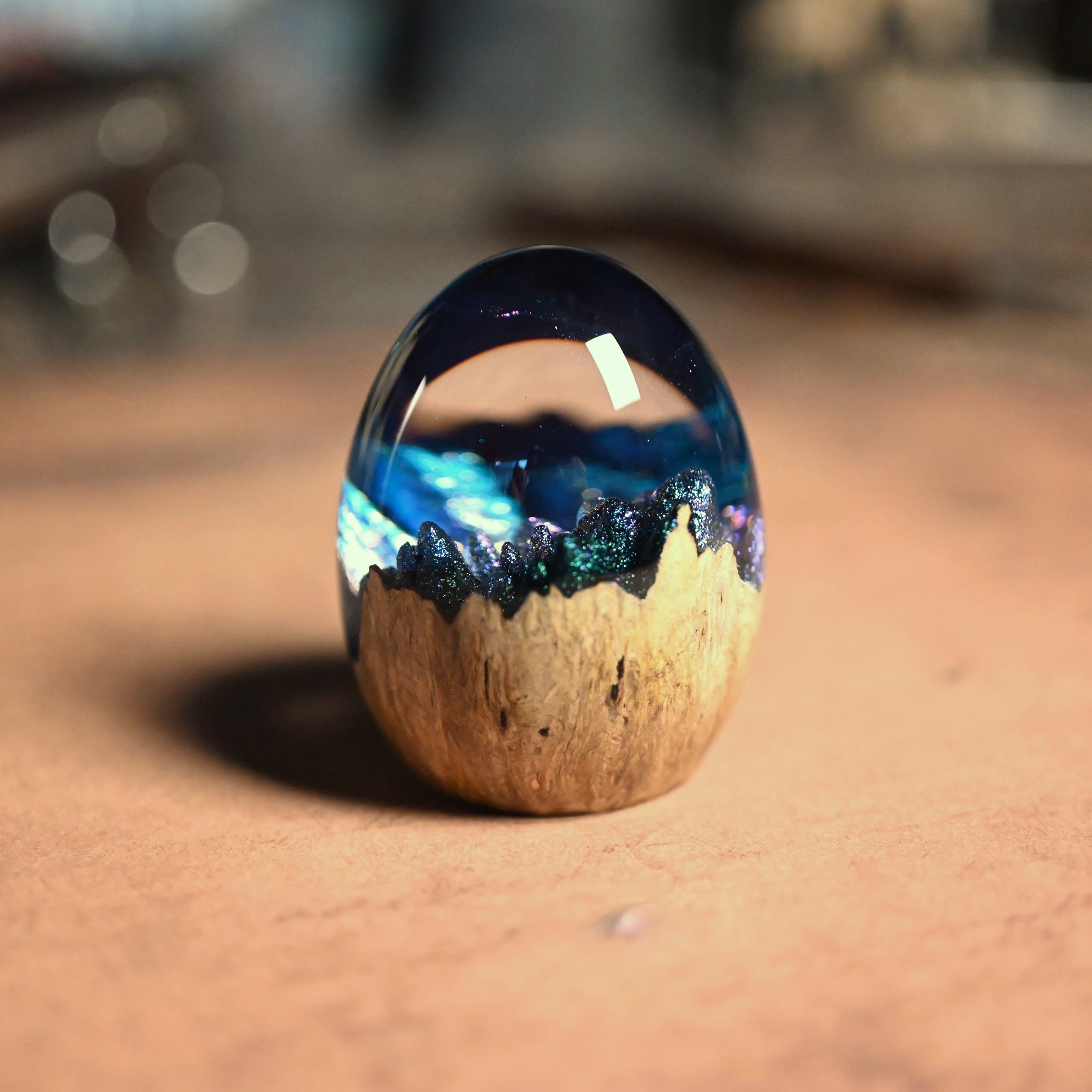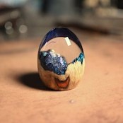 木と樹脂を組み合わせ1つ1つ手作りで仕上げた卵形オブジェ(ペーパーウェイト)になります。