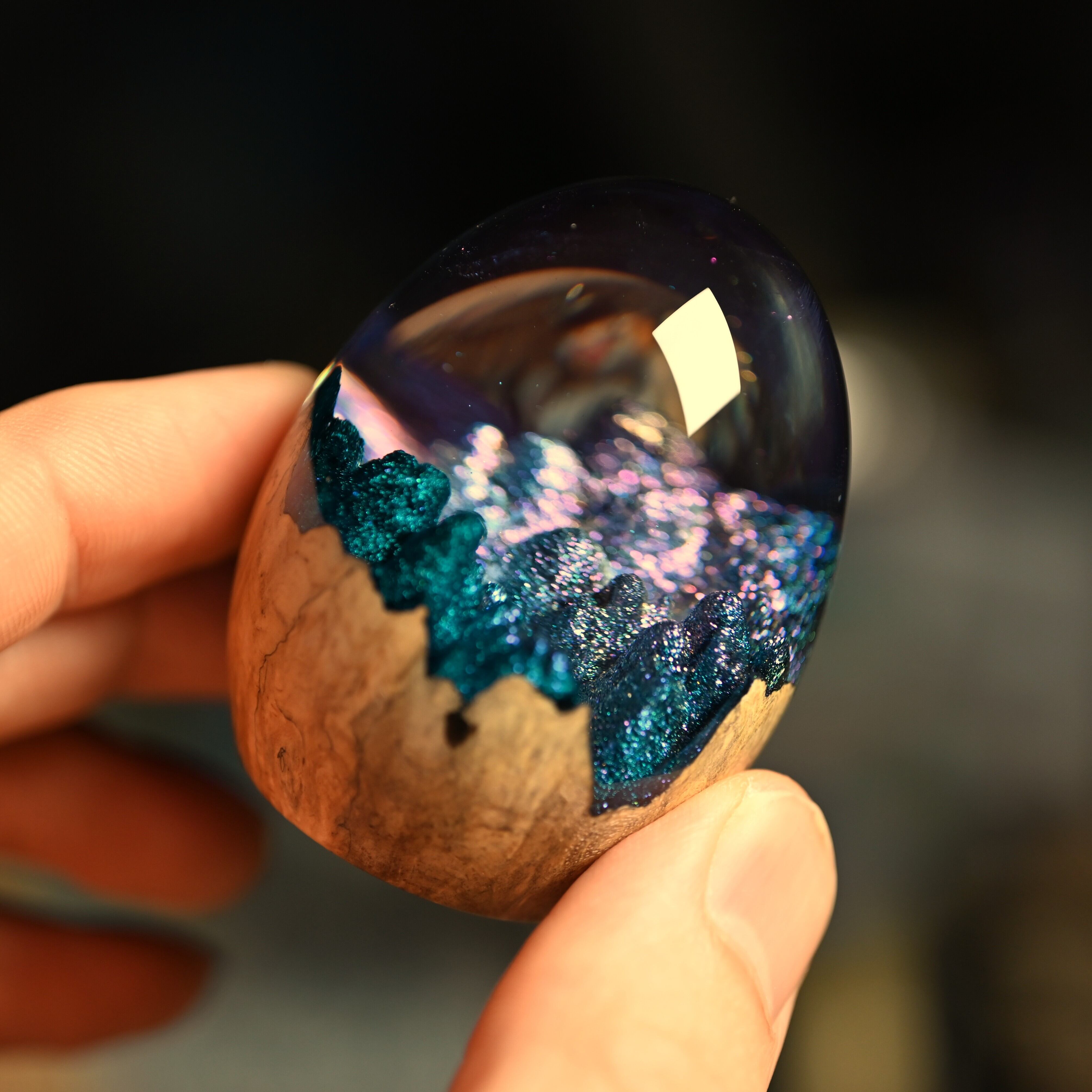 作品内部は景色をイメージし製作しており、より鮮明に魅せるためレジンの透明度と艶にこだわって仕上げました。