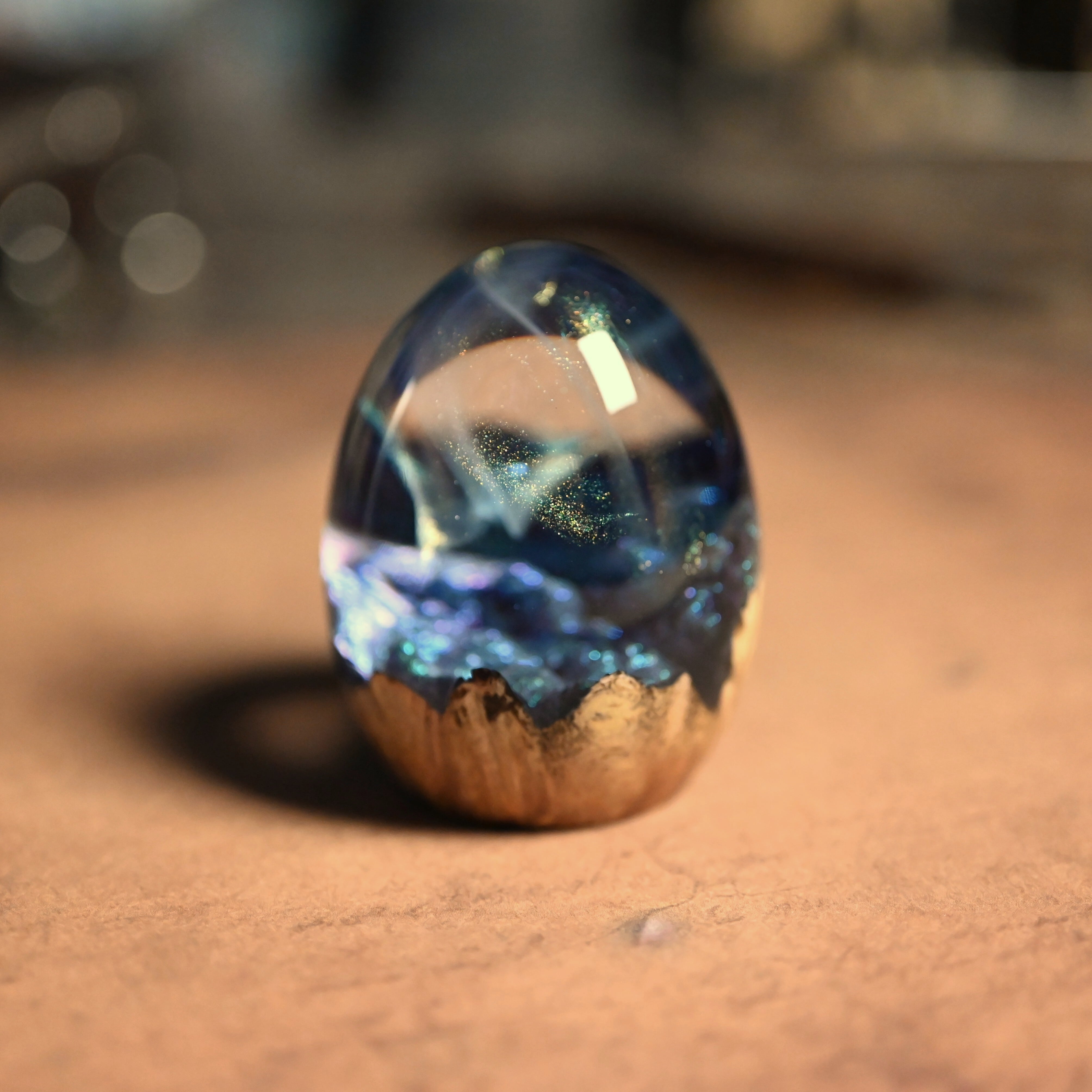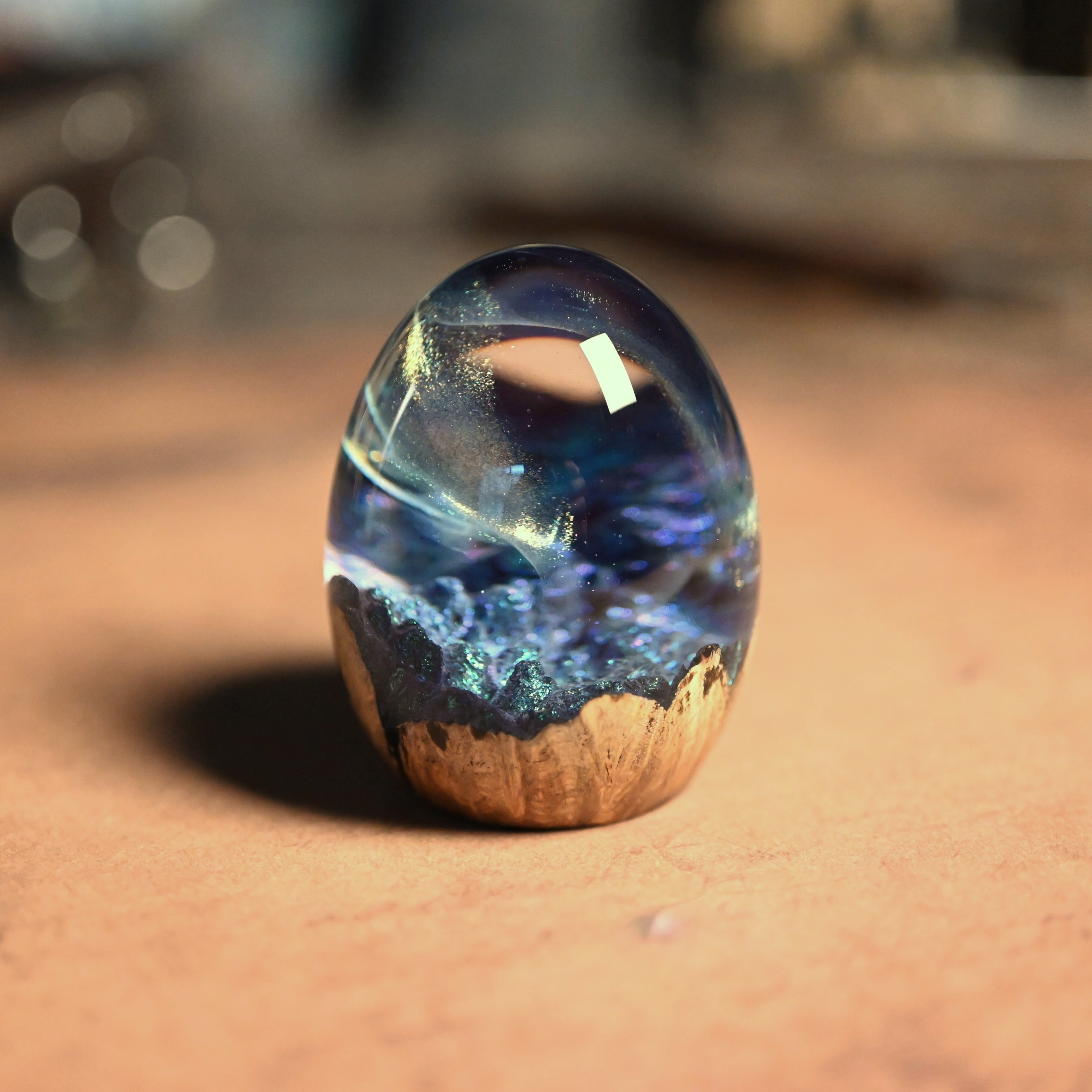 木と樹脂を組み合わせ1つ1つ手作りで仕上げた卵形オブジェ(ペーパーウェイト)になります。