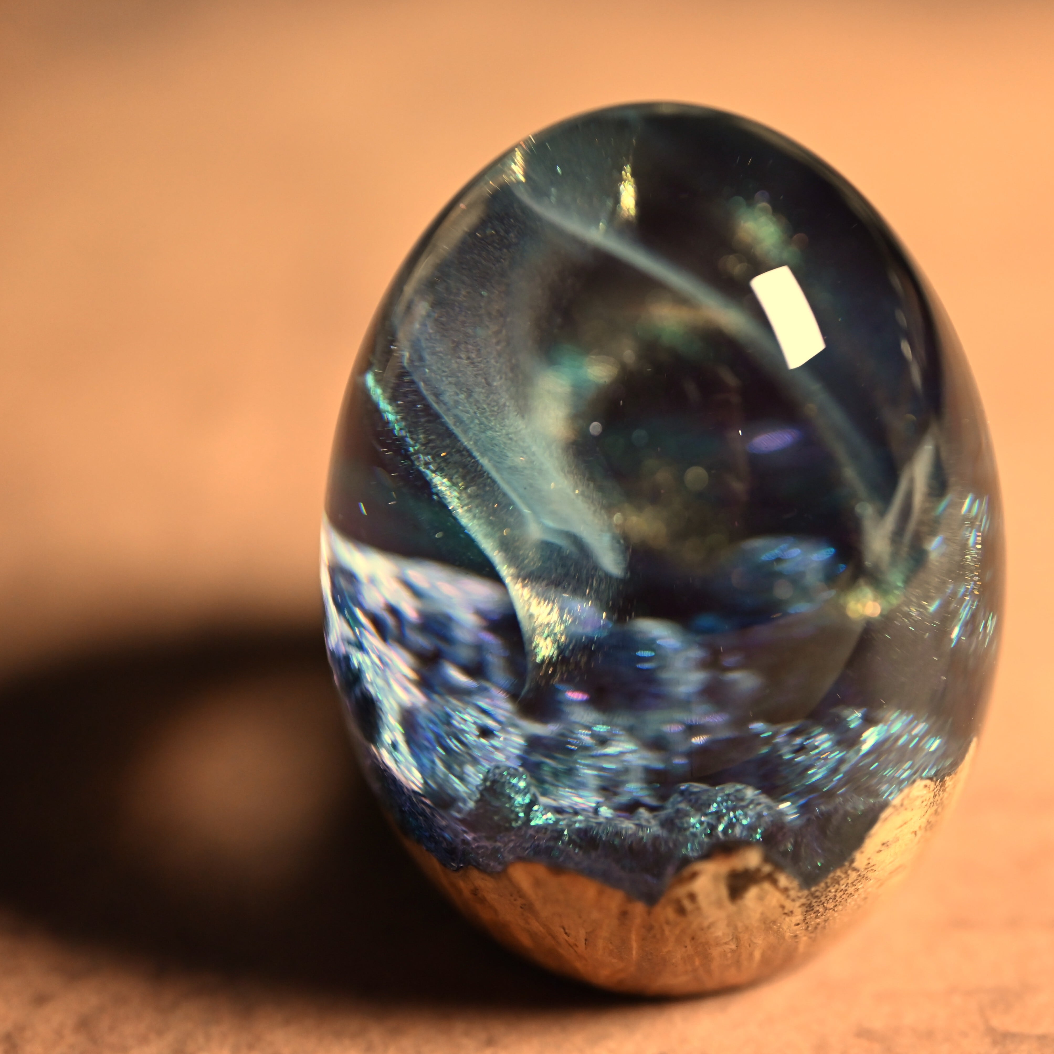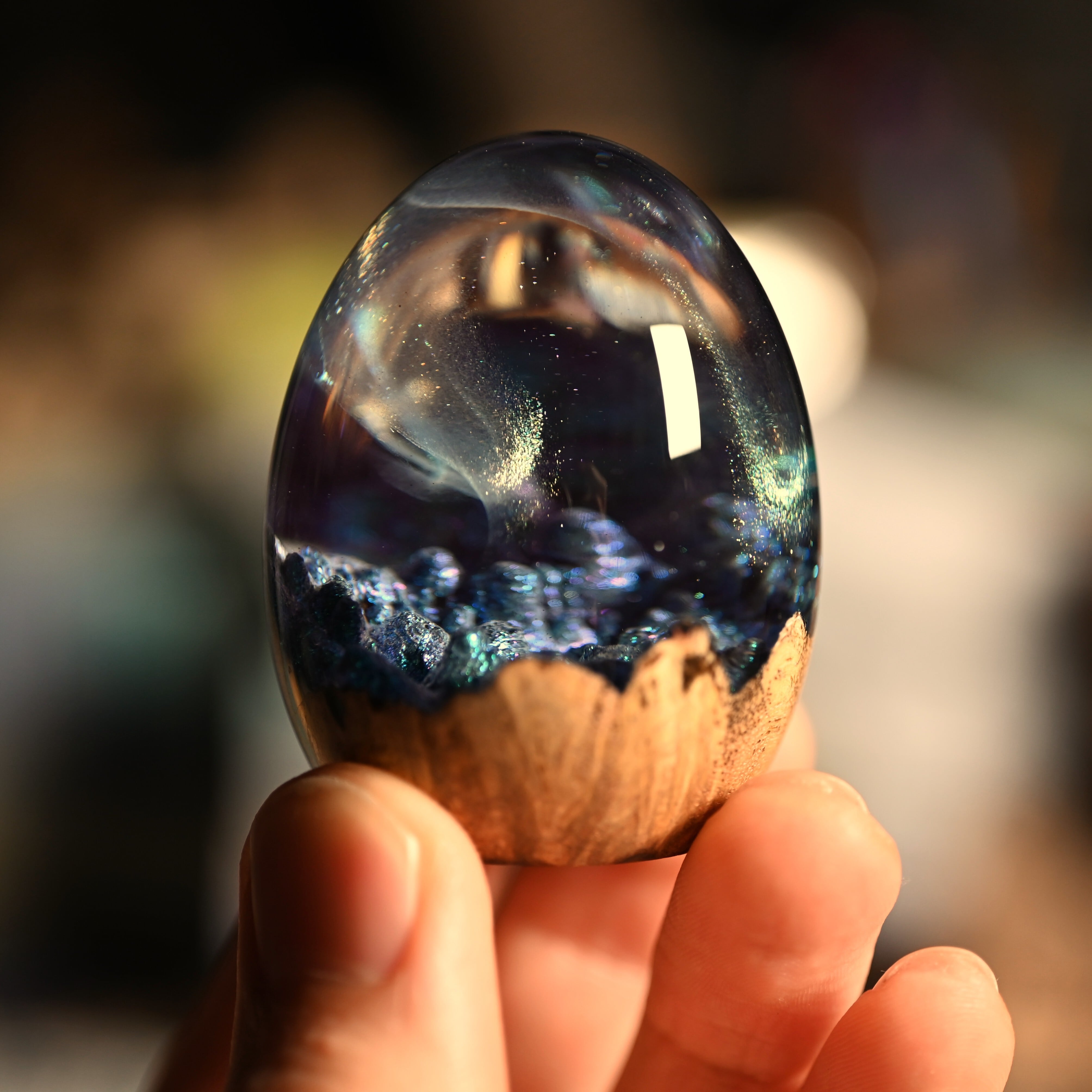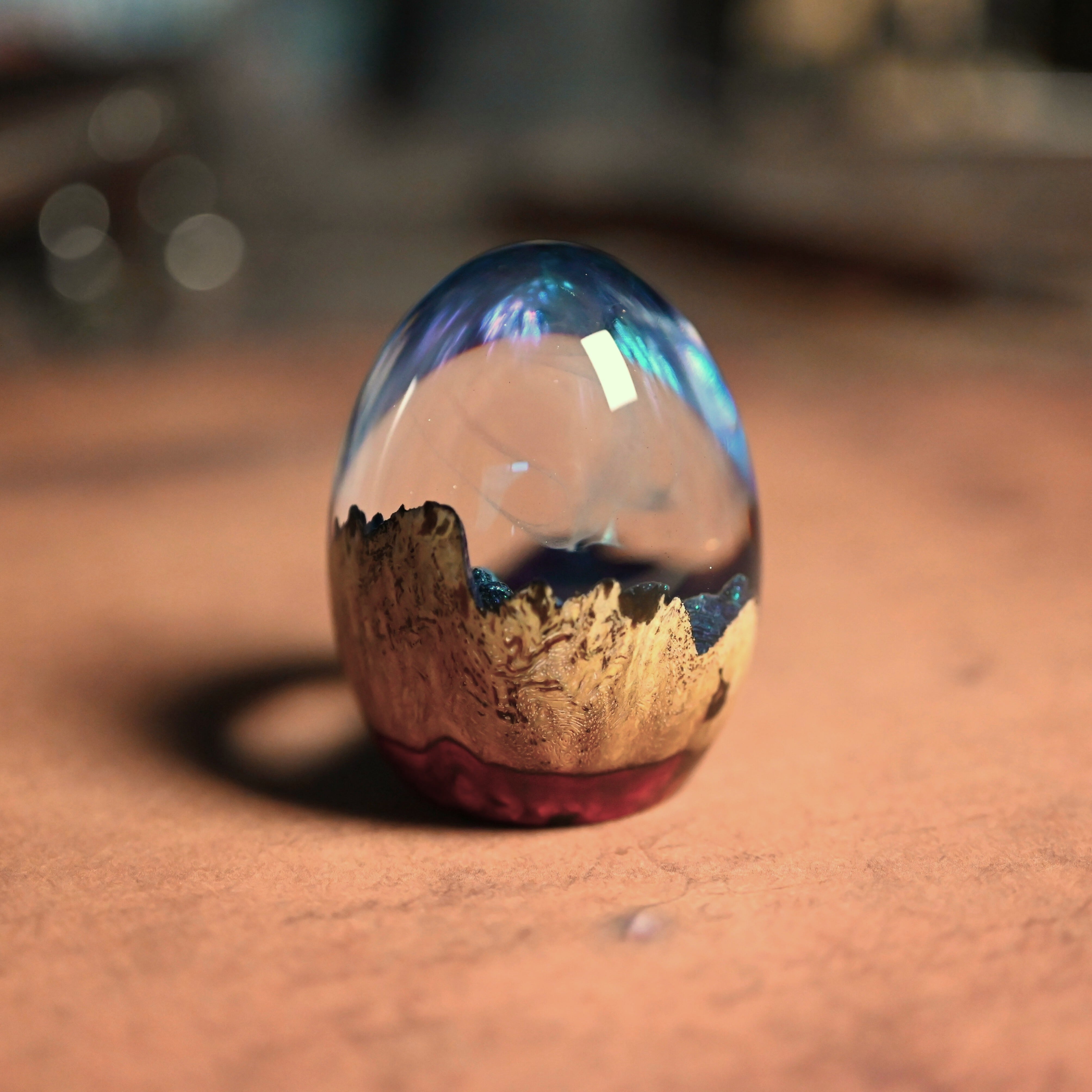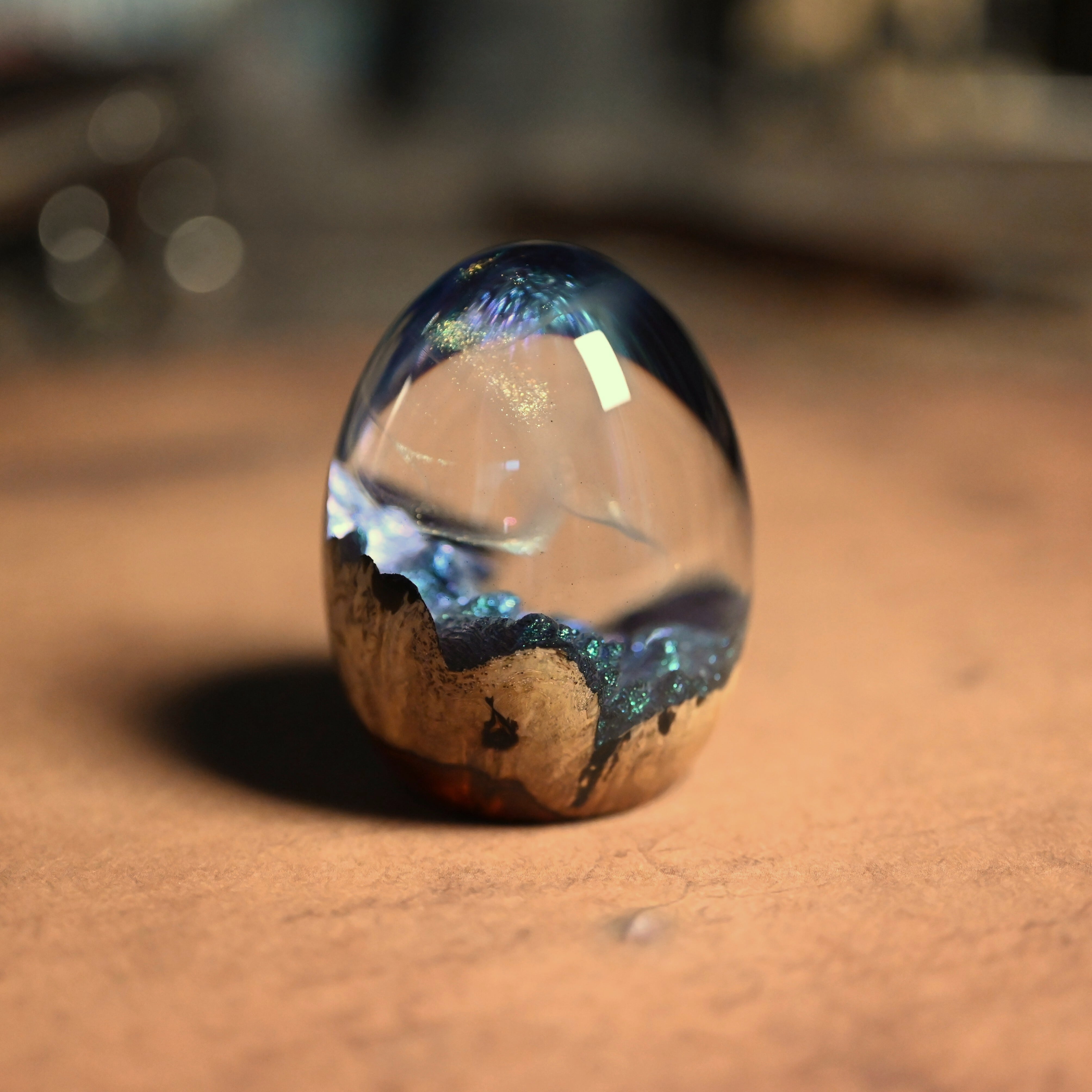 作品内部は景色をイメージし製作しており、より鮮明に魅せるためレジンの透明度と艶にこだわって仕上げました。