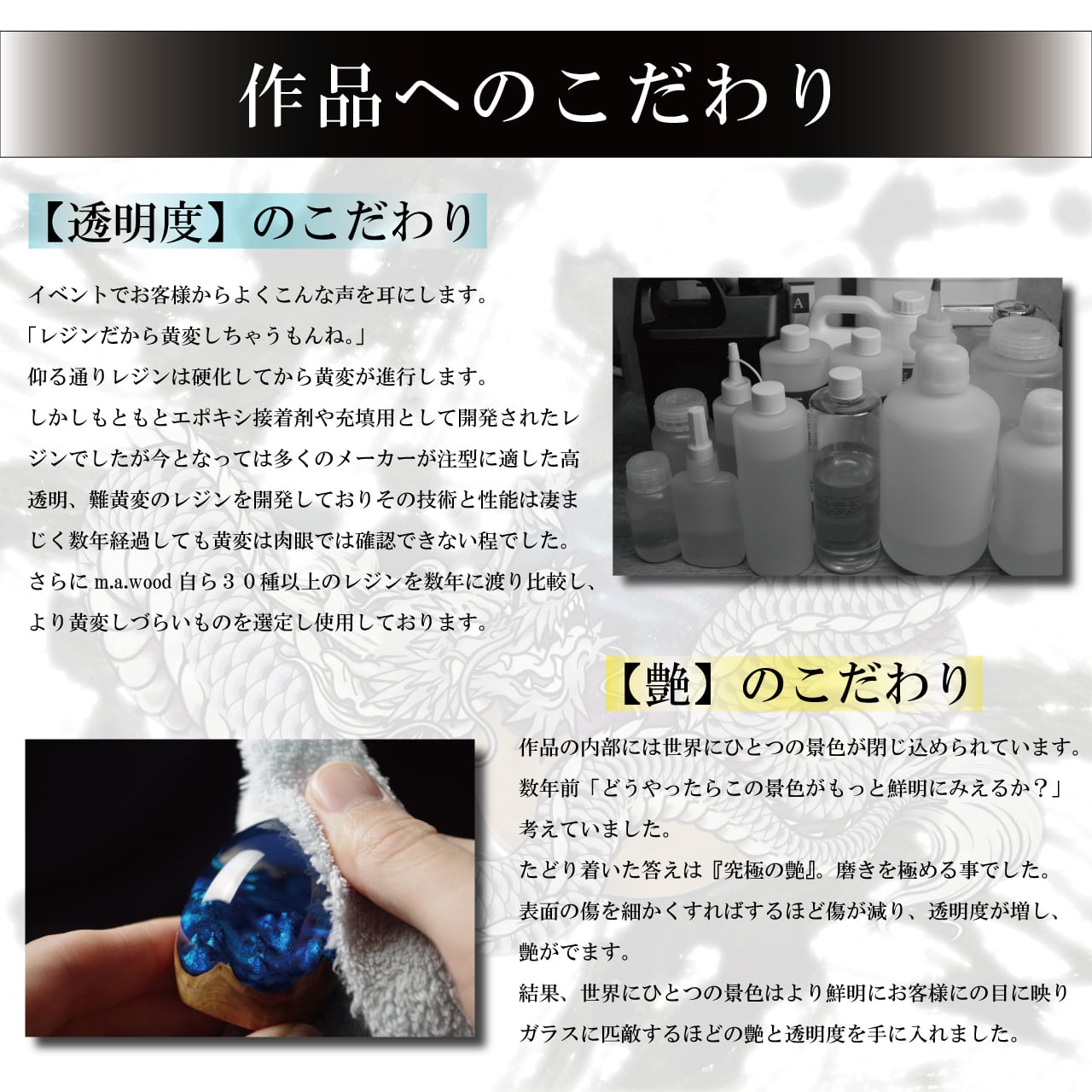 ・エポキシ樹脂の特性上、経年劣化で黄変が起こります。黄変の起こりづらいものを使用しておりますが樹脂の特性をご理解いただいた上ご購入ください。