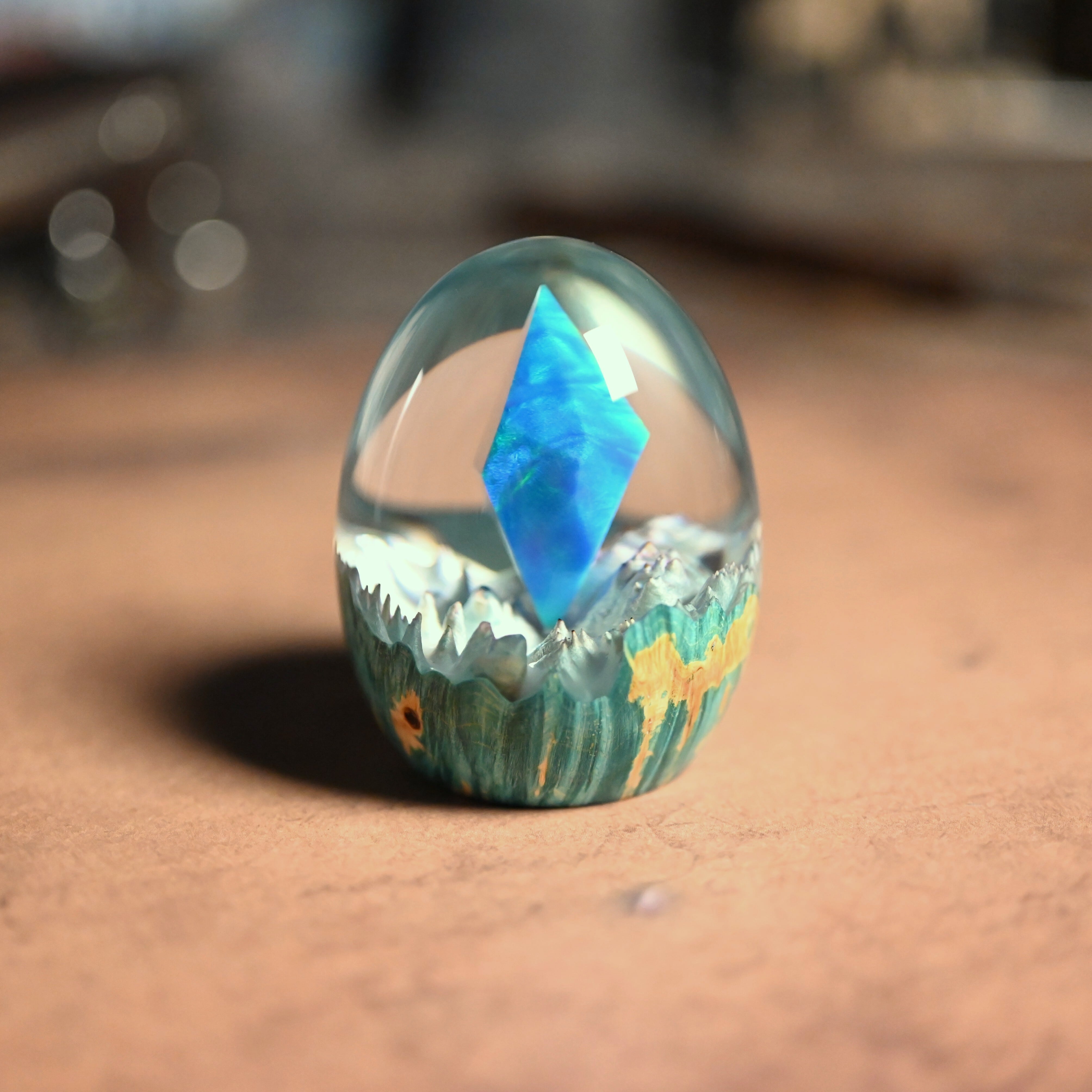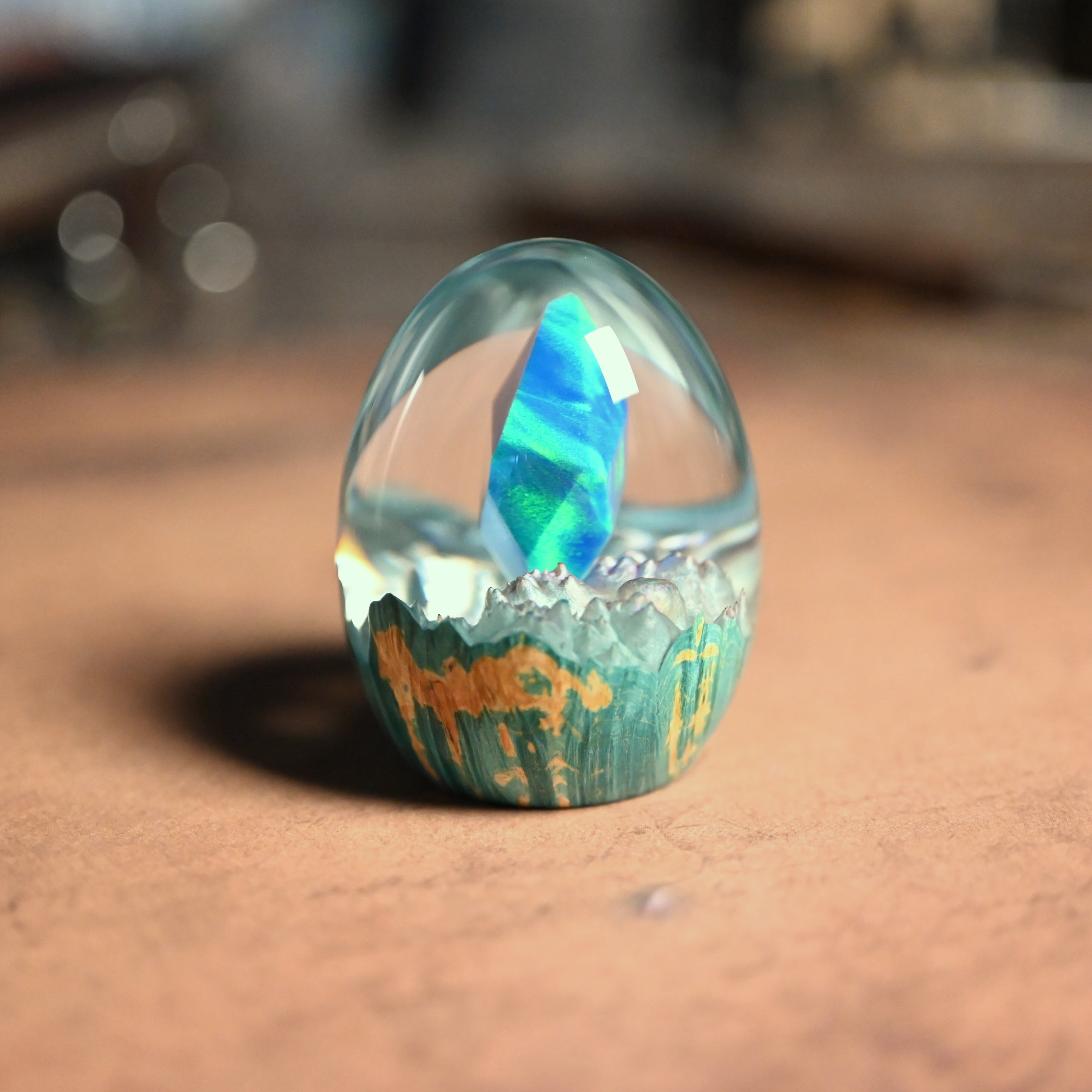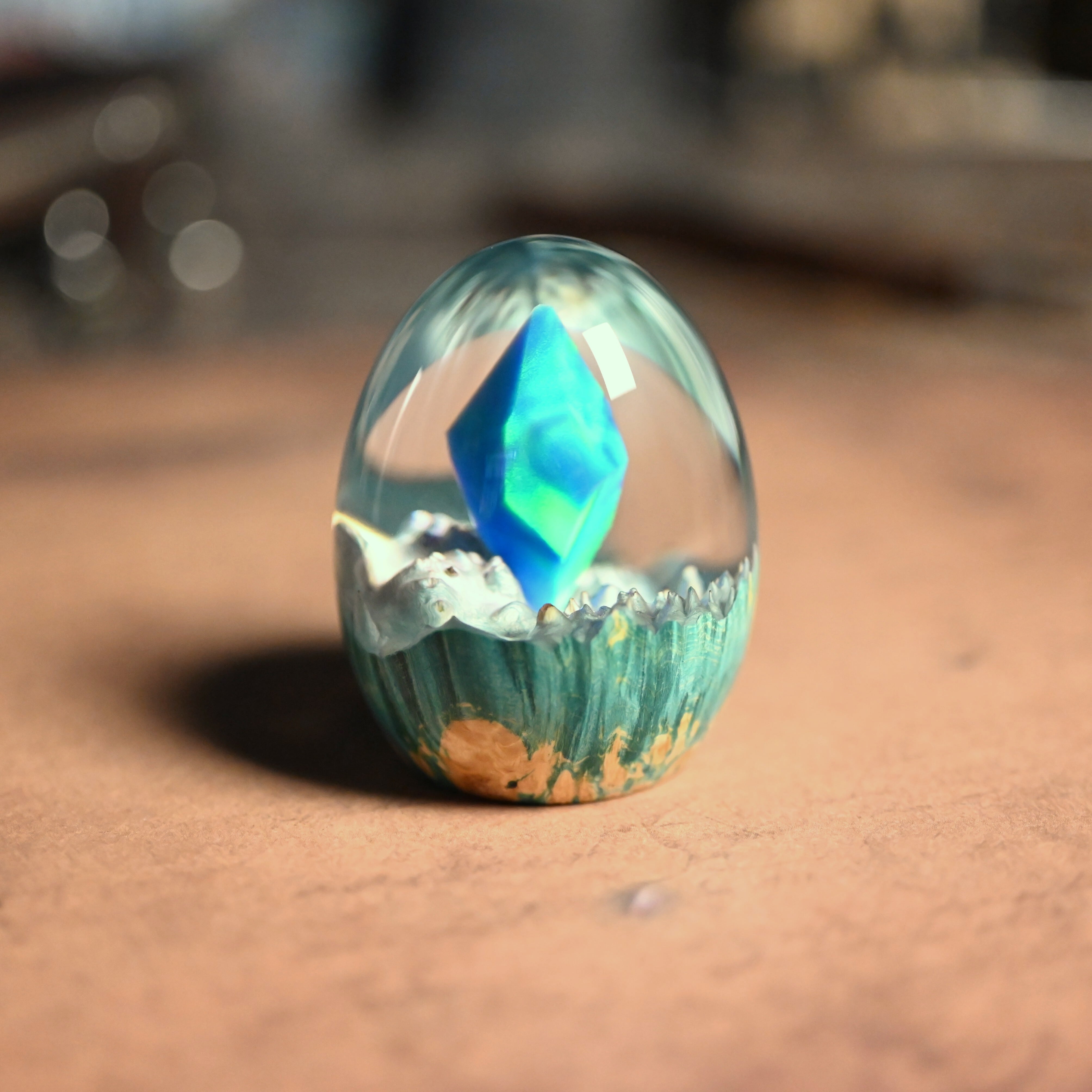 作品内部は景色をイメージし製作しており、より鮮明に魅せるためレジンの透明度と艶にこだわって仕上げました。