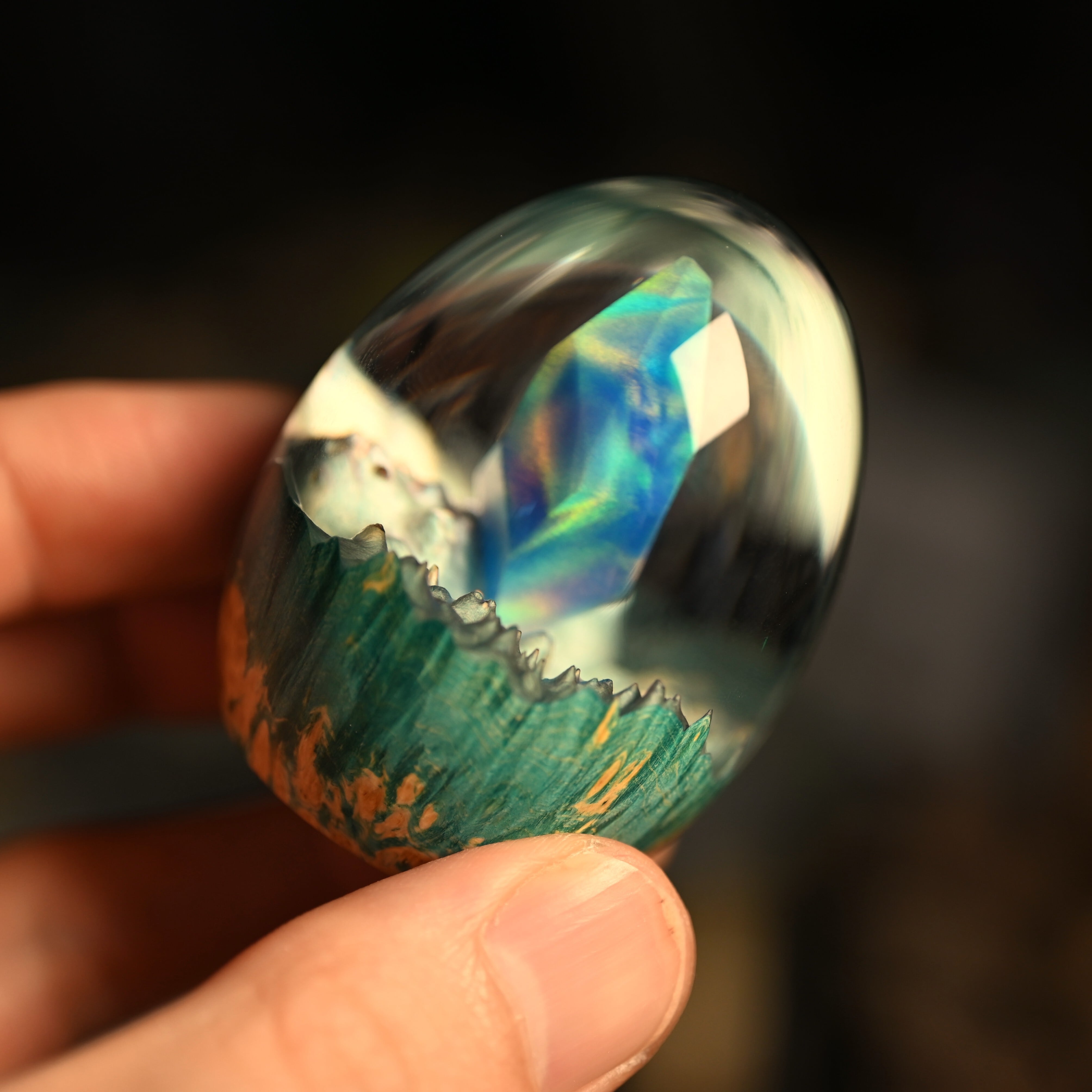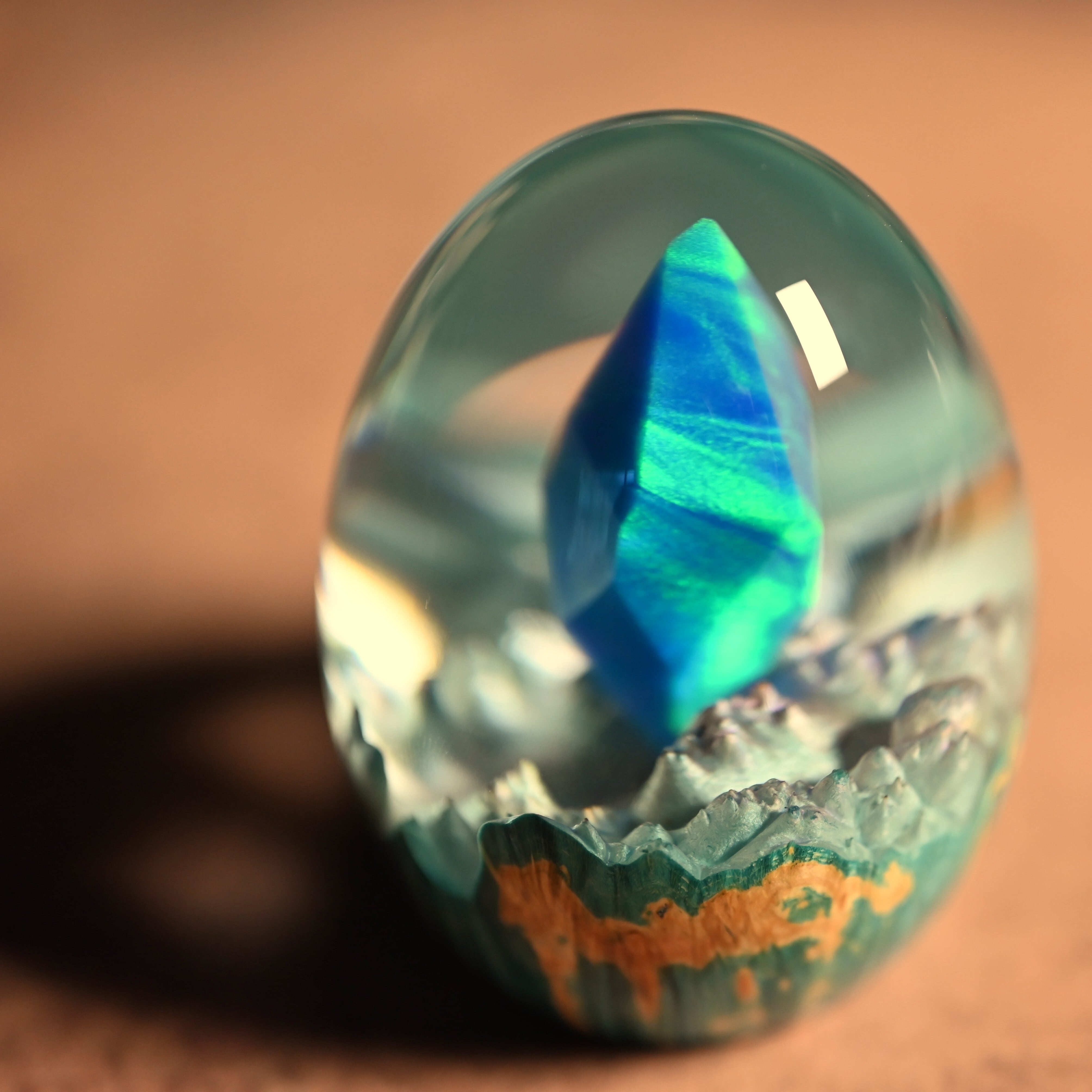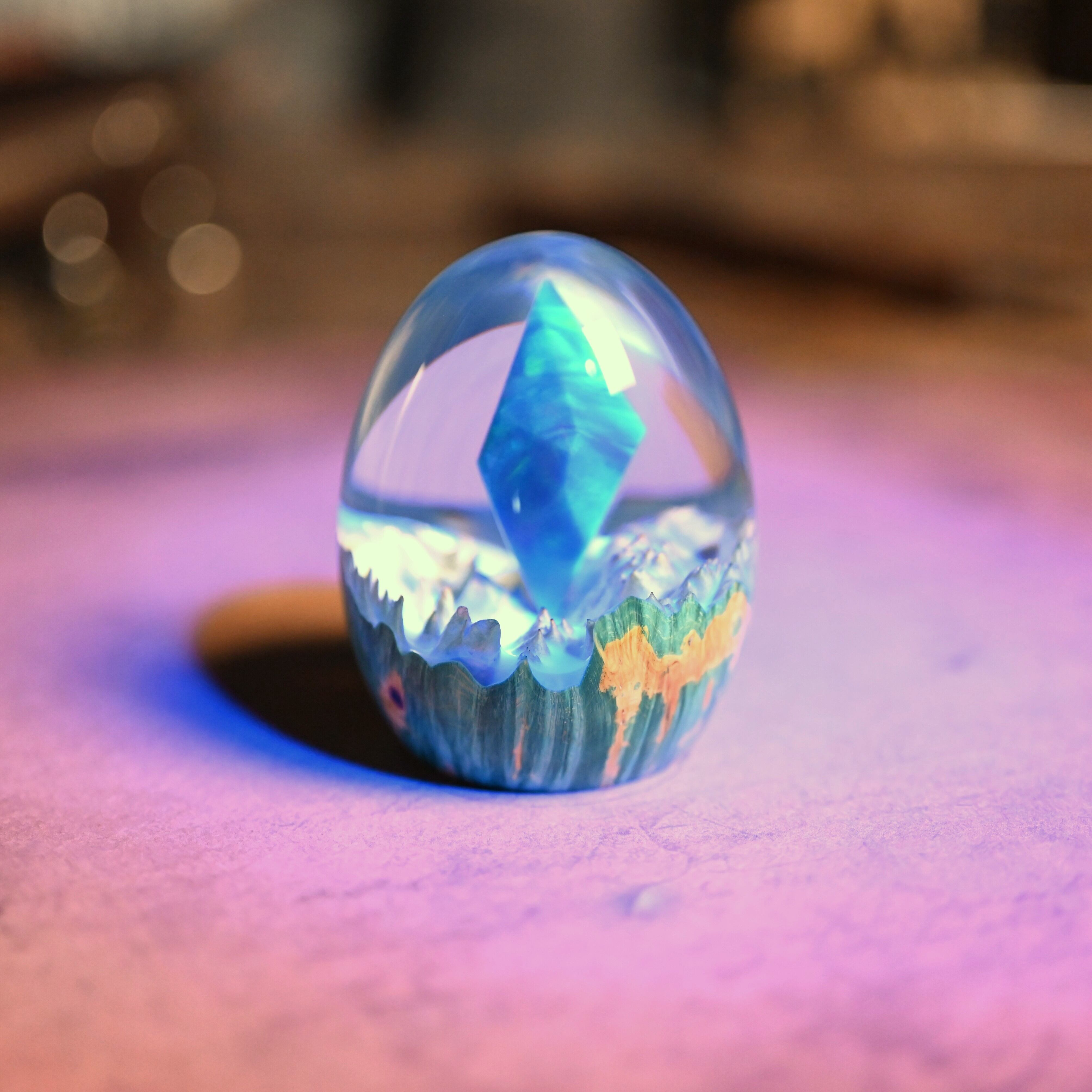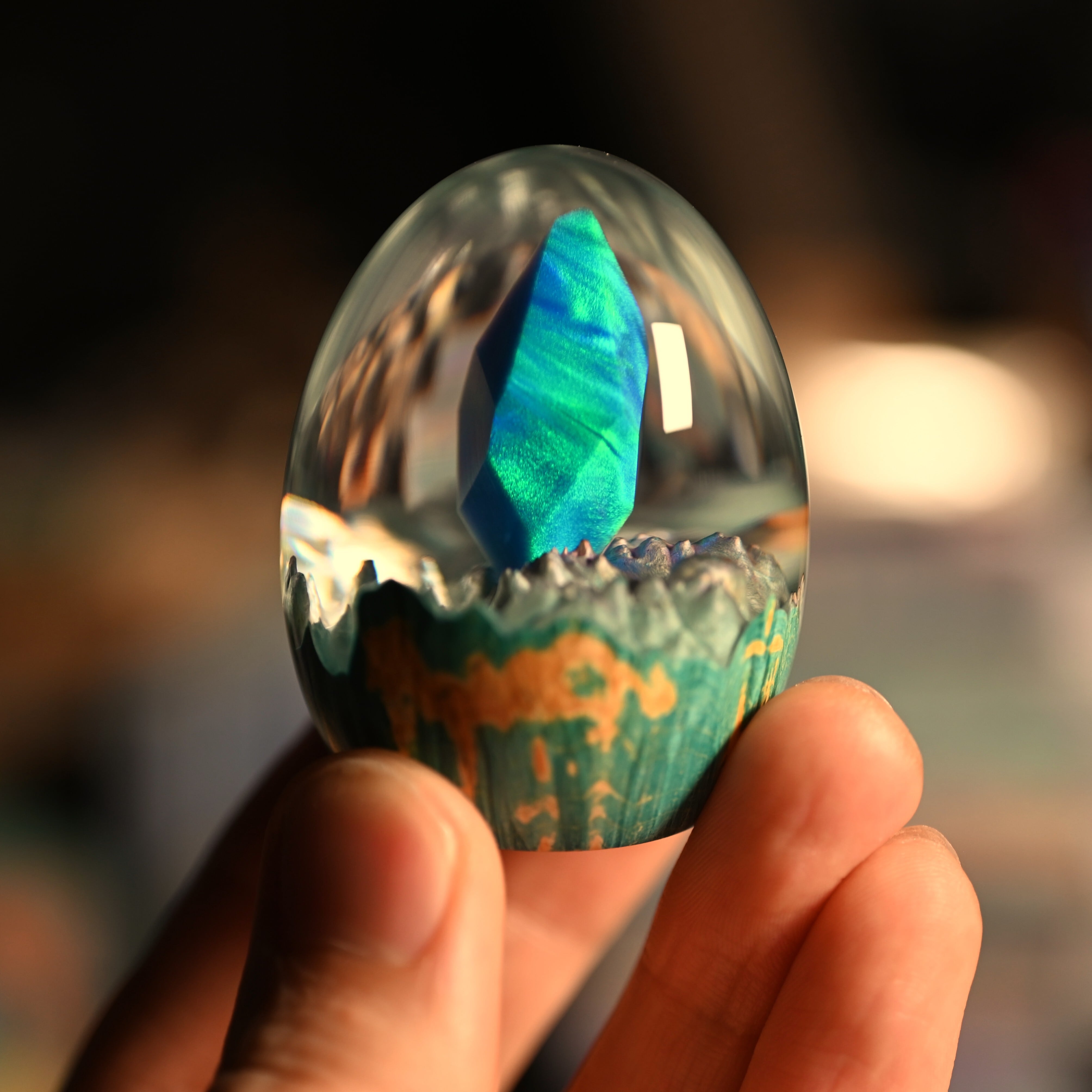 作品内部は景色をイメージし製作しており、より鮮明に魅せるためレジンの透明度と艶にこだわって仕上げました。