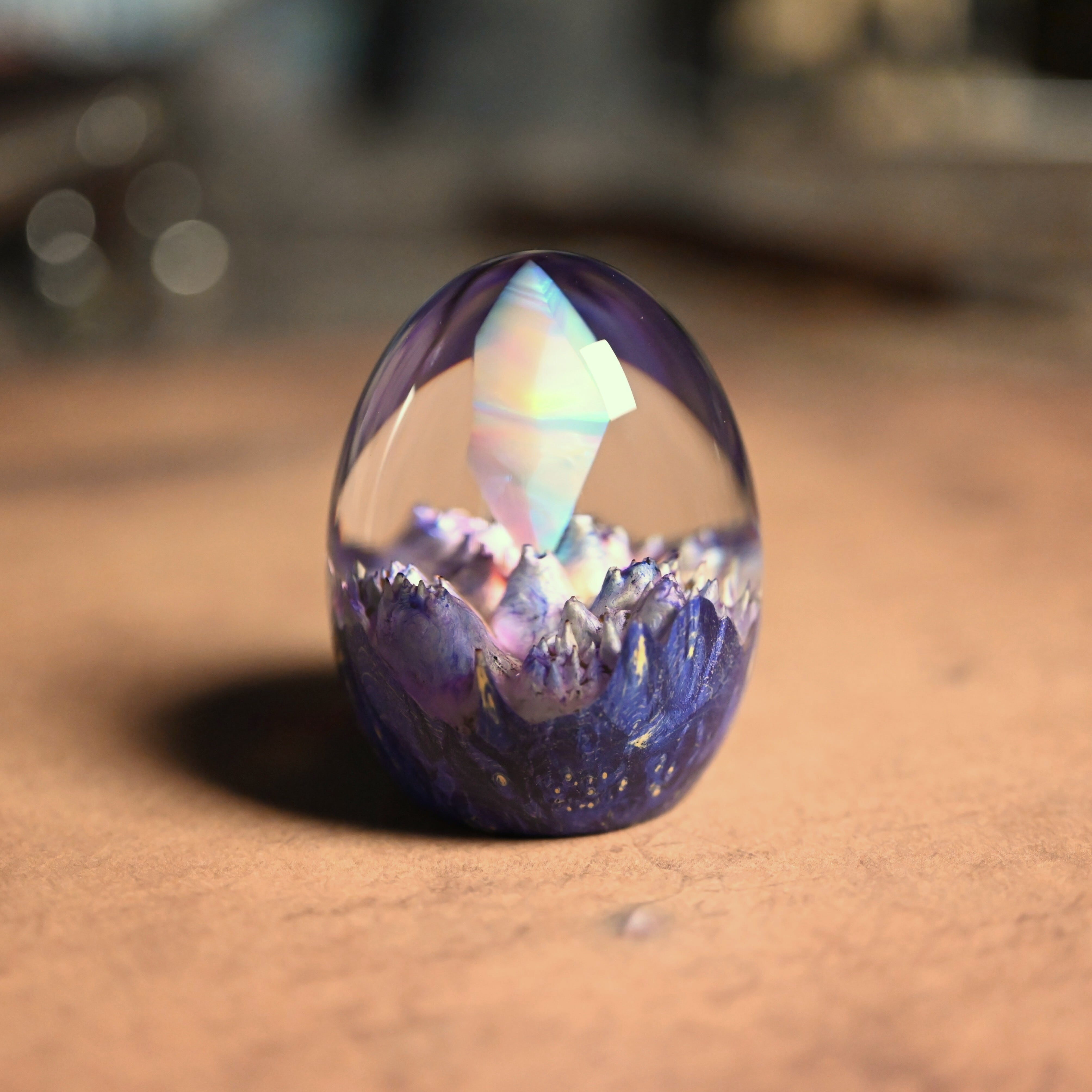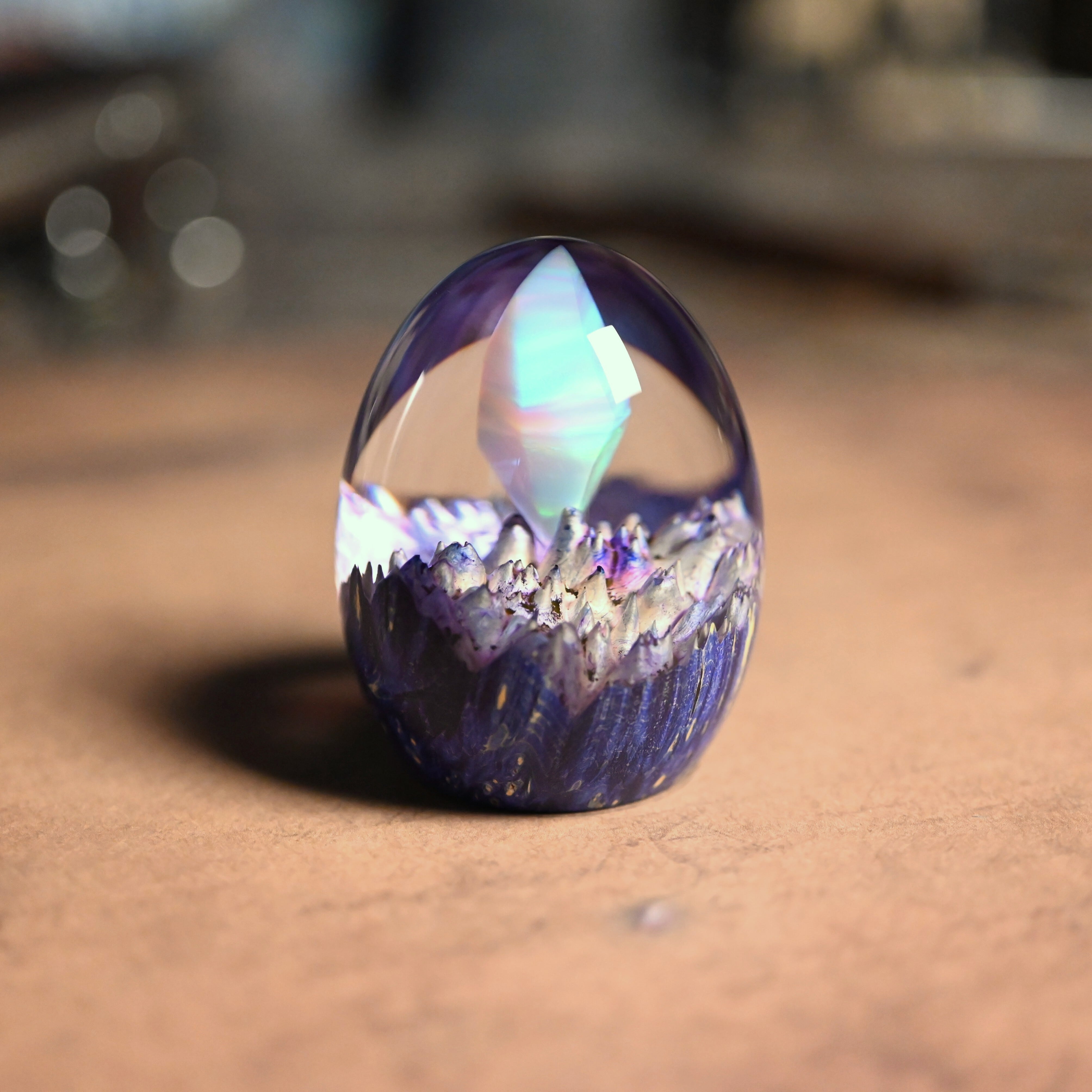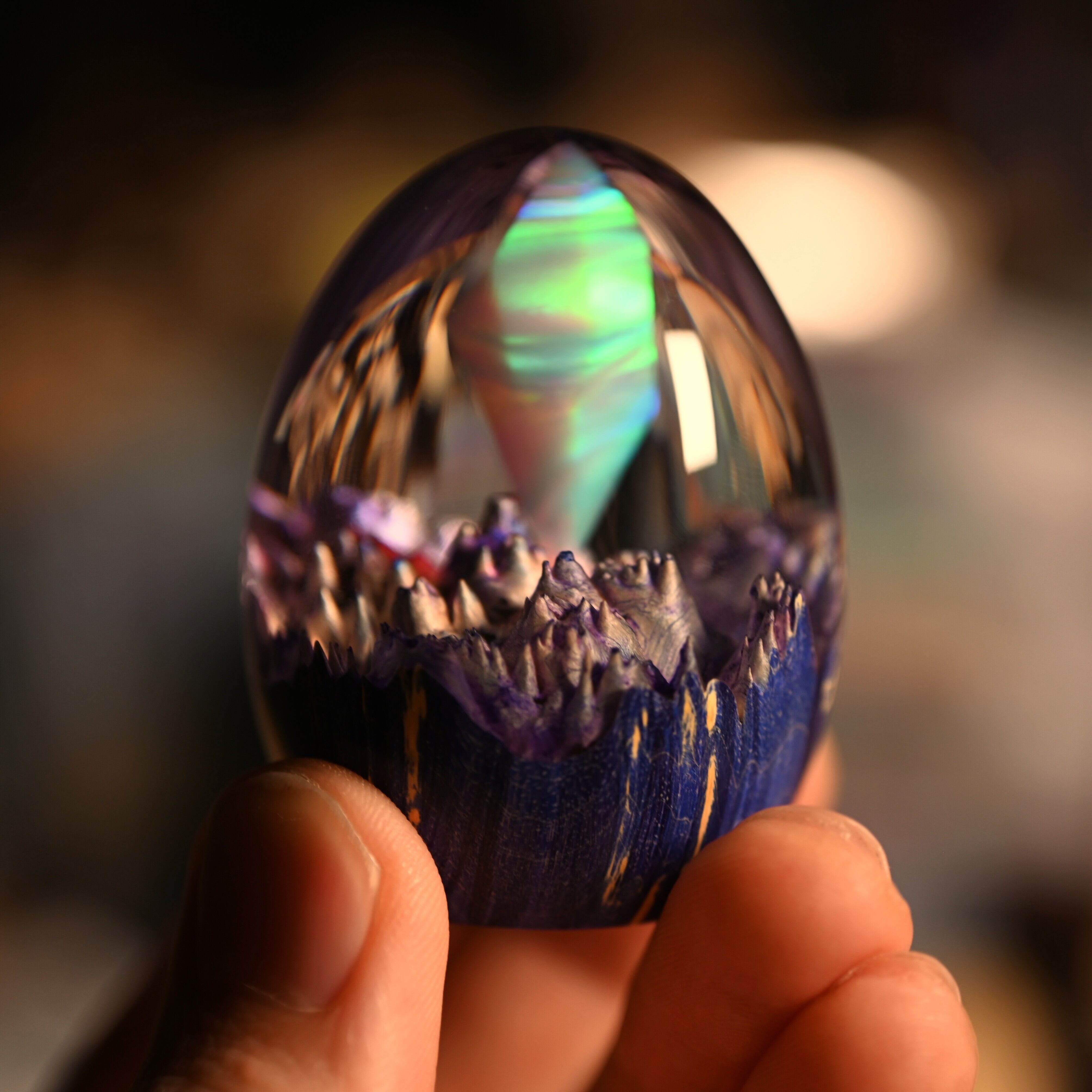作品内部は景色をイメージし製作しており、より鮮明に魅せるためレジンの透明度と艶にこだわって仕上げました。