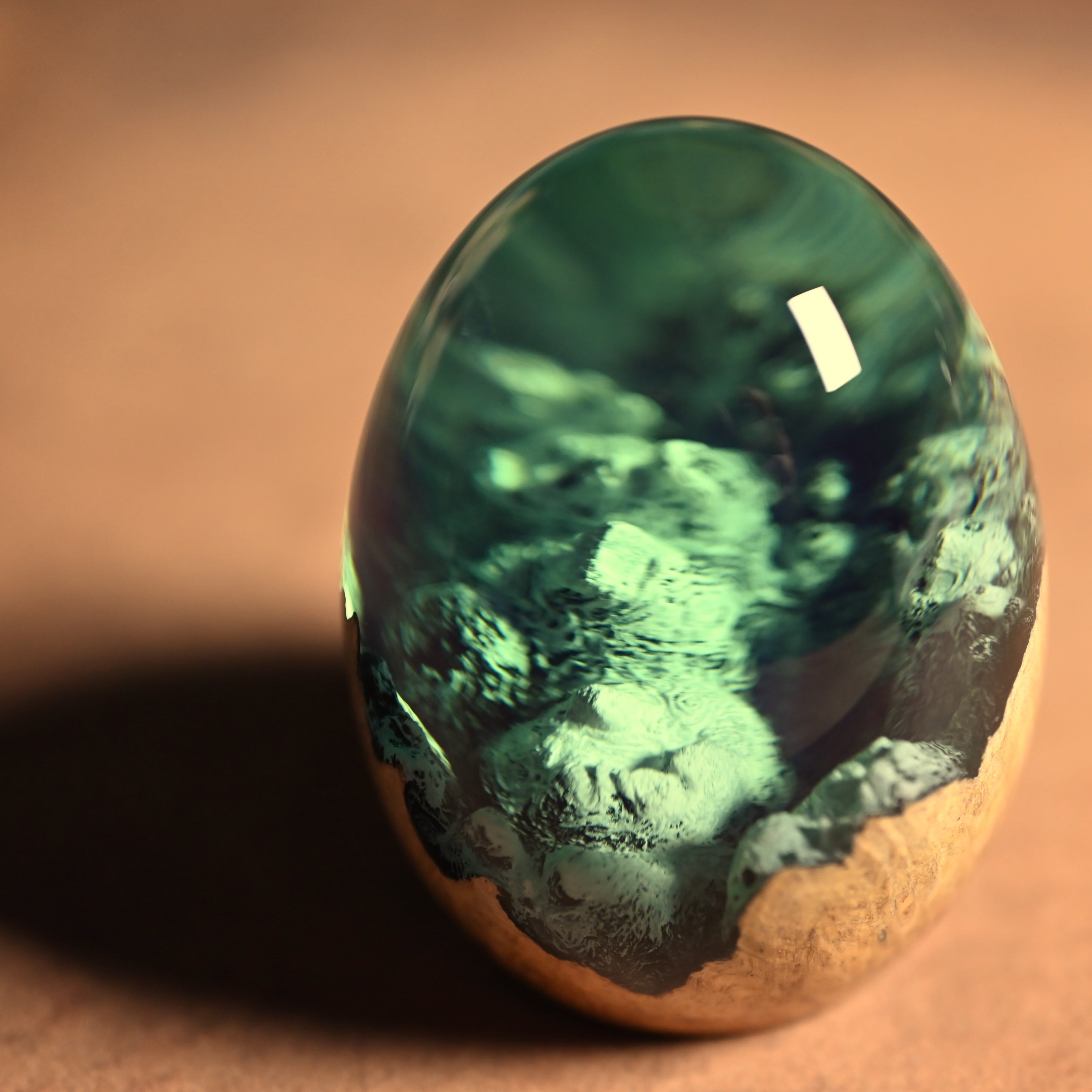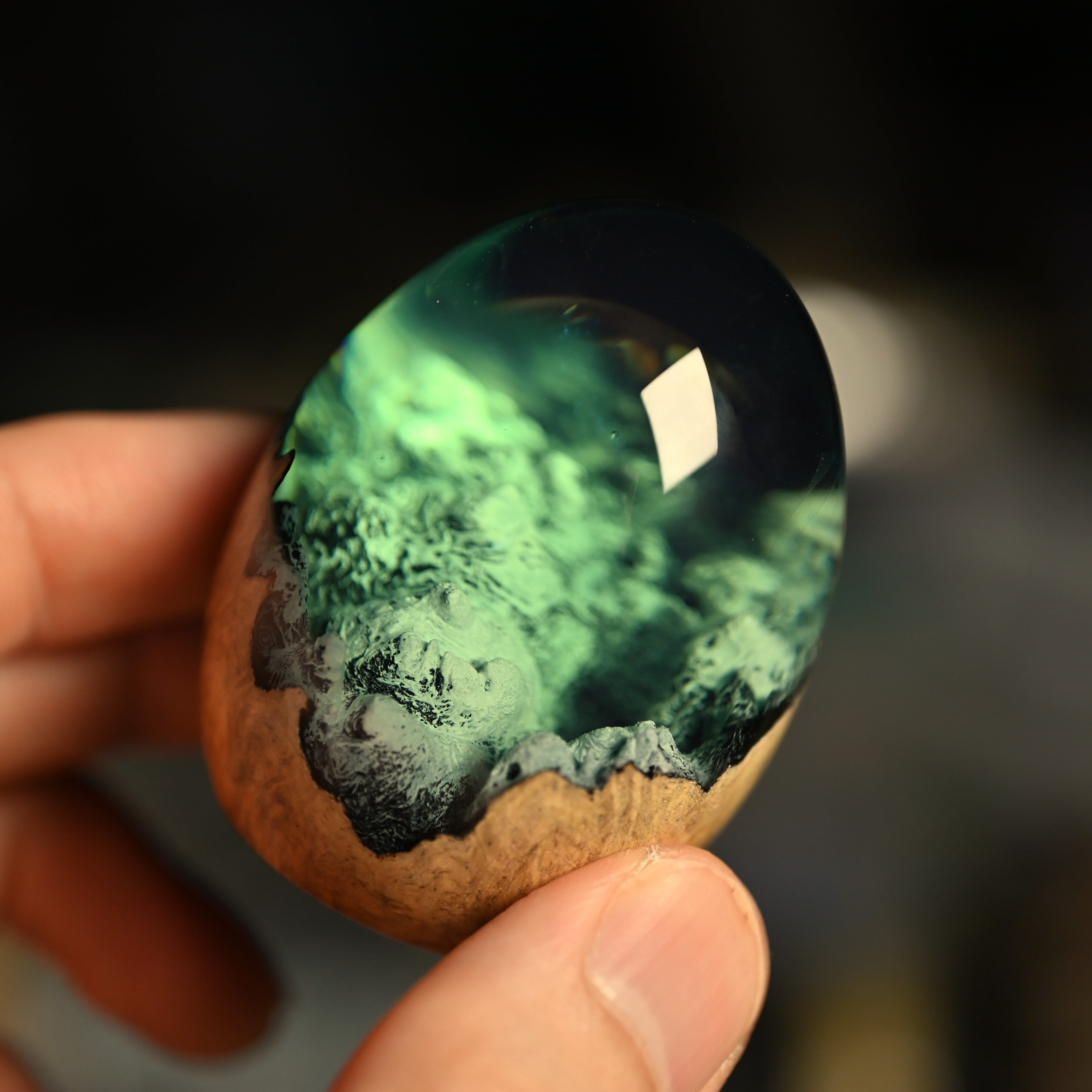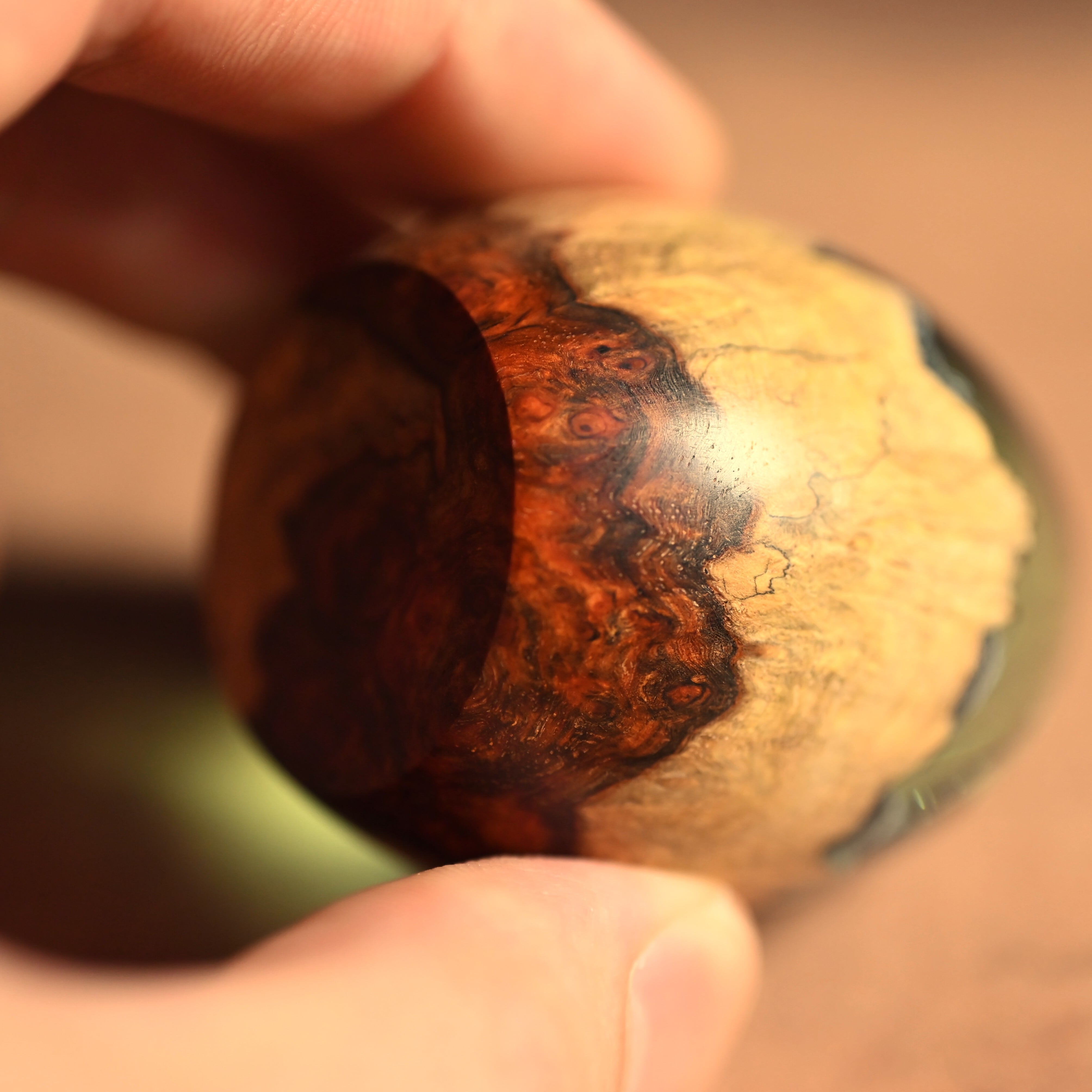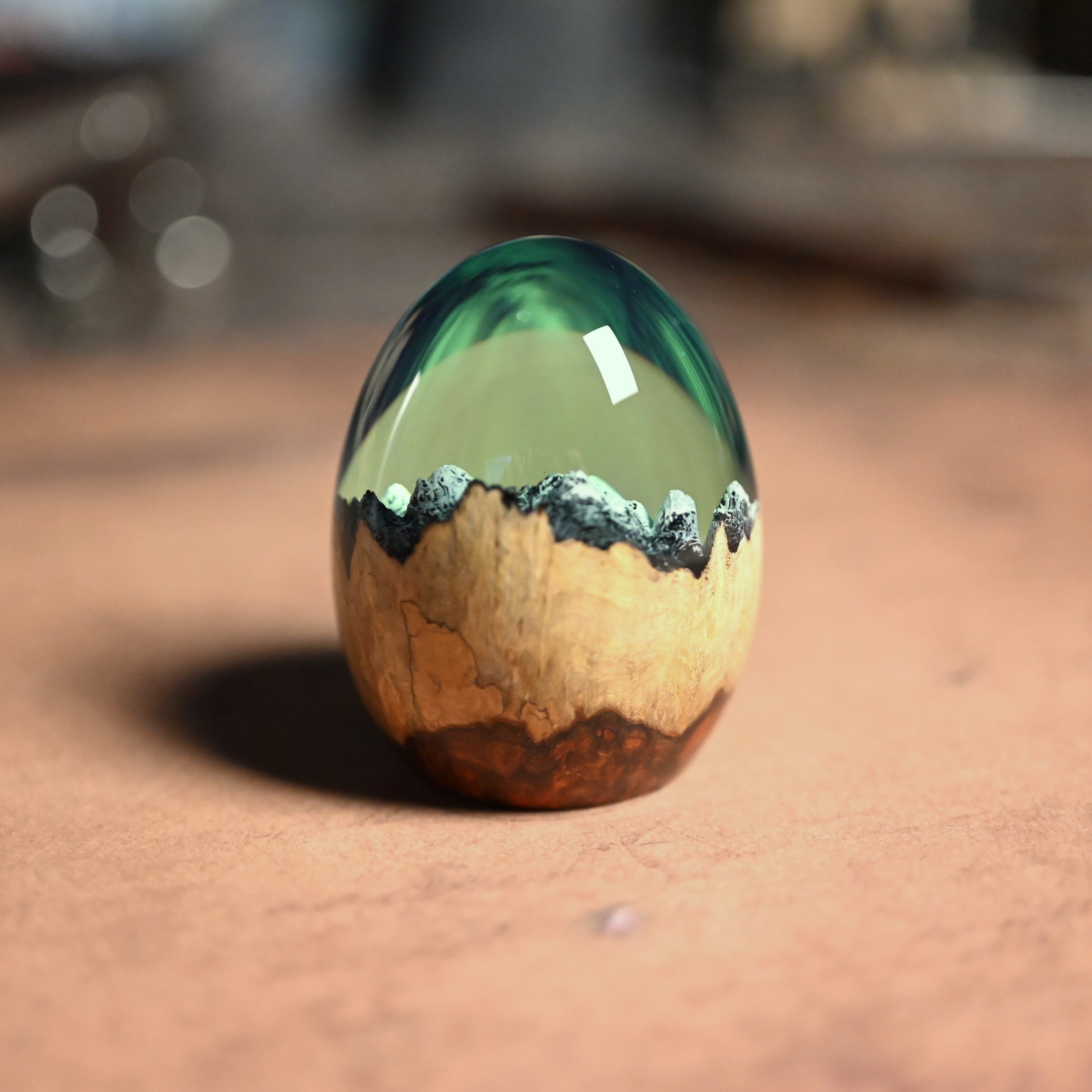 木と樹脂を組み合わせ1つ1つ手作りで仕上げた卵形オブジェ(ペーパーウェイト)になります。