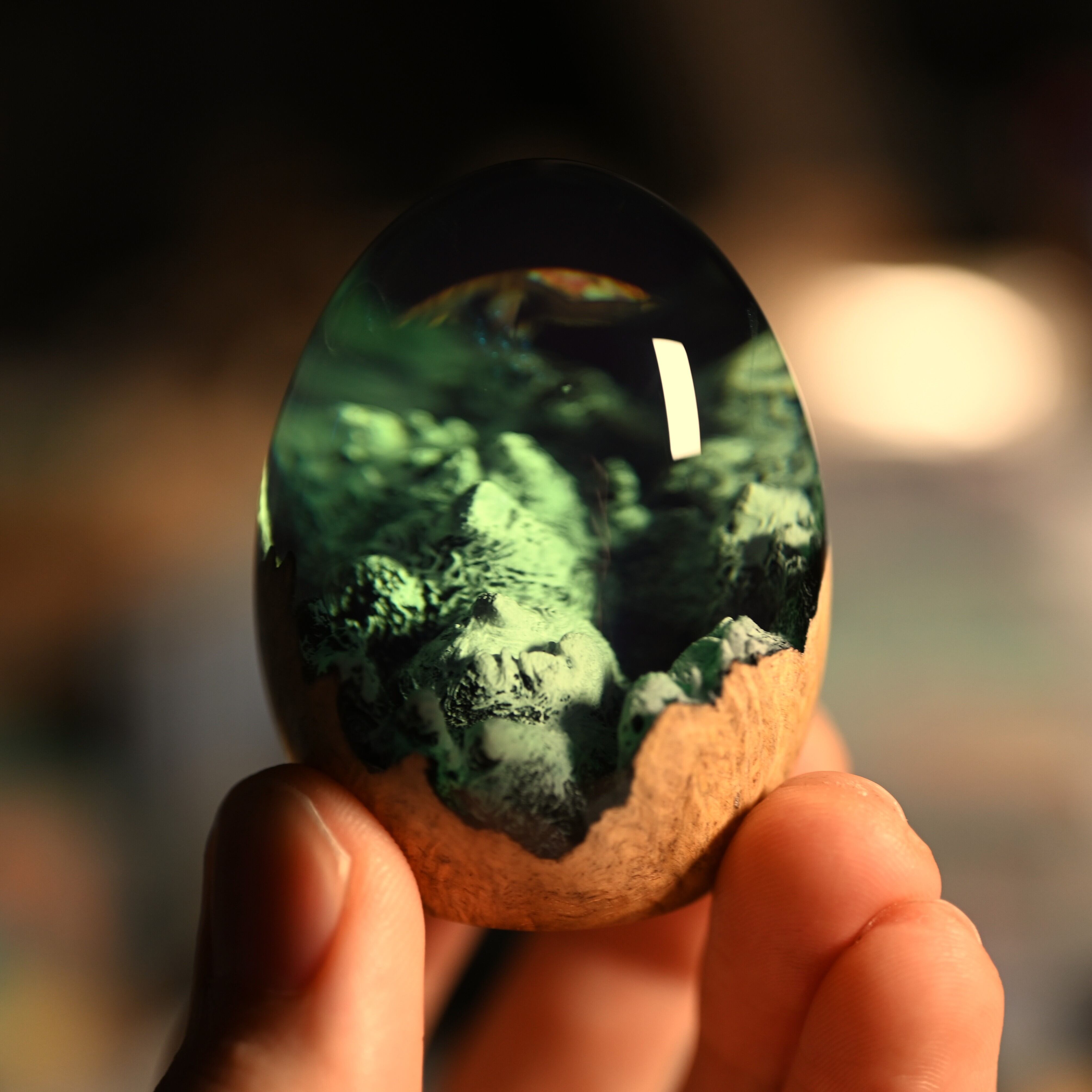 作品内部は景色をイメージし製作しており、より鮮明に魅せるためレジンの透明度と艶にこだわって仕上げました。