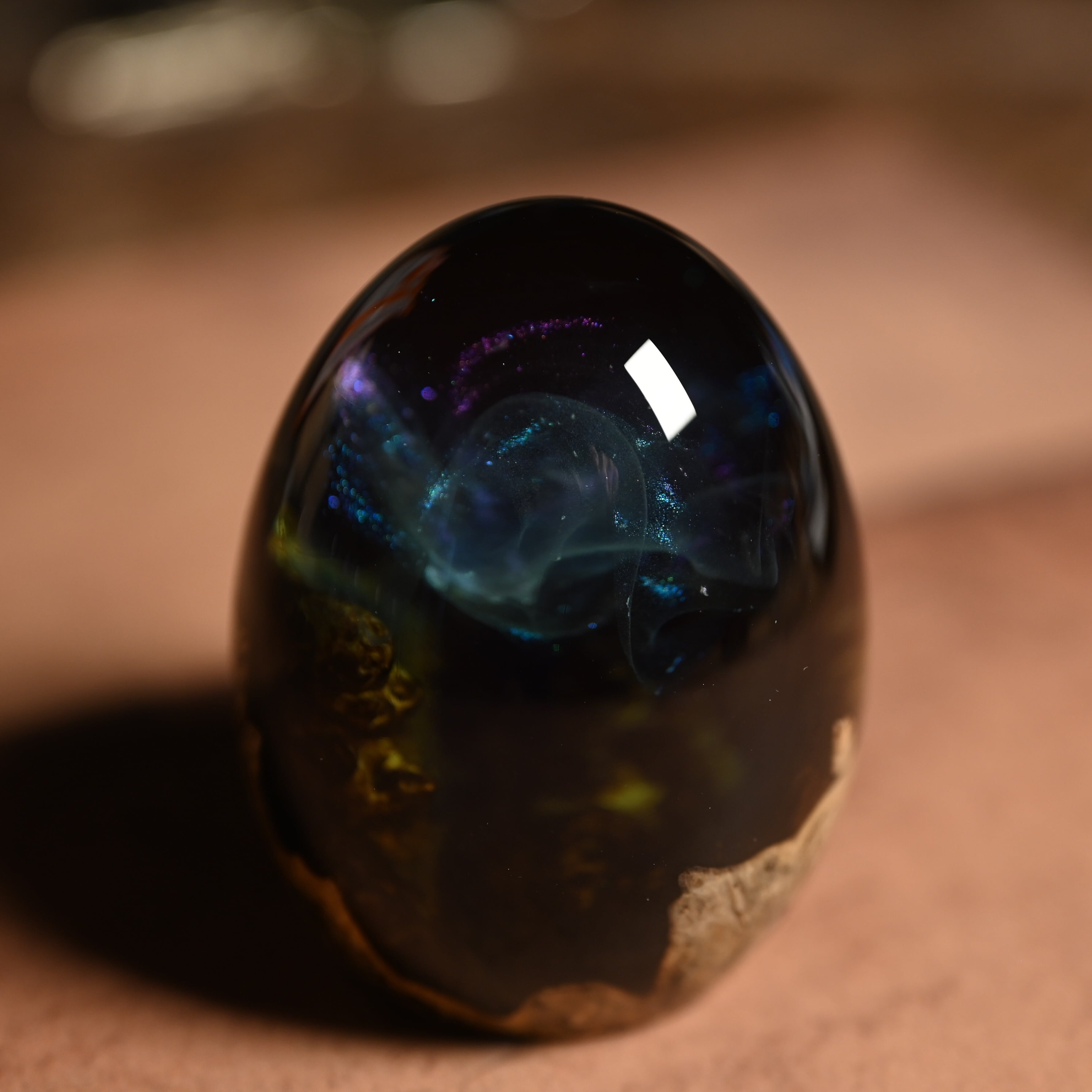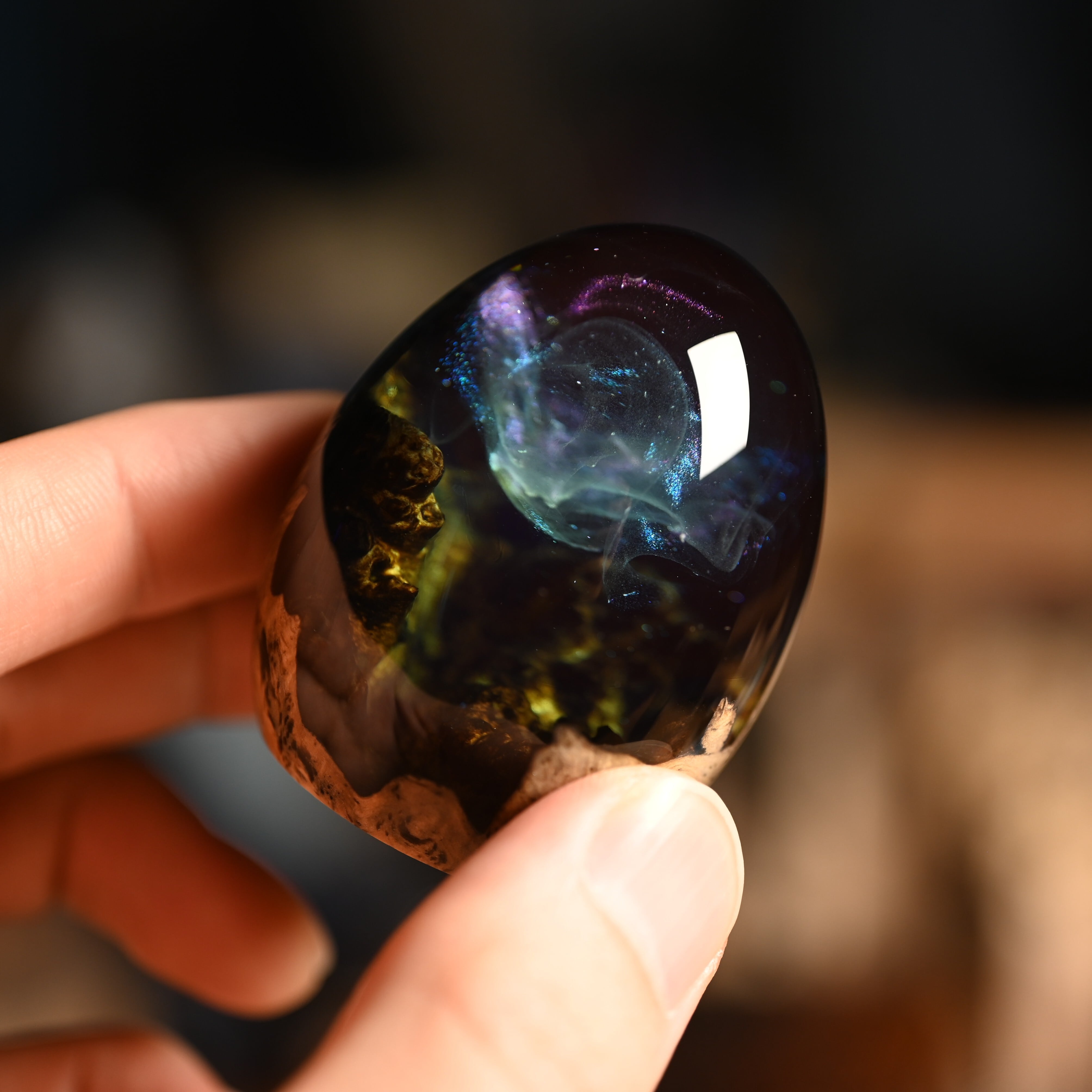 作品内部は景色をイメージし製作しており、より鮮明に魅せるためレジンの透明度と艶にこだわって仕上げました。