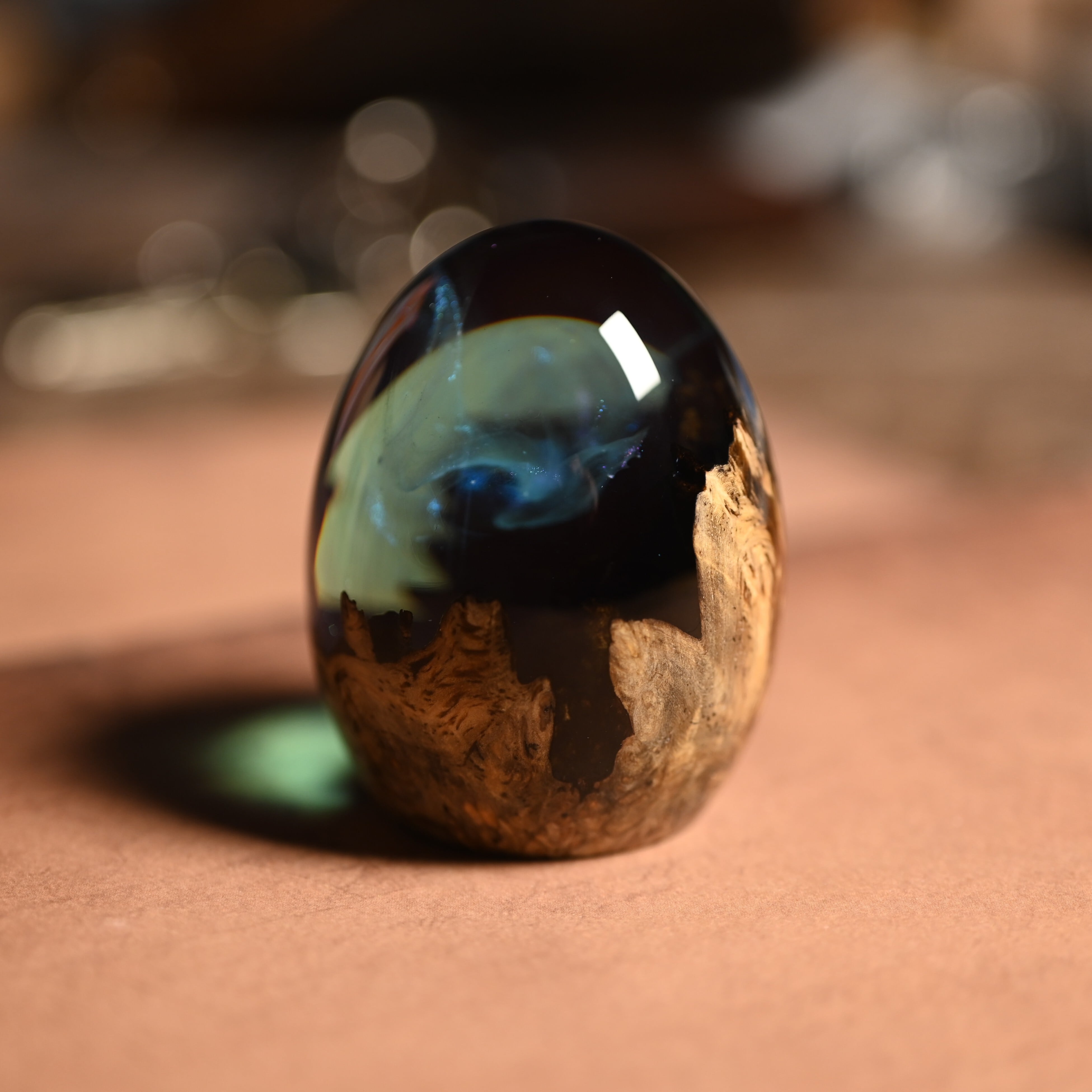 木と樹脂を組み合わせ1つ1つ手作りで仕上げた卵形オブジェ(ペーパーウェイト)になります。