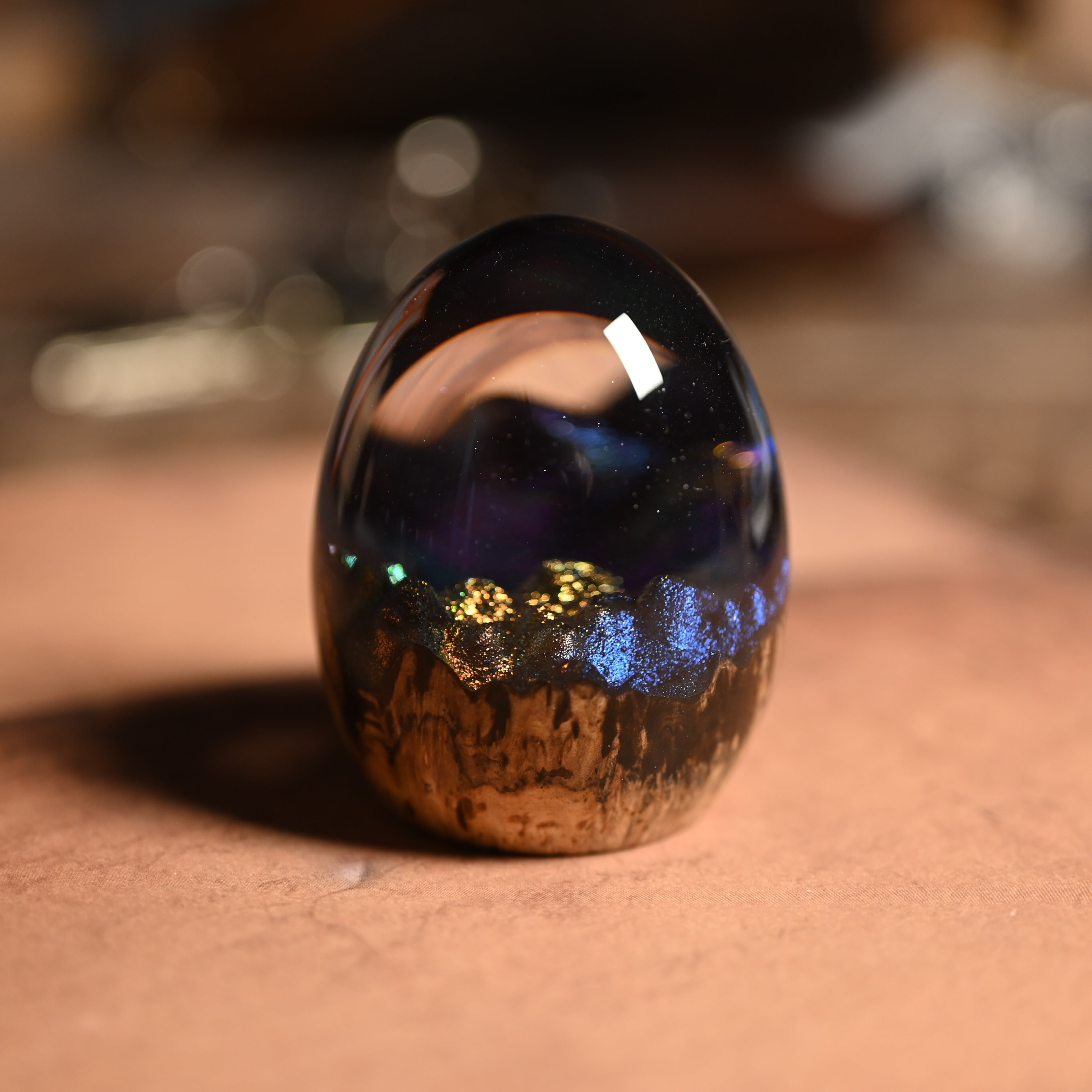 木と樹脂を組み合わせ1つ1つ手作りで仕上げた卵形オブジェ(ペーパーウェイト)になります。