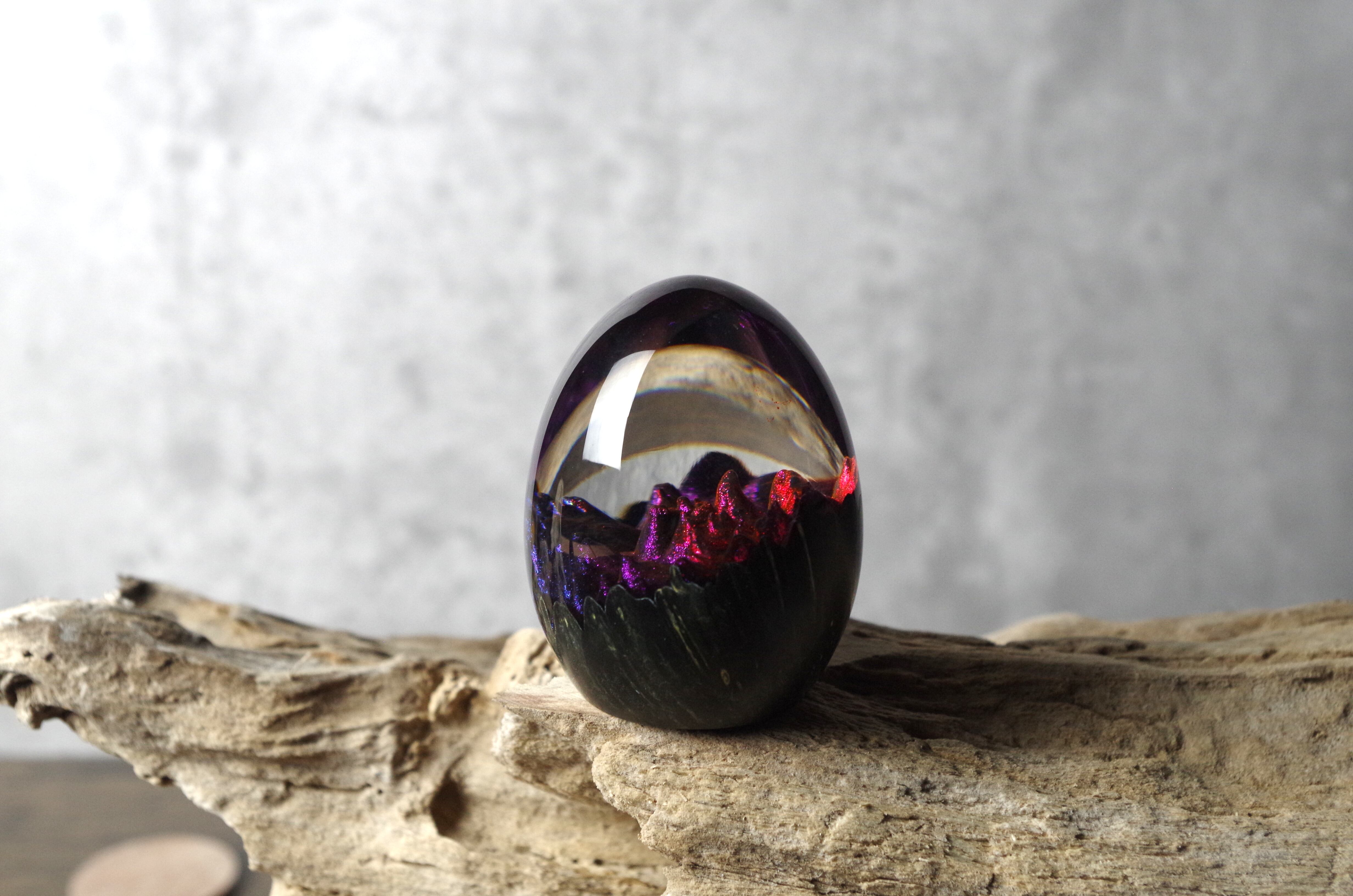 高透明、高強度の2液性のエポキシ樹脂を極限まで磨き上げた卵形オブジェ(ペーパーウェイト)になります。