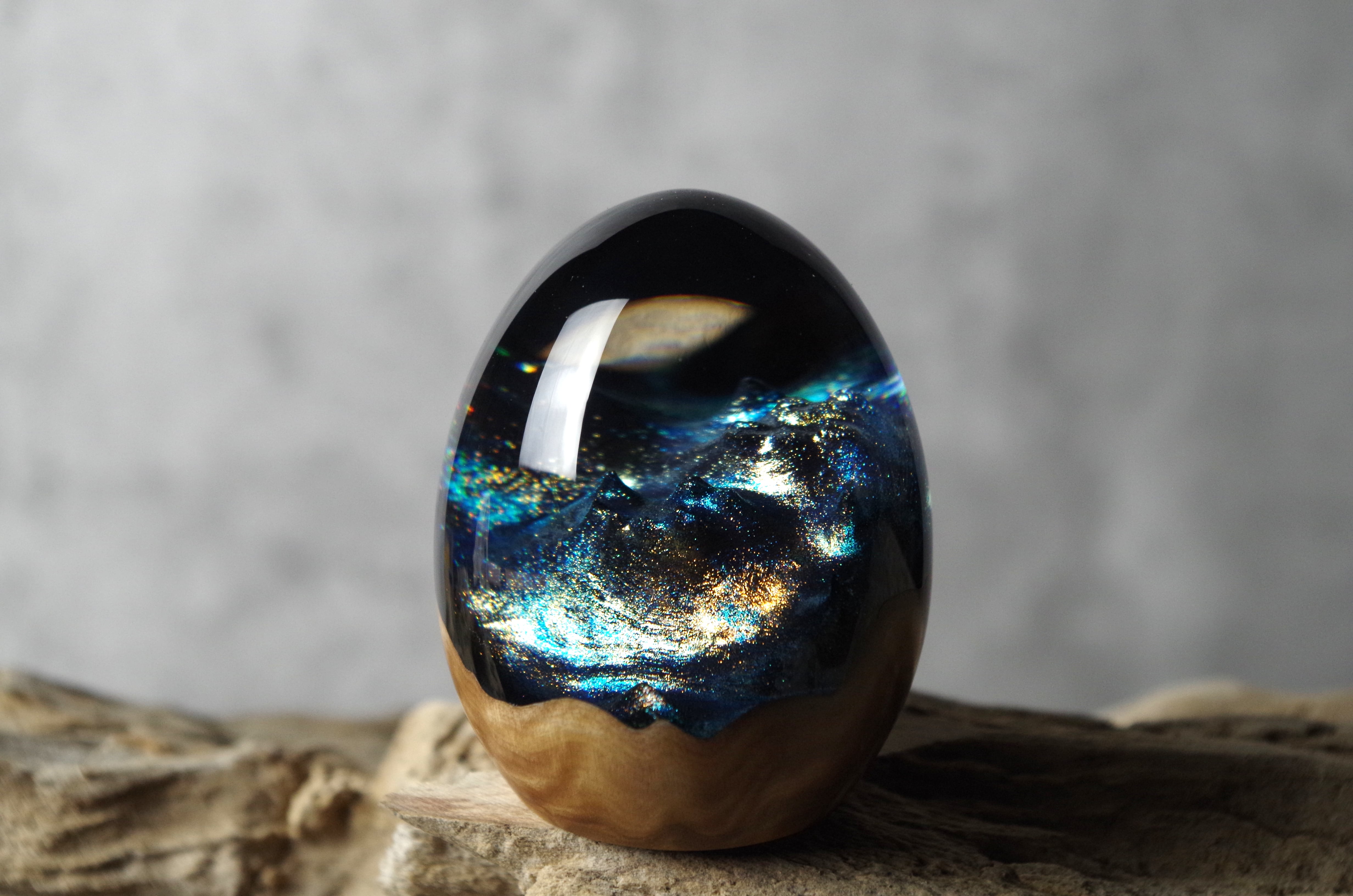 高透明、高強度の2液性のエポキシ樹脂を極限まで磨き上げた卵形オブジェ(ペーパーウェイト)になります。