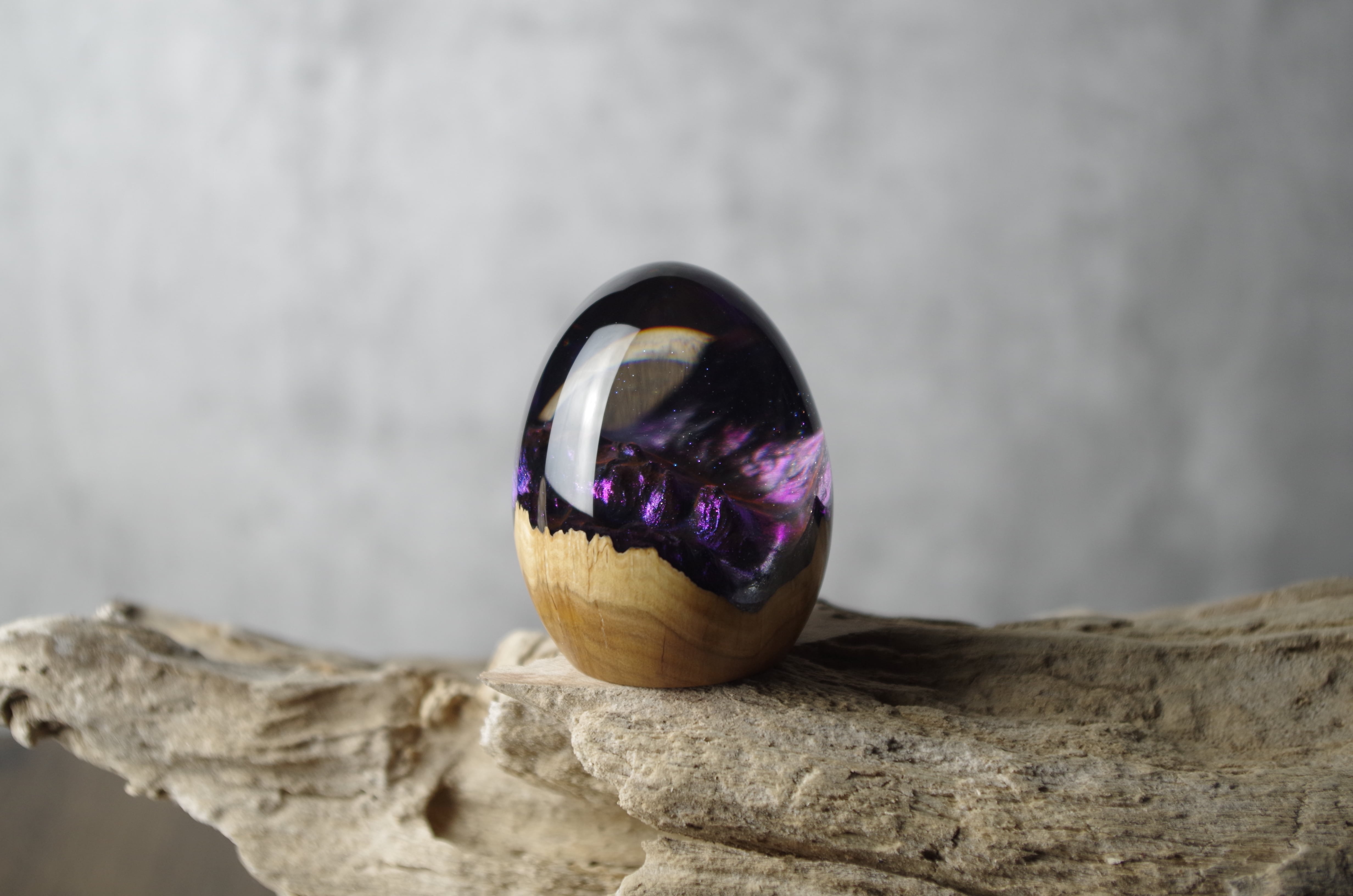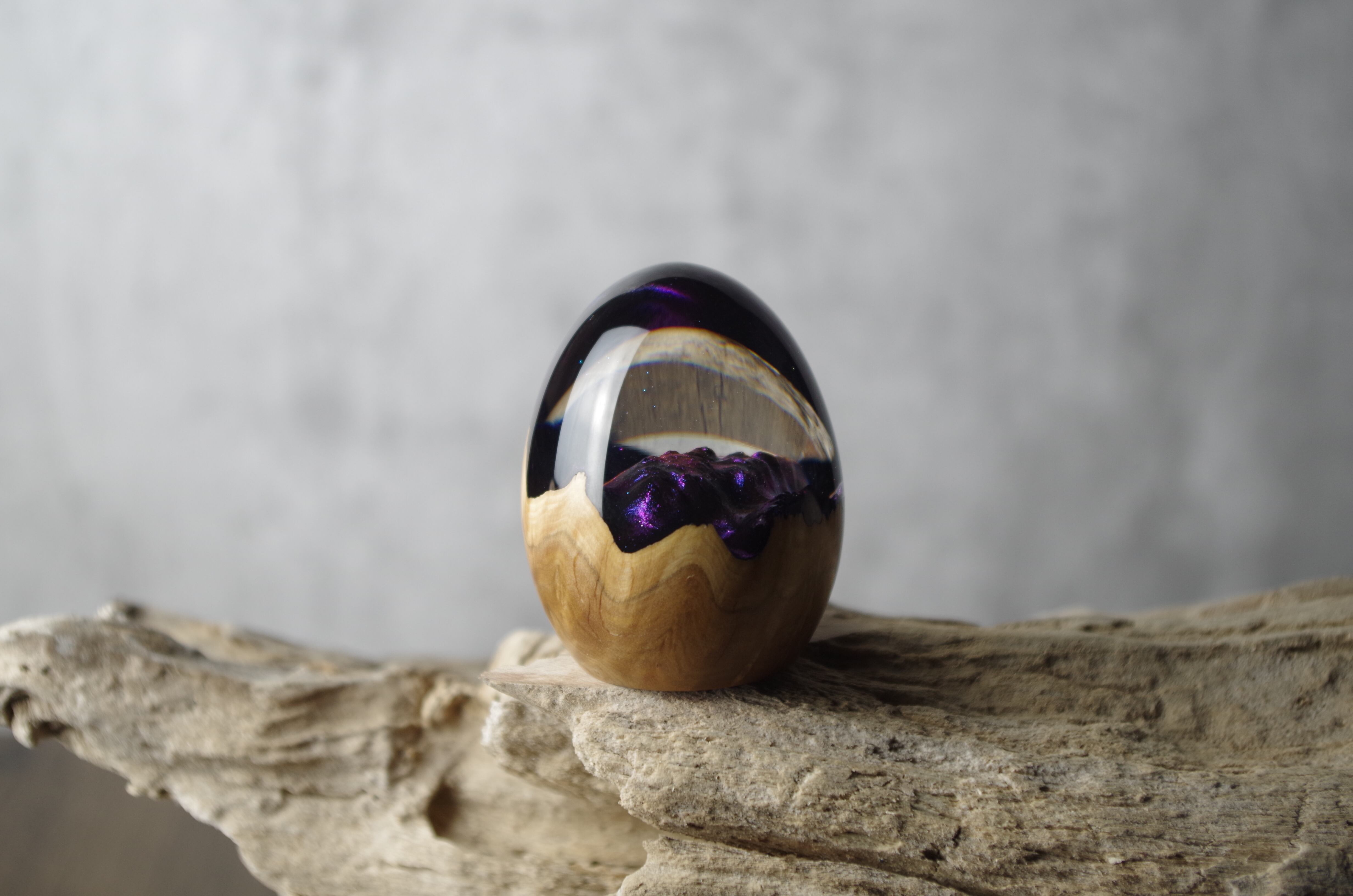 高透明、高強度の2液性のエポキシ樹脂を極限まで磨き上げた卵形オブジェ(ペーパーウェイト)になります。