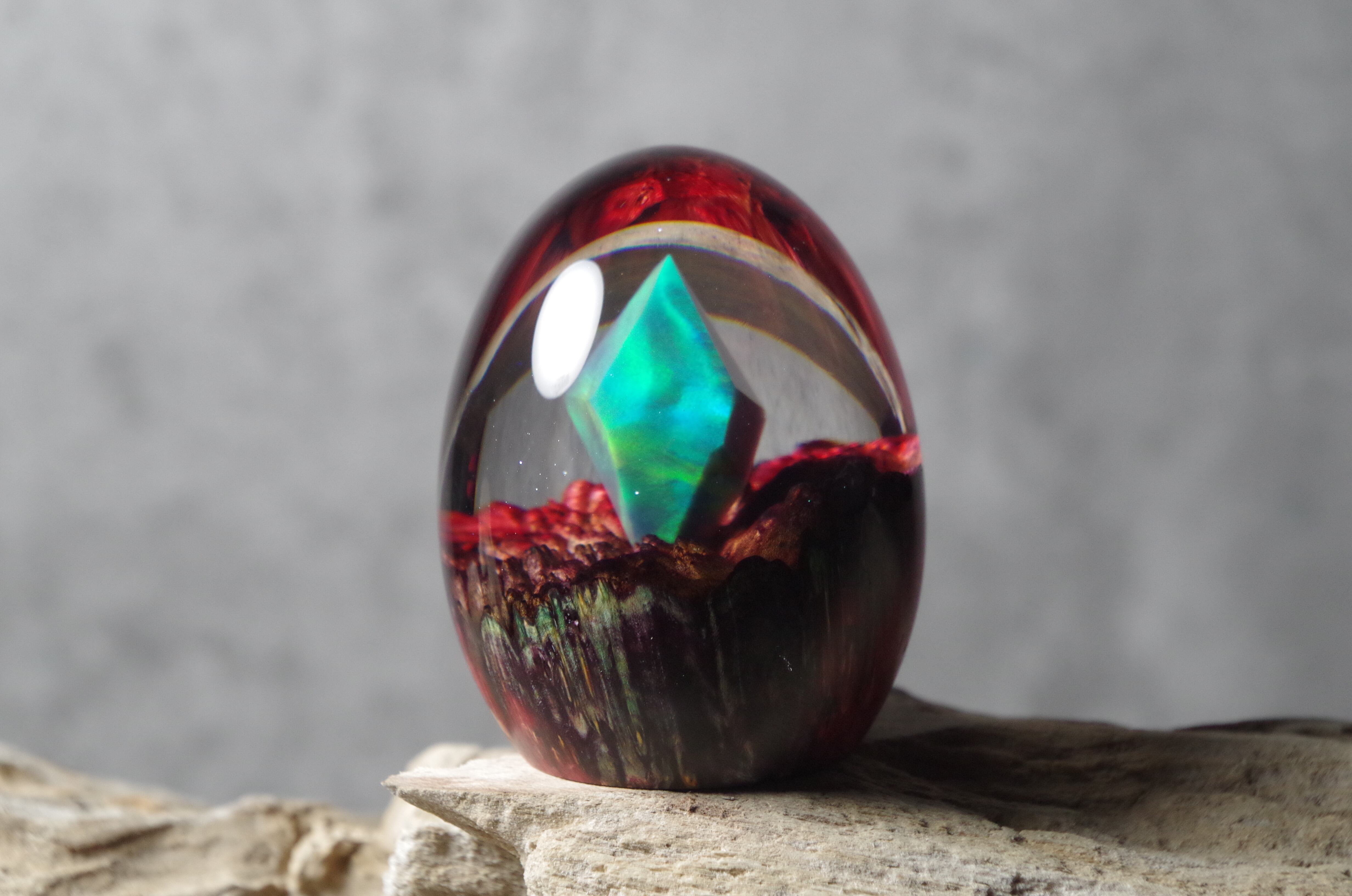 高透明、高強度の2液性のエポキシ樹脂を極限まで磨き上げた卵形オブジェ(ペーパーウェイト)になります。