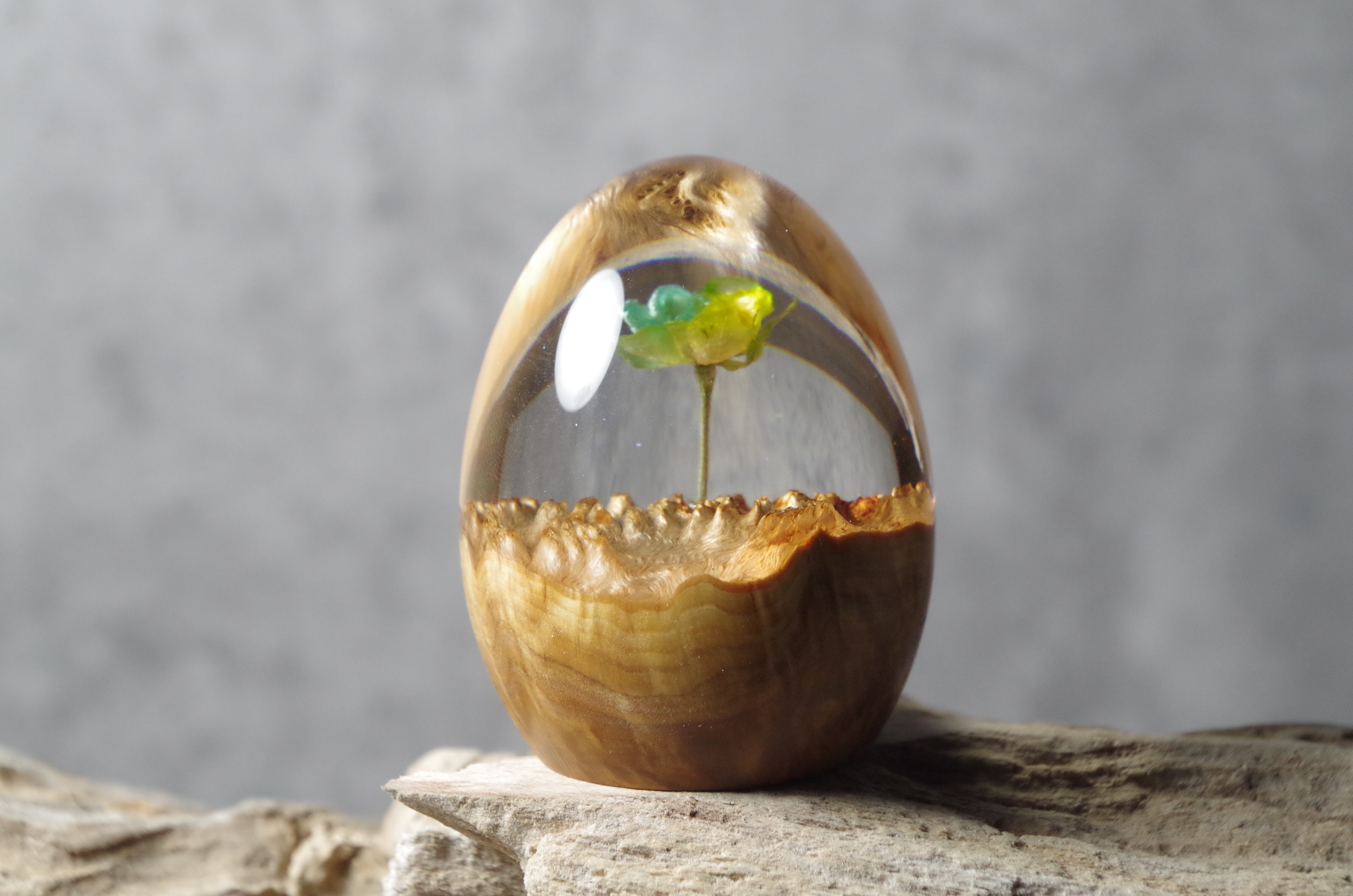 高透明、高強度の2液性のエポキシ樹脂を極限まで磨き上げた卵形オブジェ(ペーパーウェイト)になります。