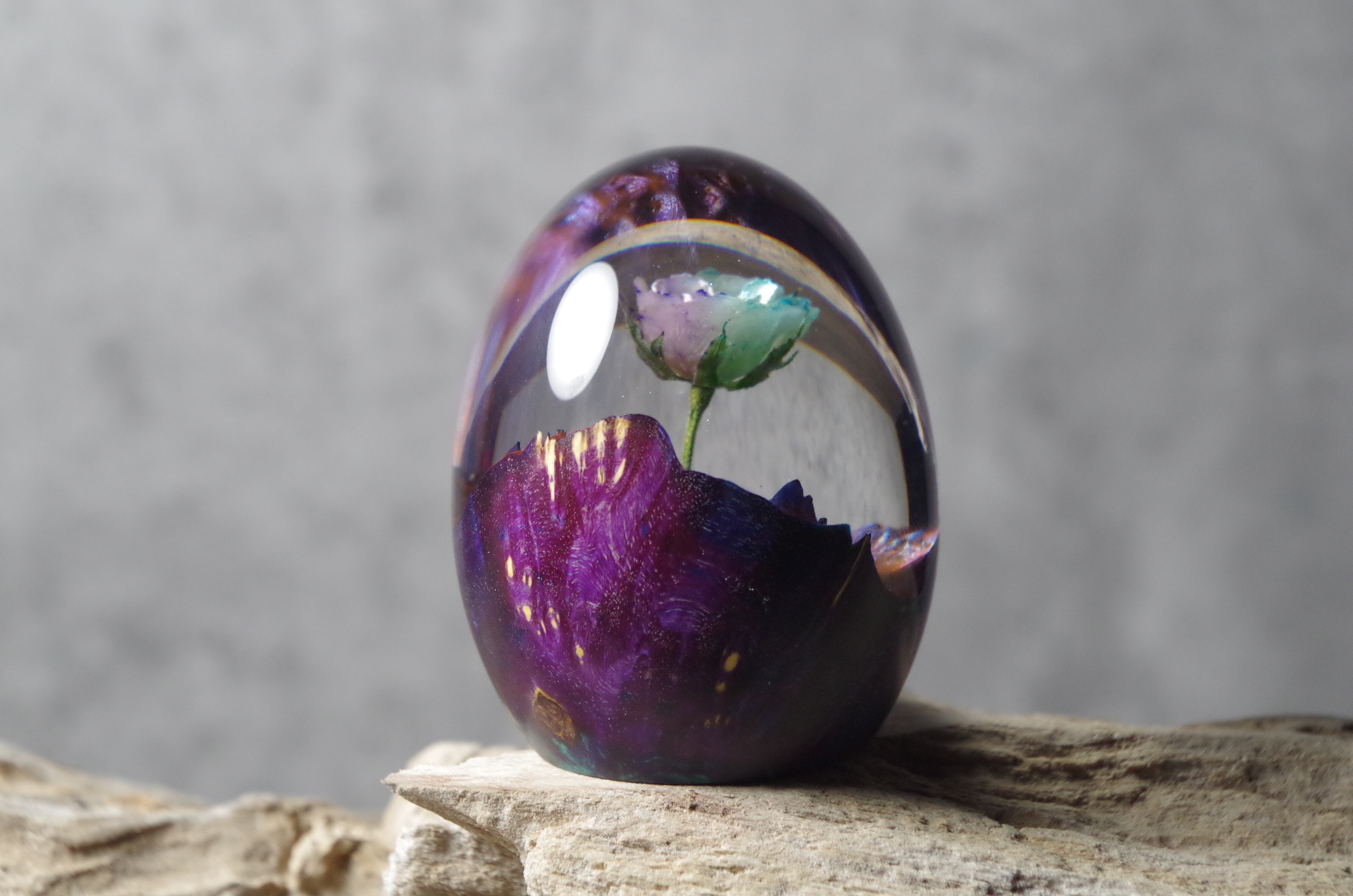 高透明、高強度の2液性のエポキシ樹脂を極限まで磨き上げた卵形オブジェ(ペーパーウェイト)になります。