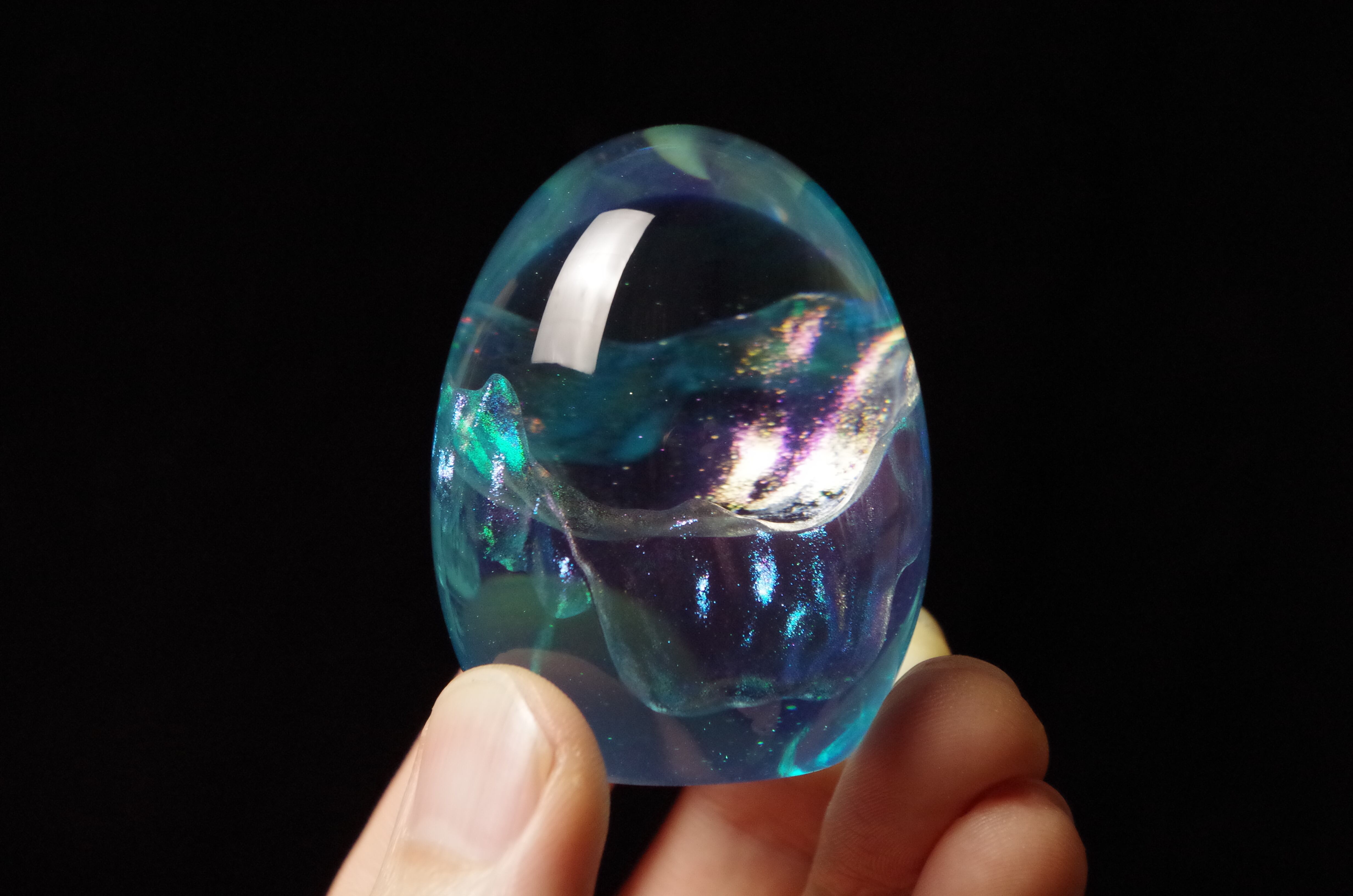 作品内部は景色をイメージし製作しており、より鮮明に魅せるためレジンの透明度と鏡面研磨にはこだわって仕上げました。