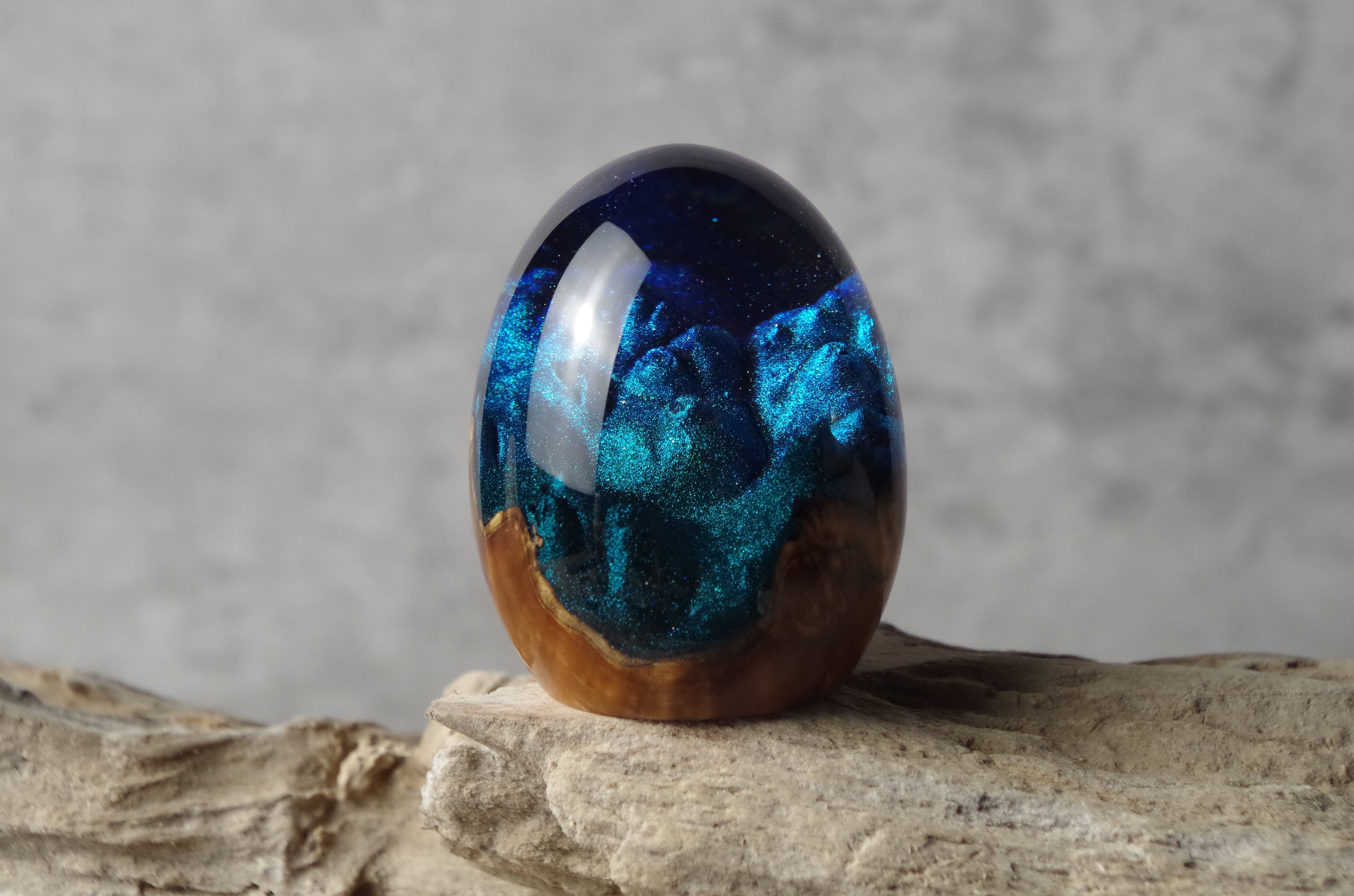 高透明、高強度の2液性のエポキシ樹脂を極限まで磨き上げた卵形オブジェ(ペーパーウェイト)になります。
