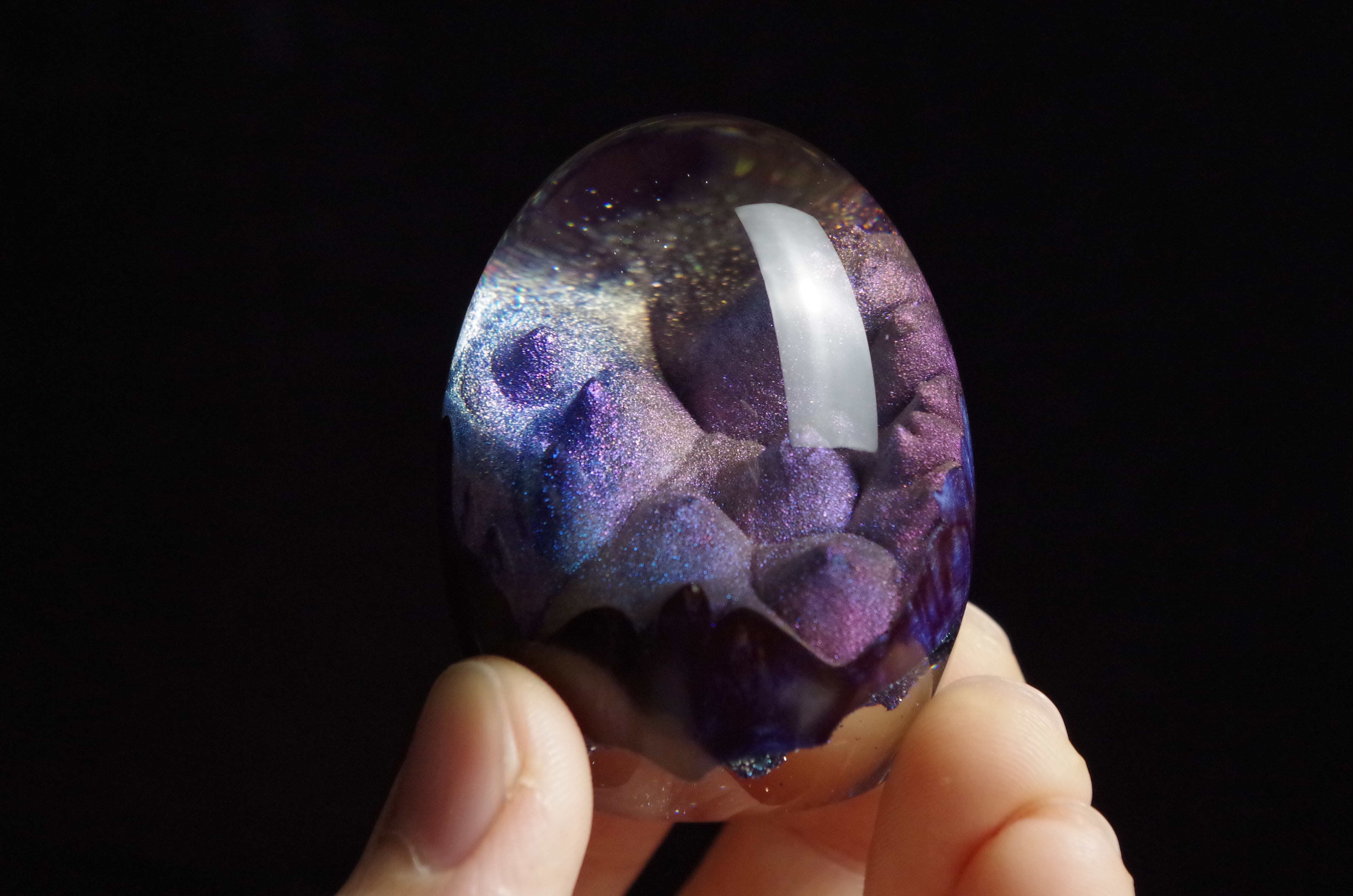 高透明、高強度の2液性のエポキシ樹脂を極限まで磨き上げた卵形オブジェ(ペーパーウェイト)になります。
