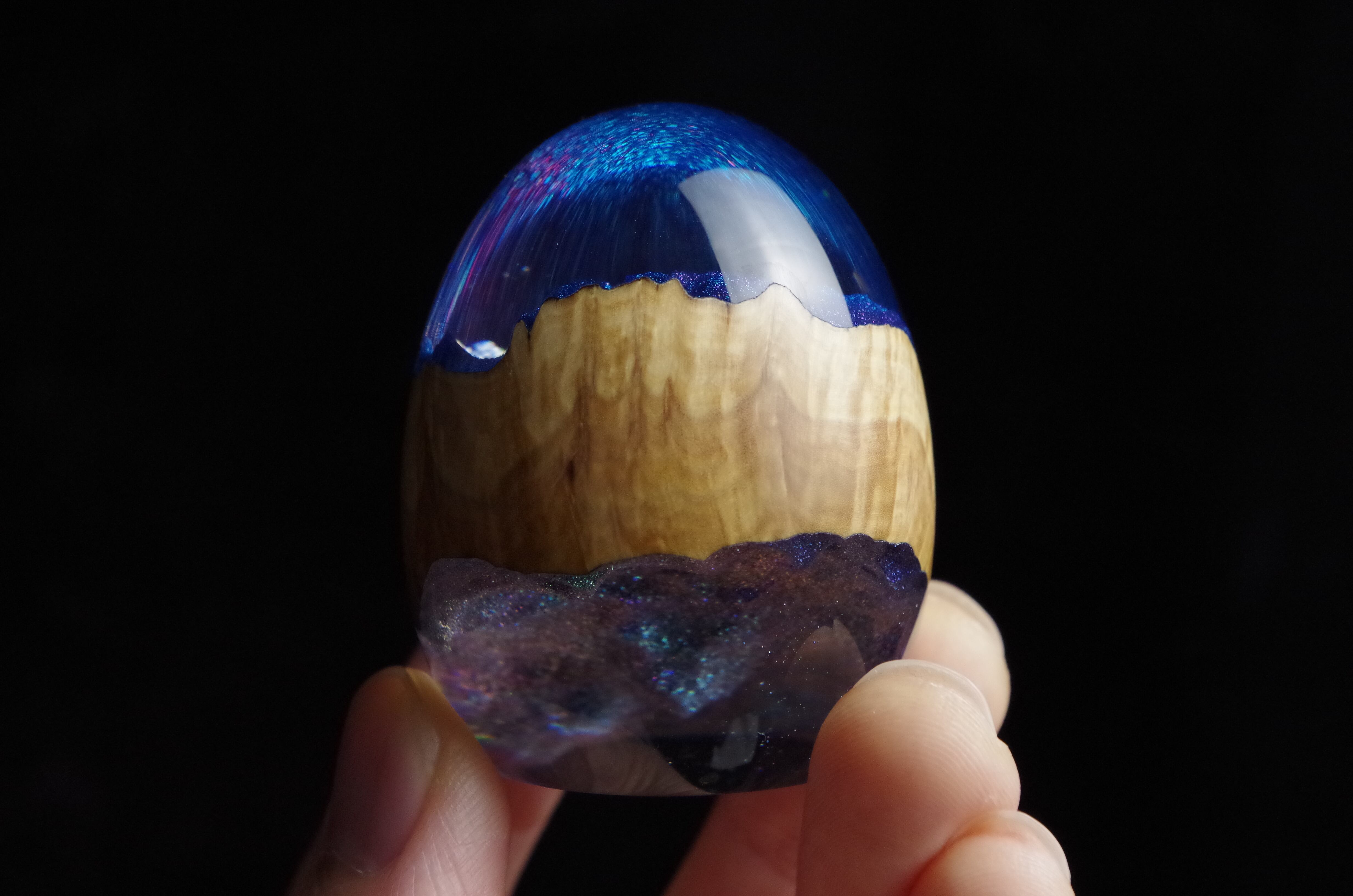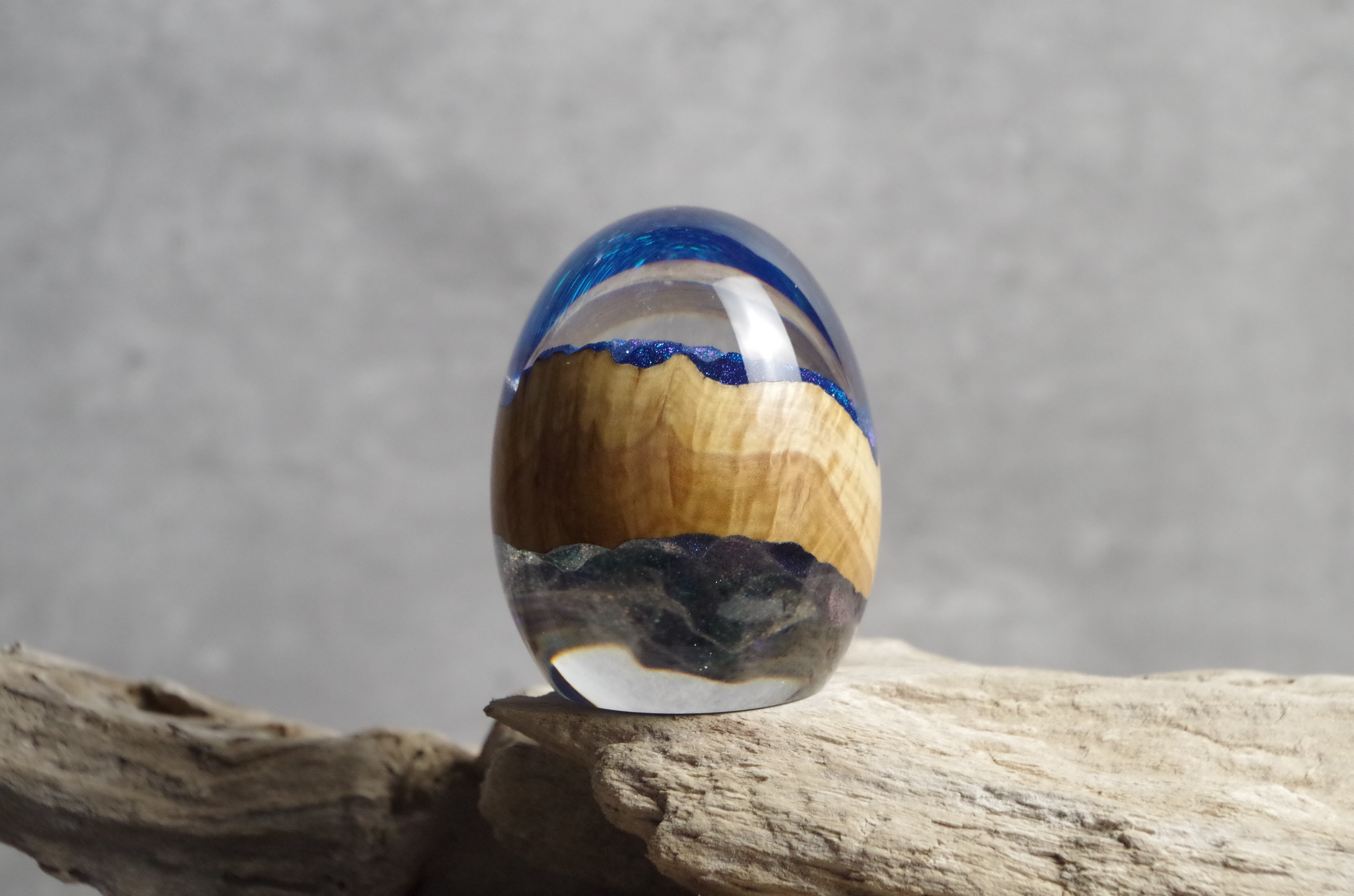 高透明、高強度の2液性のエポキシ樹脂を極限まで磨き上げた卵形オブジェ(ペーパーウェイト)になります。