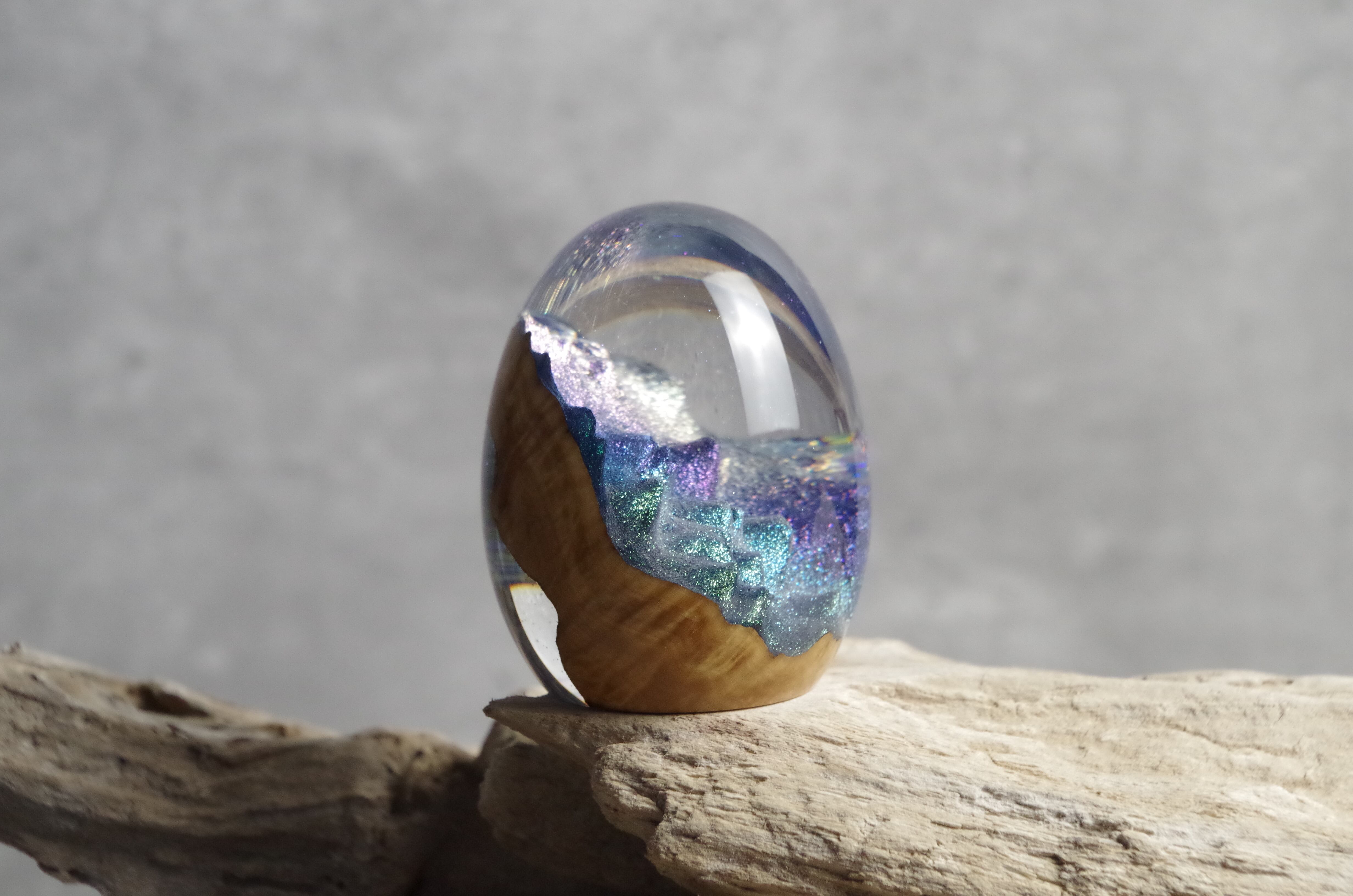 作品内部は景色をイメージし製作しており、より鮮明に魅せるためレジンの透明度と鏡面研磨にはこだわって仕上げました。