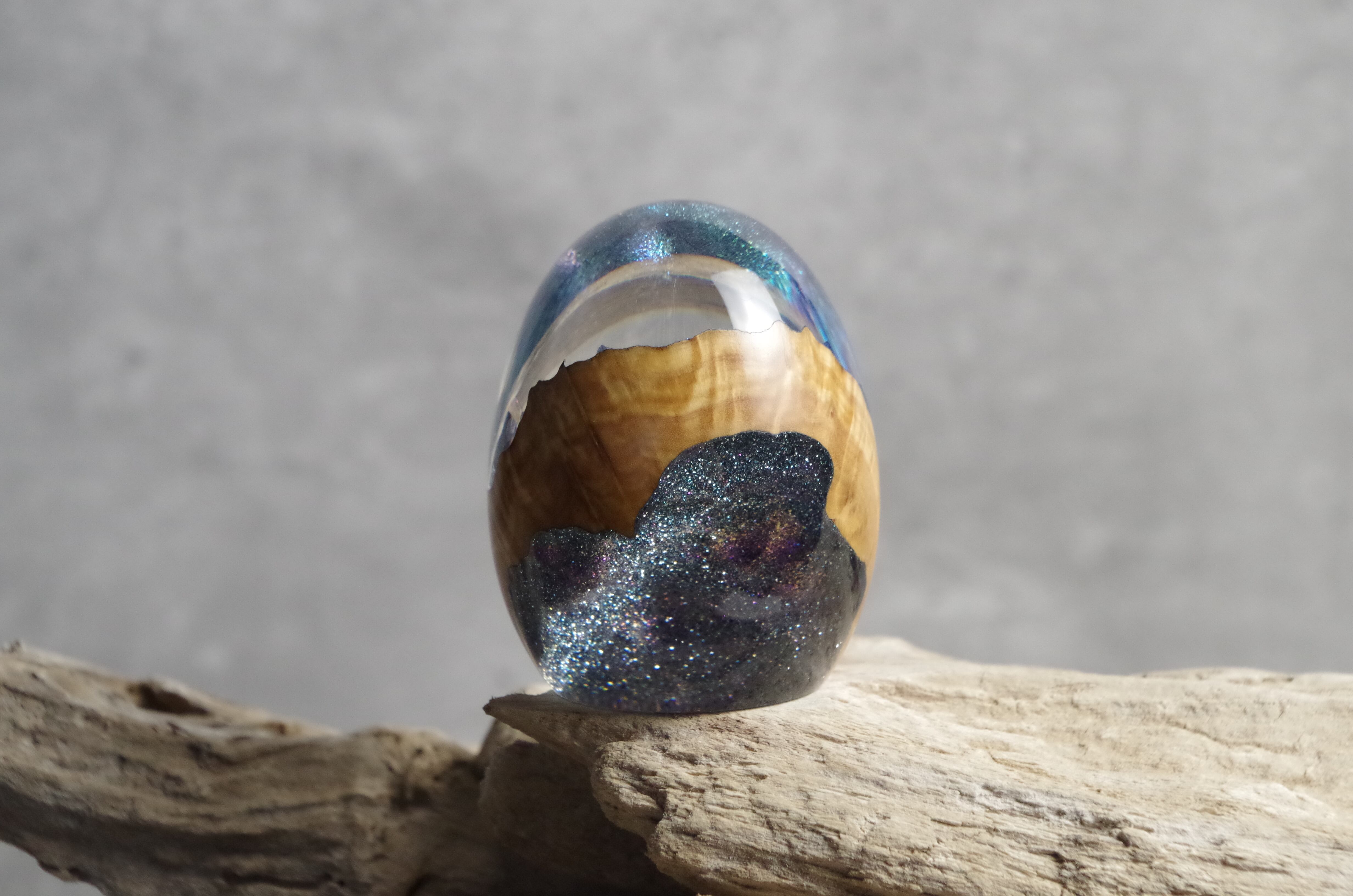 高透明、高強度の2液性のエポキシ樹脂を極限まで磨き上げた卵形オブジェ(ペーパーウェイト)になります。